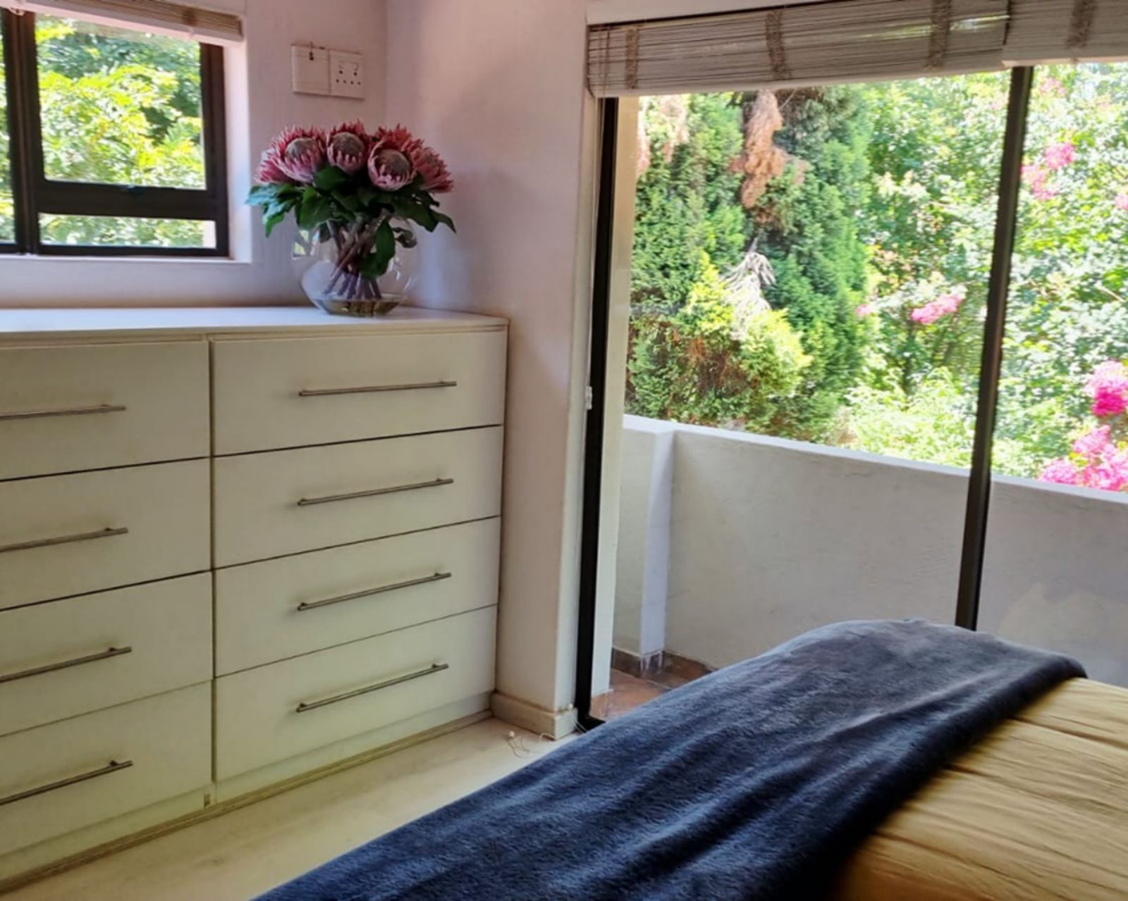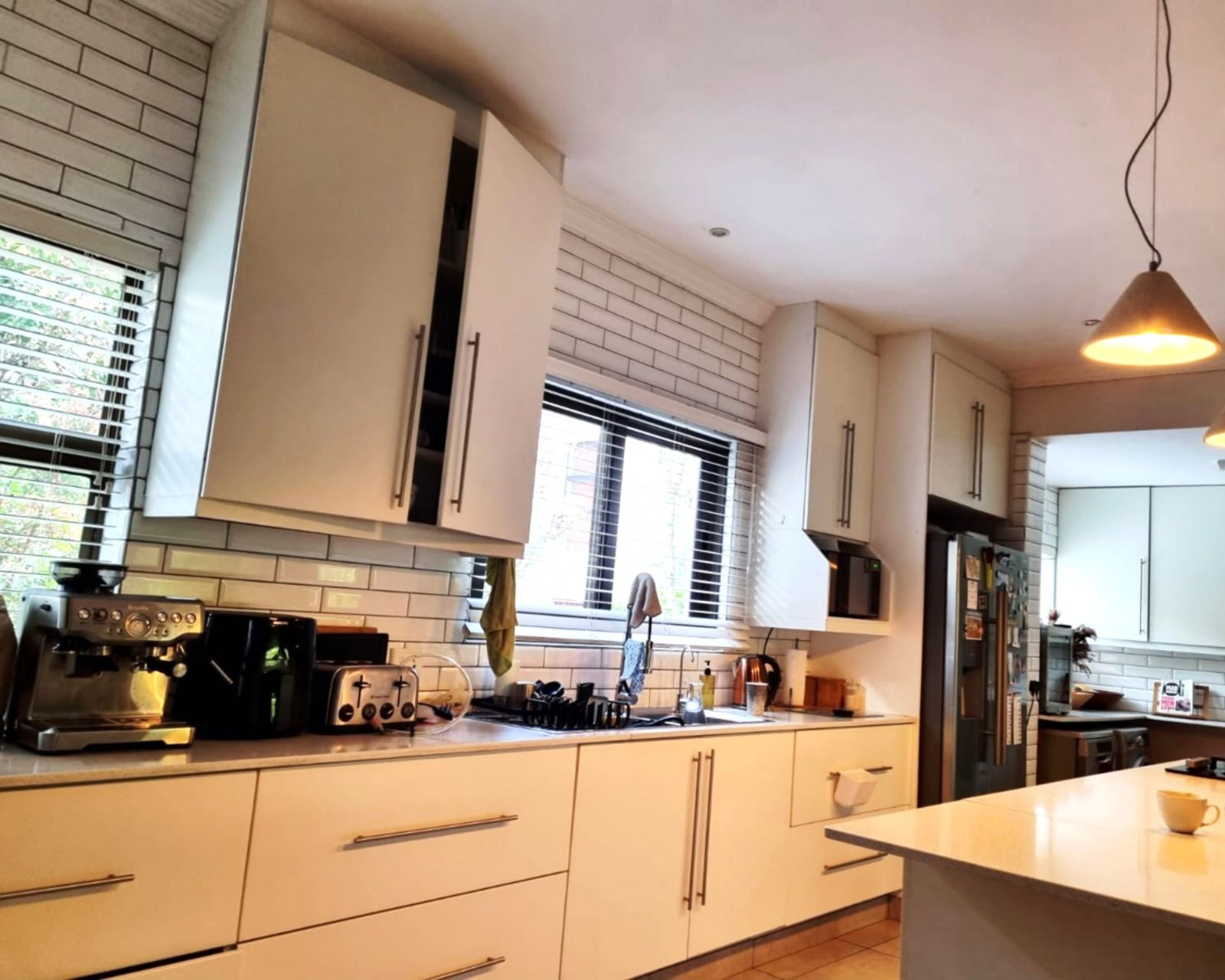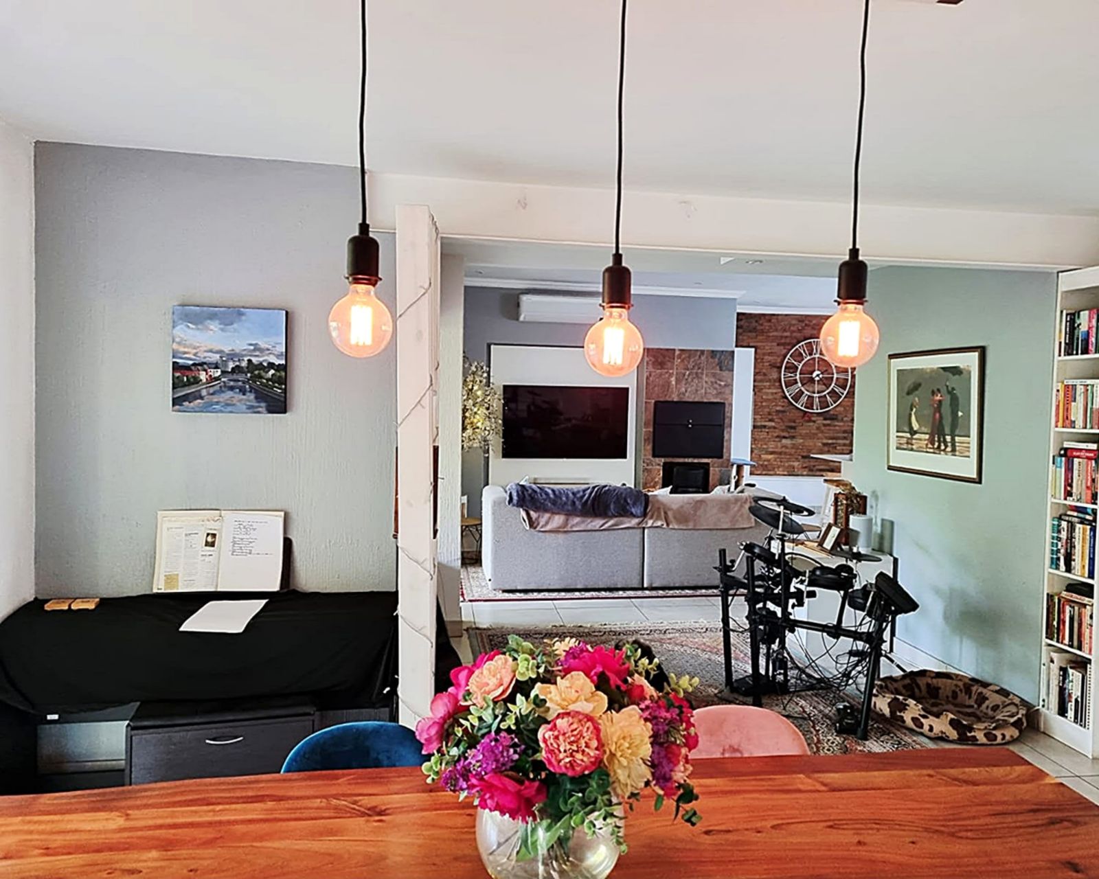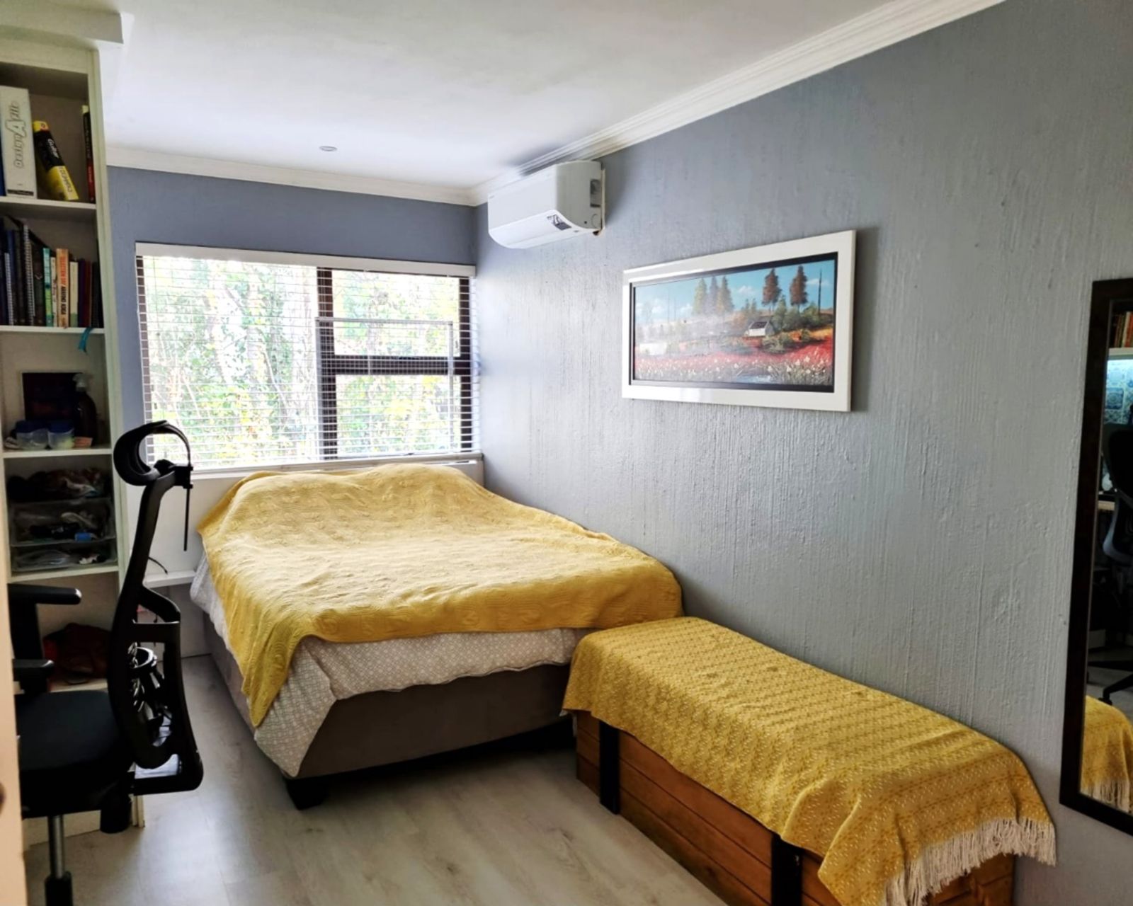 This is a modern 3-bedroom double story complex with a contemporary feel, open plan spaces and modern finishes that provides an abundance of storage space with plenty of cupboard space as you enter the home at the front door ideal to store yours and your guests’ shoes, hats, jackets or sports equipment. This incredible home features air-conditioned rooms with built-in cupboards, wooden flooring and an abundance of natural light. Each room has quality custom blinds, so no curtains are needed. There are two bedrooms upstairs, the main bedroom and 2nd bedroom is en-suite, while the second bedroom has a built-in bookshelf and built-in desk with cabinets. As you make your way downstairs you are welcomed by a third bedroom that has been converted into an office space and consists of a built-in table with bookshelf on the top as well as built-in cupboards so one can use this as bedroom that can accommodate a double bed, or if you have kids and would like to add bunk beds.