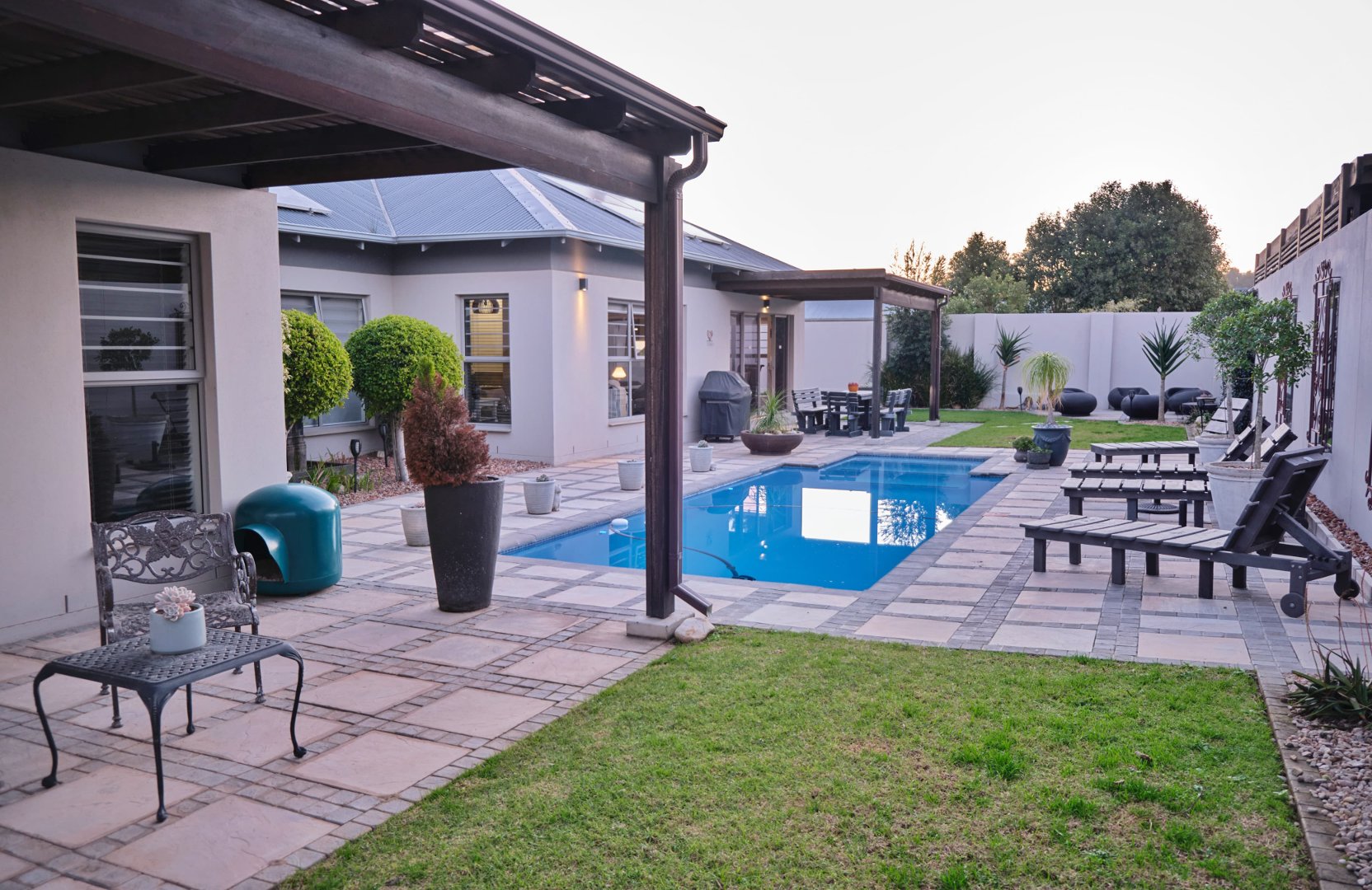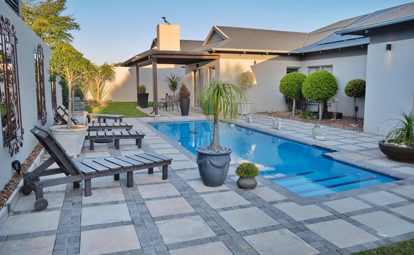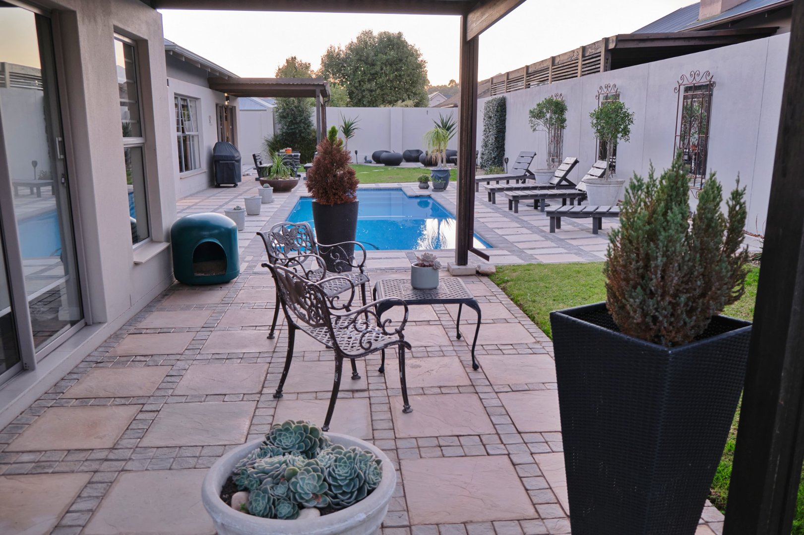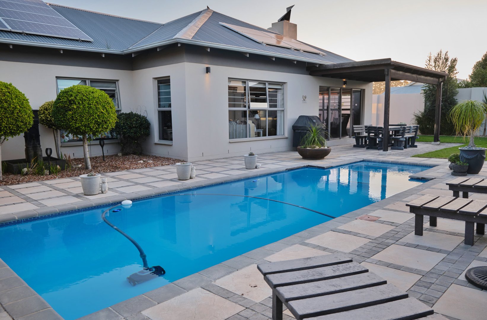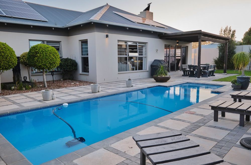 Entrance hall, 4 Bedrooms, 3 Bathrooms, Open-plan kitchen (with scullery and pantry), Dining area, Lounge, Pyjama lounge (currently used as a study), Indoor Braai room, Large swimming pool (chlorinated, with heat pump)