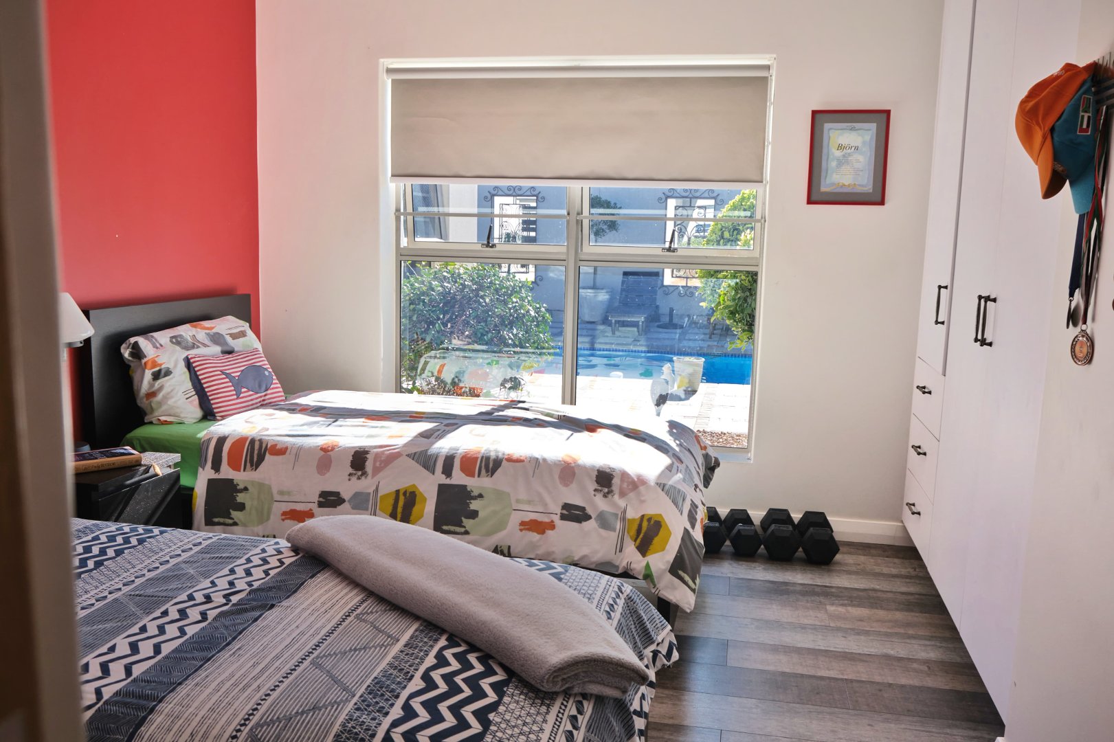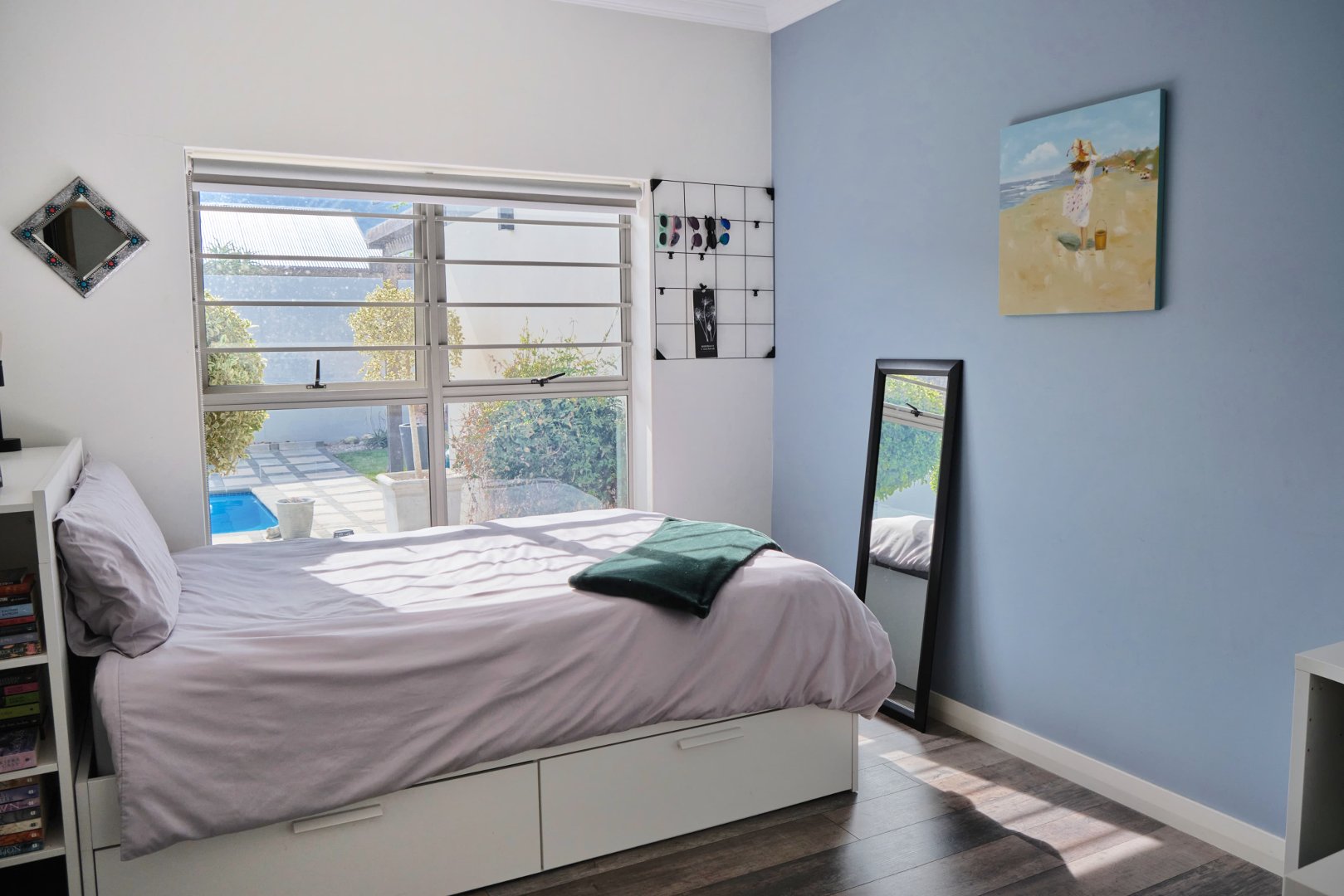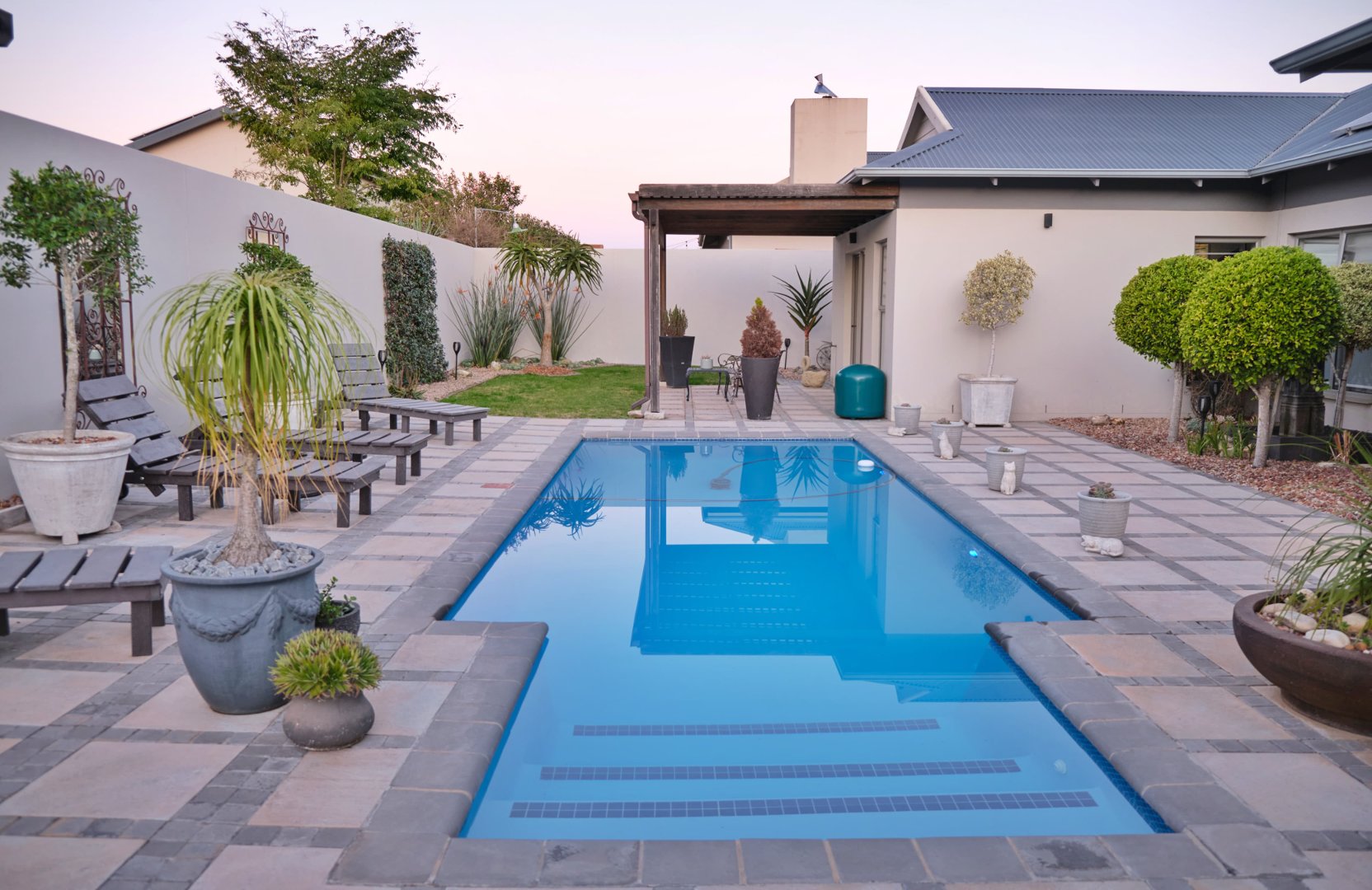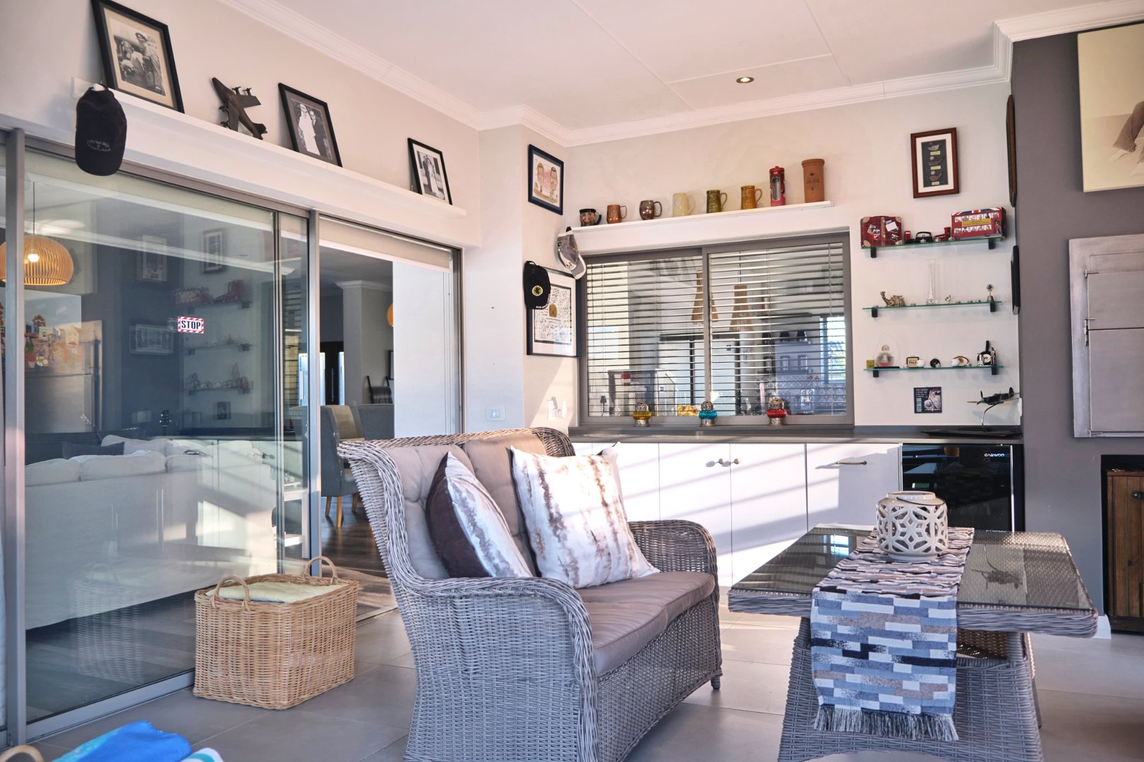 Entrance hall, 4 Bedrooms, 3 Bathrooms, Open-plan kitchen (with scullery and pantry), Dining area, Lounge, Pyjama lounge (currently used as a study), Indoor Braai room, Large swimming pool (chlorinated, with heat pump)