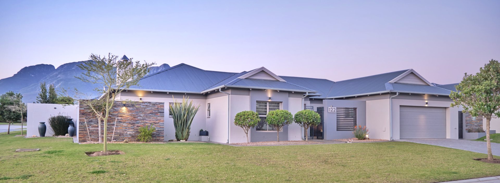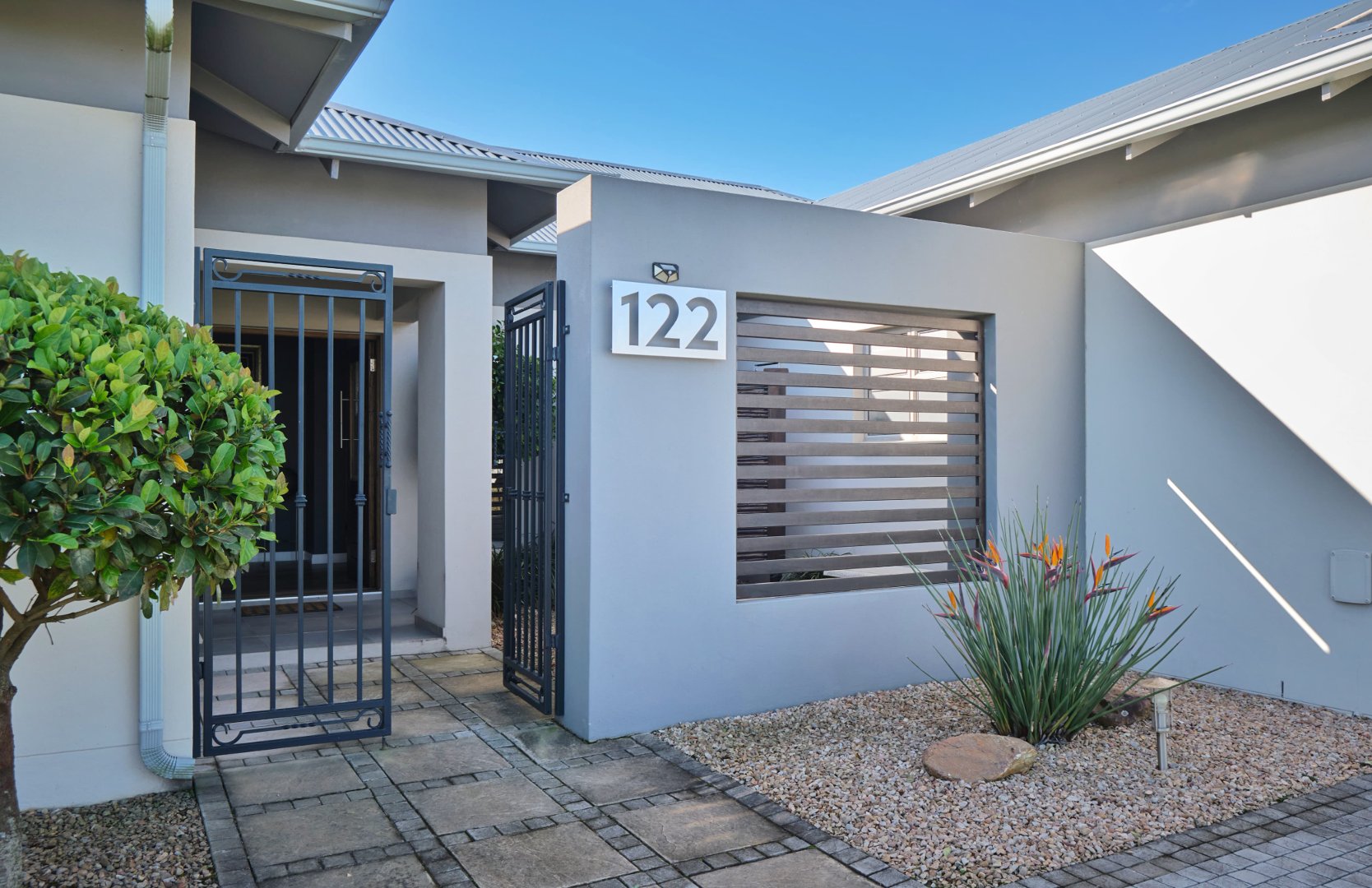 Contemporary single-storey home on a corner stand featuring: