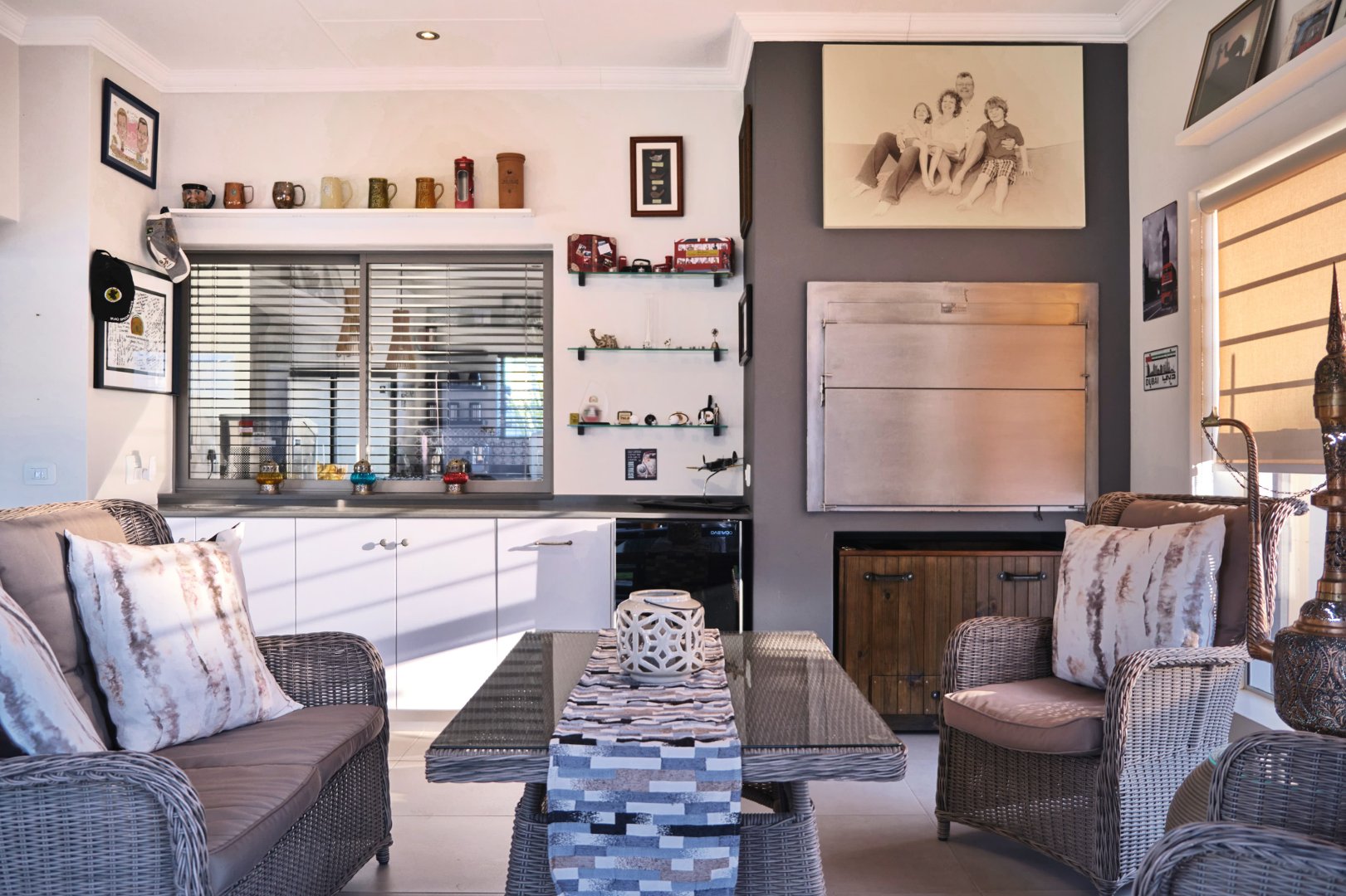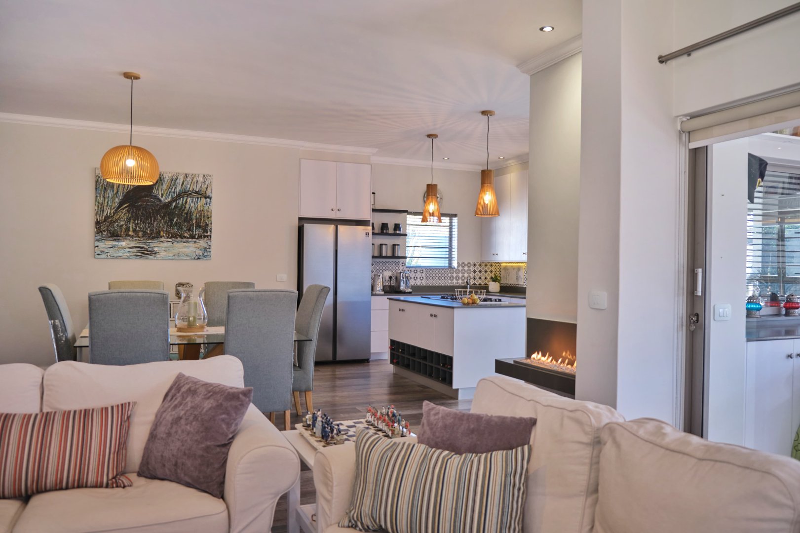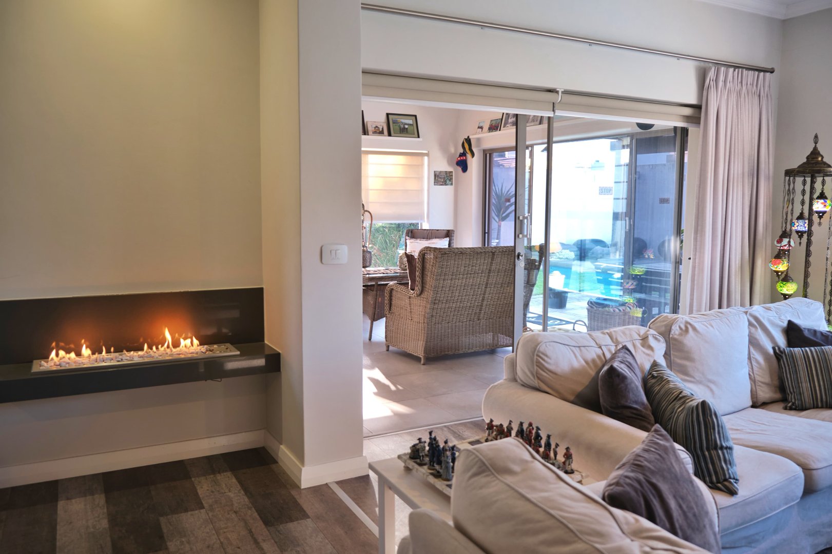 The inviting foyer opens into spacious living areas, seamlessly connecting the open-plan kitchen, dining, and lounge, which flow into the Braai room complete with a covered pergola, perfect for entertaining. A cozy gas fireplace adds warmth. Off the dining area, the 4th bedroom (no built-in-cupboards) serves as a kids' TV lounge, while to the right are three additional bedrooms and a pyjama lounge that currently functions as a study. The main bedroom boasts an ensuite with an open bath and shower, plus private access to the garden and pool.