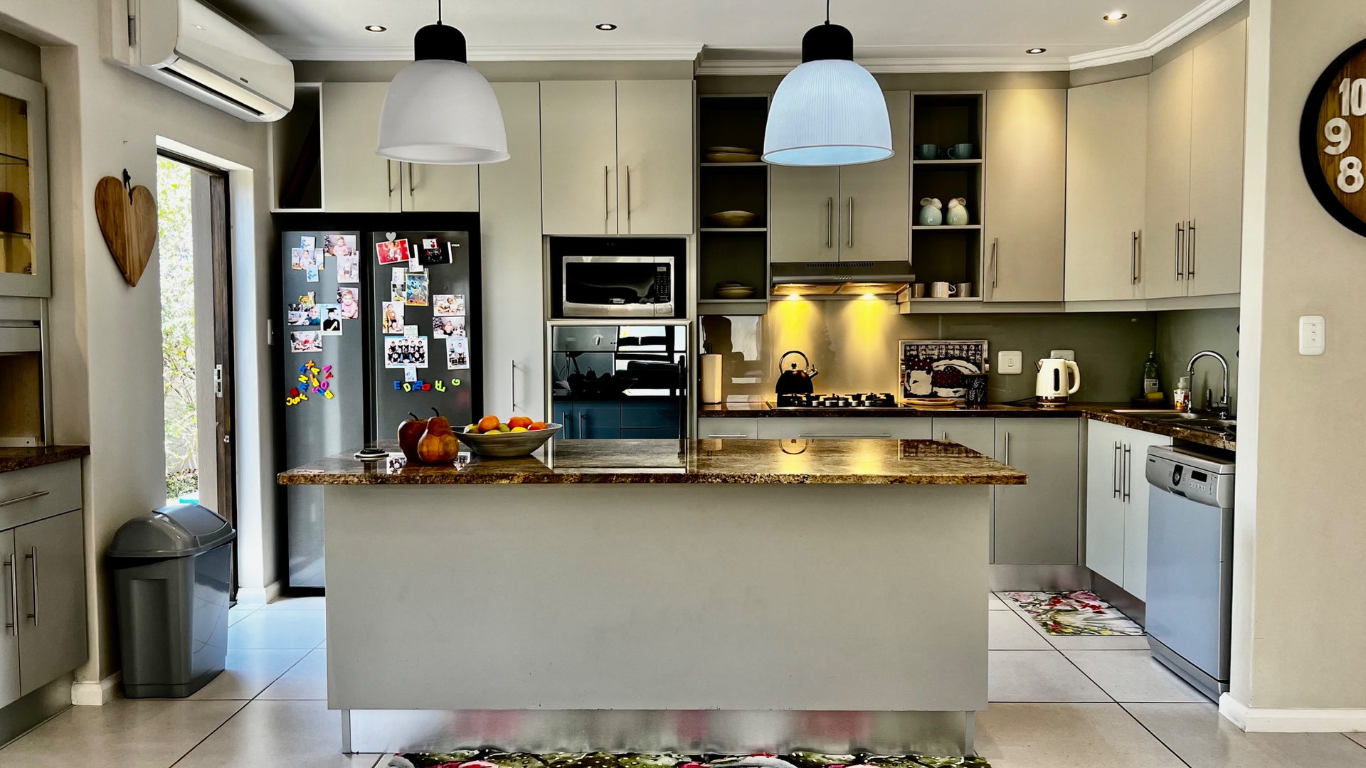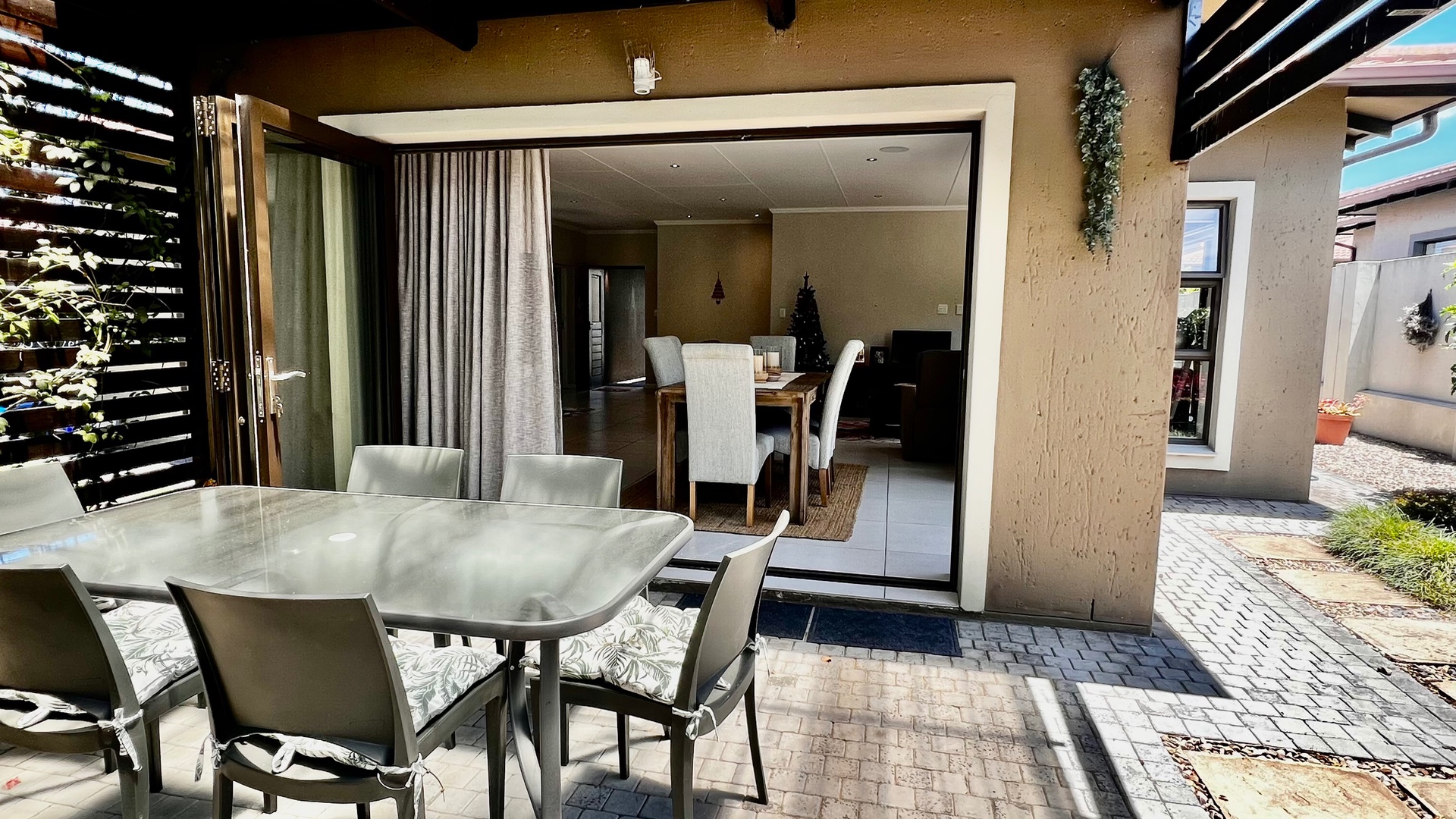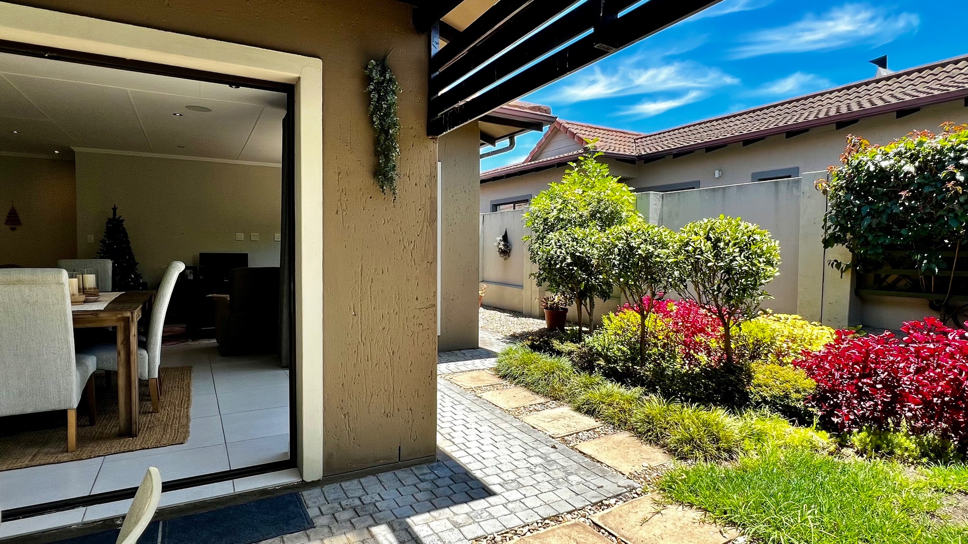 The stylish kitchen is a standout featuring granite countertops, feature cupboards, soft display lighting, and a central island that anchors the open-plan layout — perfect for family living or effortless entertaining. Modern tiles flow throughout the home, including the garage, which offers ample built-in cupboards and is plumbed for a washing machine. The spacious living area includes an indoor braai that can double as a fireplace in winter, creating a warm and inviting atmosphere year-round. Stack doors open seamlessly onto an undercover patio, ideal for all-season entertaining, and lead to a private, enclosed garden—perfect for children, pets, or relaxed outdoor enjoyment. All three bedrooms are well-sized and carpeted, providing comfortable retreats, with the main bedroom featuring an en-suite bathroom. Convenience continues with a double garage offering direct access to the home, while practical extras such as a plumbed and pumped water tank with a linked filtration system, a gas geyser, and an air-conditioning unit ensure comfort and efficiency throughout the year.