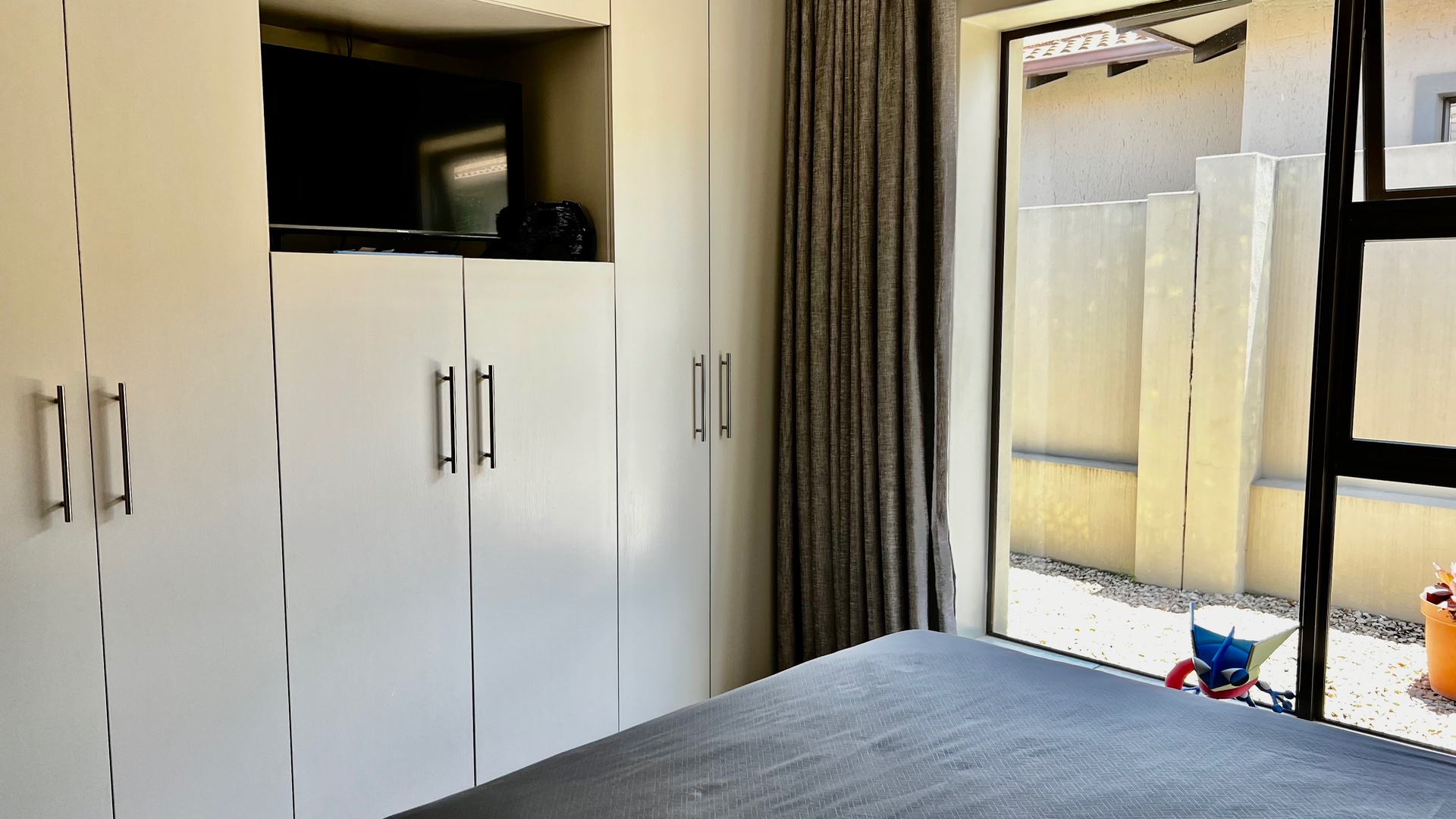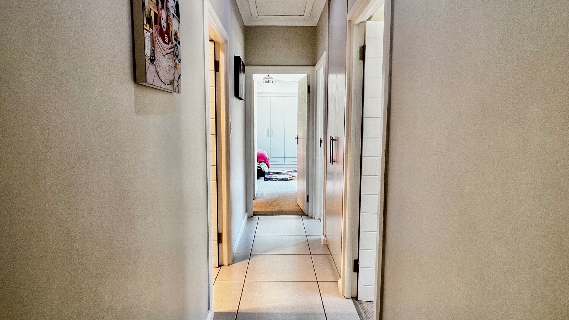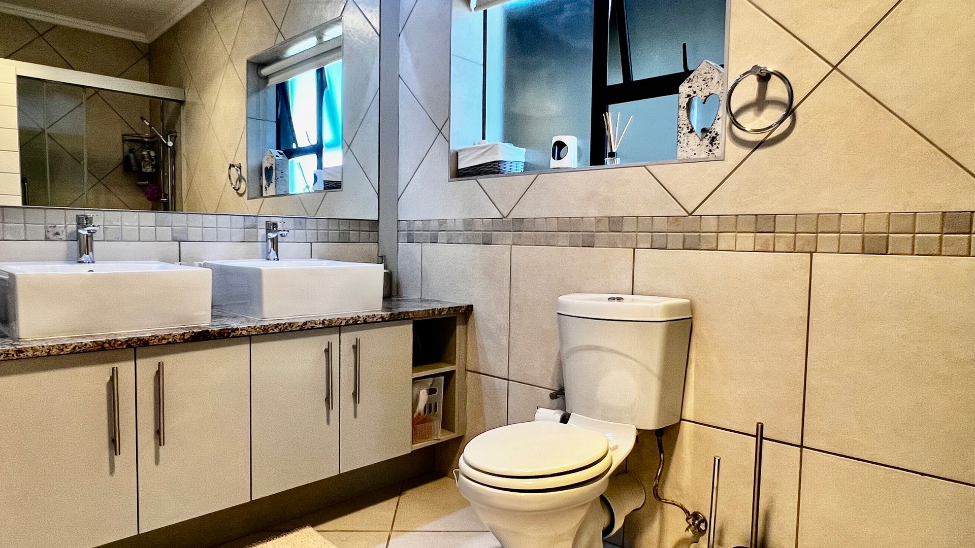 The stylish kitchen is a standout featuring granite countertops, feature cupboards, soft display lighting, and a central island that anchors the open-plan layout — perfect for family living or effortless entertaining. Modern tiles flow throughout the home, including the garage, which offers ample built-in cupboards and is plumbed for a washing machine. The spacious living area includes an indoor braai that can double as a fireplace in winter, creating a warm and inviting atmosphere year-round. Stack doors open seamlessly onto an undercover patio, ideal for all-season entertaining, and lead to a private, enclosed garden—perfect for children, pets, or relaxed outdoor enjoyment. All three bedrooms are well-sized and carpeted, providing comfortable retreats, with the main bedroom featuring an en-suite bathroom. Convenience continues with a double garage offering direct access to the home, while practical extras such as a plumbed and pumped water tank with a linked filtration system, a gas geyser, and an air-conditioning unit ensure comfort and efficiency throughout the year.