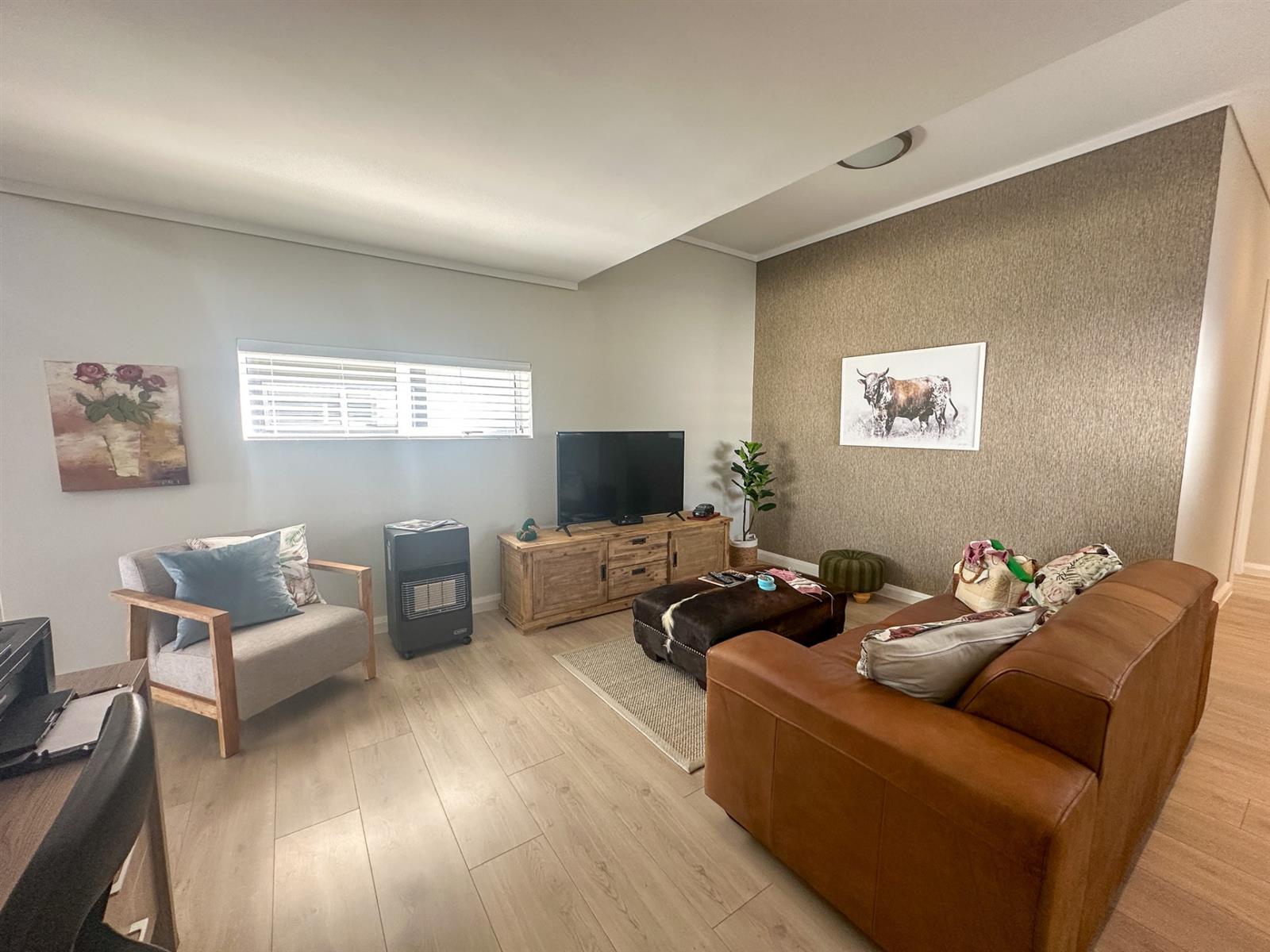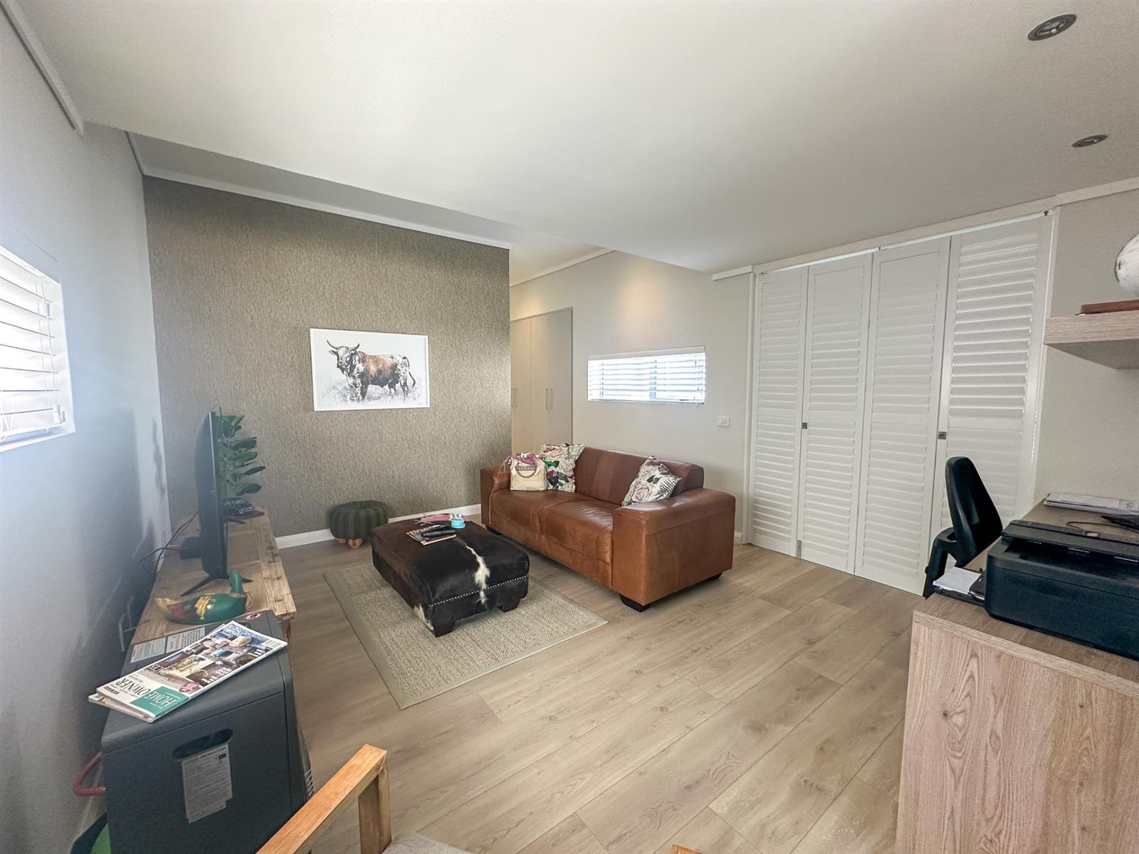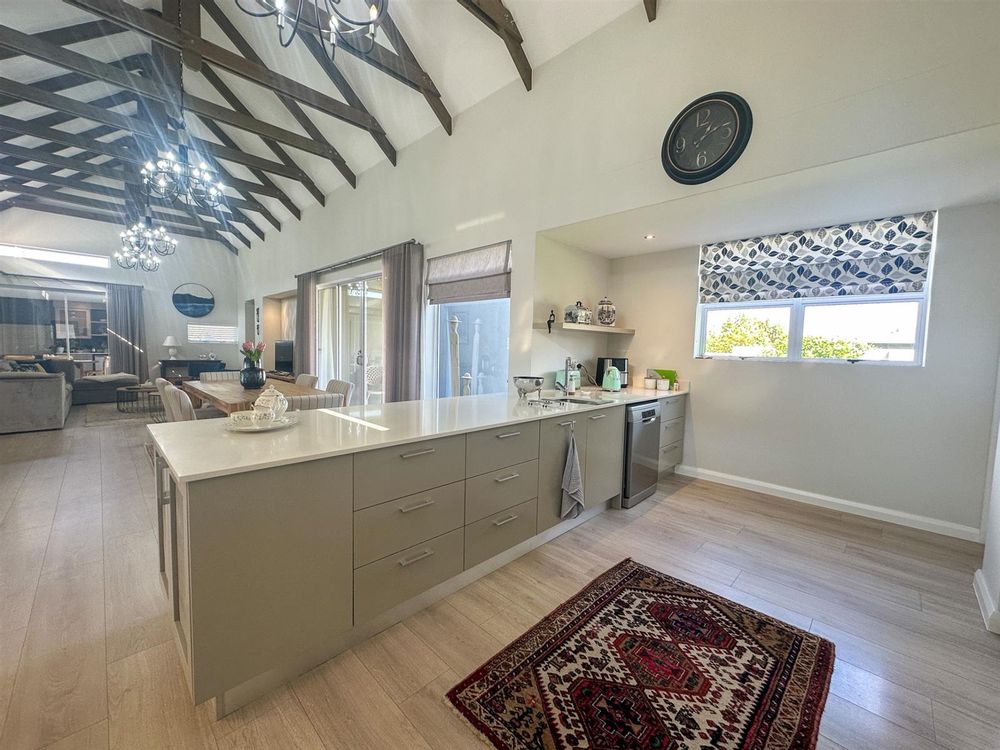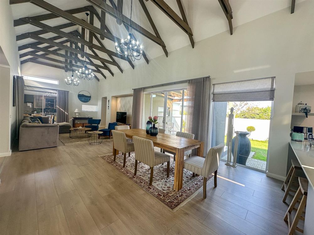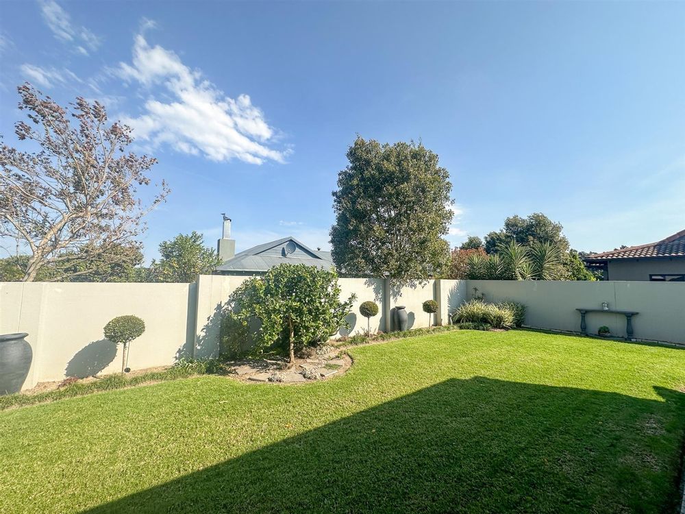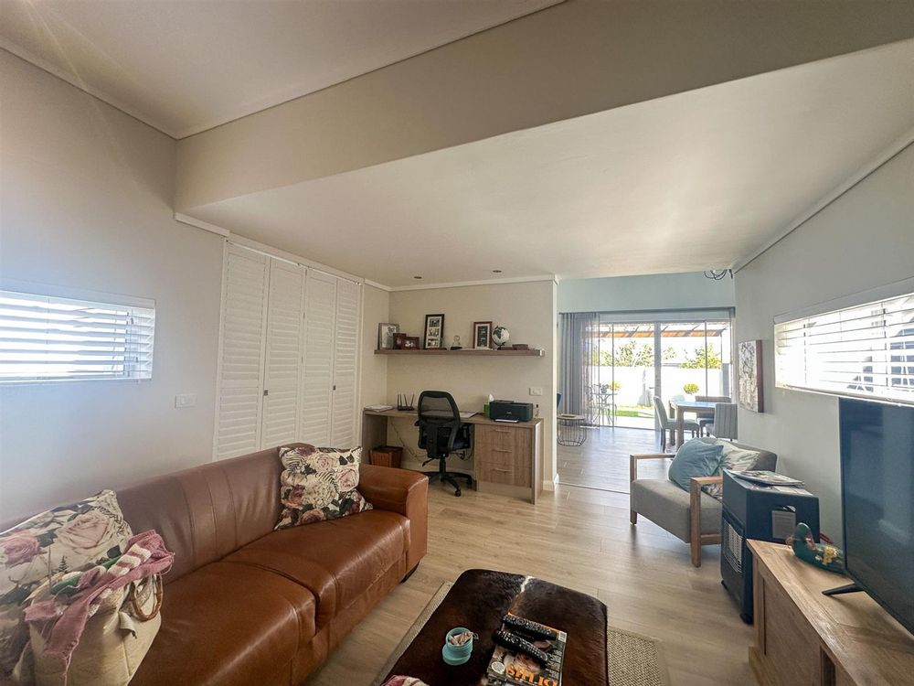 This exceptional single-storey 4 bedroom home at Earls Court Lifestyle Estate perfectly blends contemporary design with a practical, light-filled layout. Its northern orientation ensures bright living spaces throughout the day. The open-plan living, dining, and kitchen area is the heart of the home, featuring a cozy fireplace for winter evenings and a gourmet kitchen with Caesarstone countertops and a walk-in pantry. A separate TV lounge and study nook provide quiet retreats, all while flowing seamlessly onto a large enclosed patio. This expansive patio offers a built-in braai and stunning views of the surrounding mountains and garden, making it an ideal space for both relaxation and entertaining. This is a VAT registered property and the above pricing is including VAT.