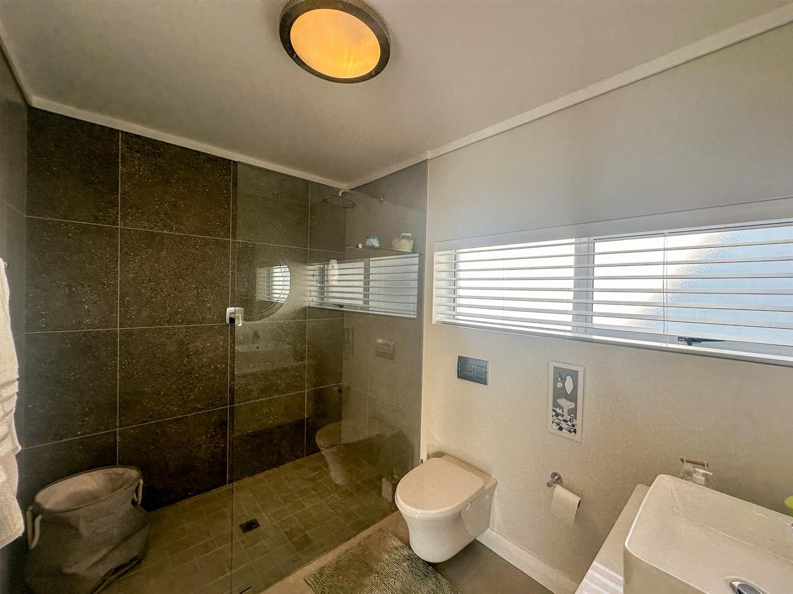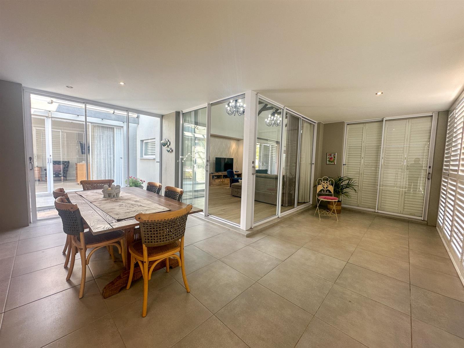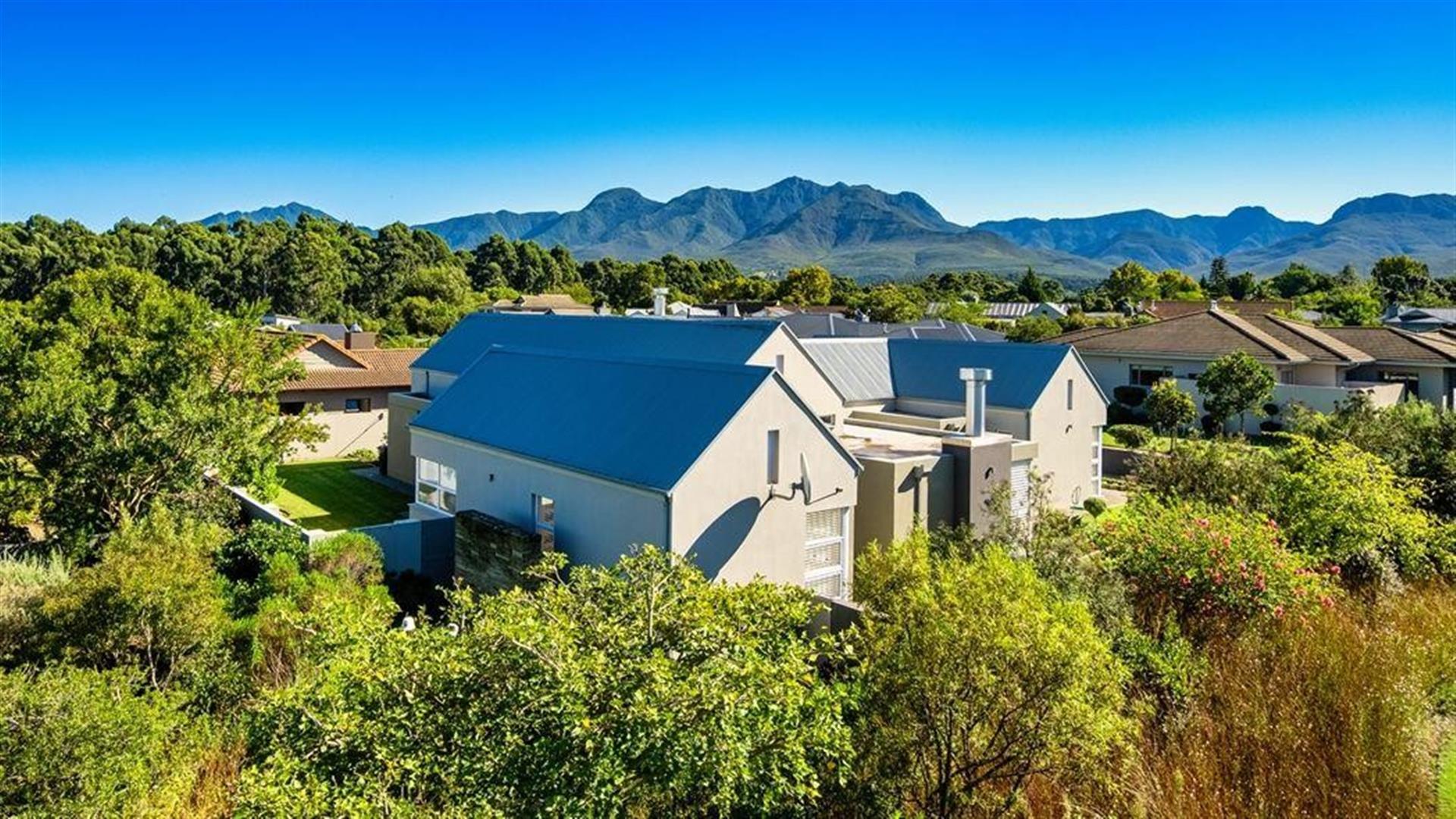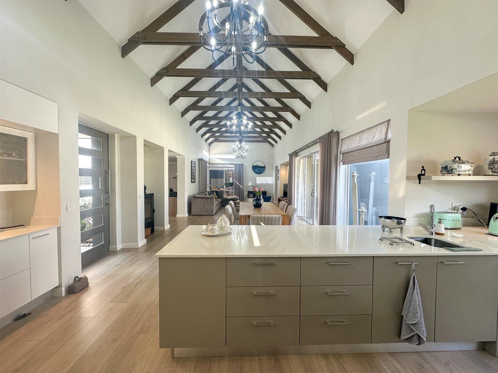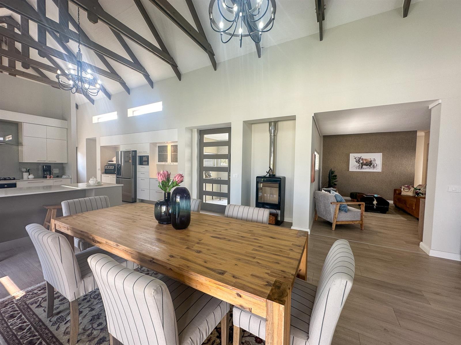 This exceptional single-storey 4 bedroom home at Earls Court Lifestyle Estate perfectly blends contemporary design with a practical, light-filled layout. Its northern orientation ensures bright living spaces throughout the day. The open-plan living, dining, and kitchen area is the heart of the home, featuring a cozy fireplace for winter evenings and a gourmet kitchen with Caesarstone countertops and a walk-in pantry. A separate TV lounge and study nook provide quiet retreats, all while flowing seamlessly onto a large enclosed patio. This expansive patio offers a built-in braai and stunning views of the surrounding mountains and garden, making it an ideal space for both relaxation and entertaining. This is a VAT registered property and the above pricing is including VAT.