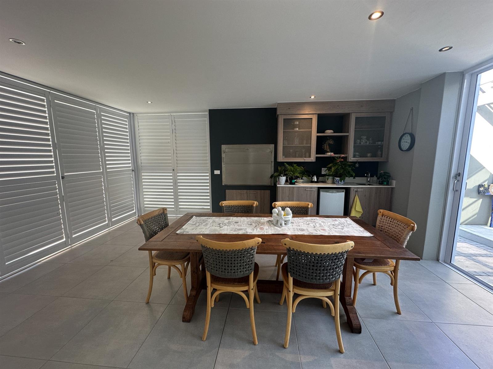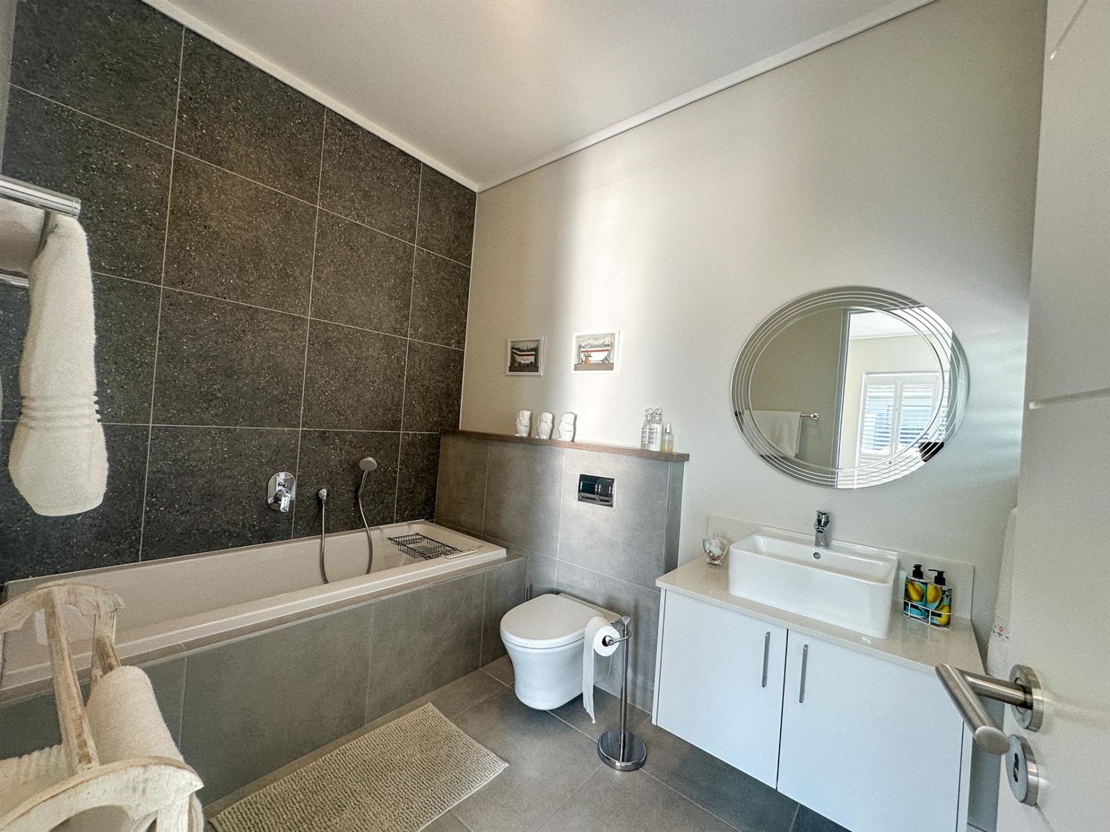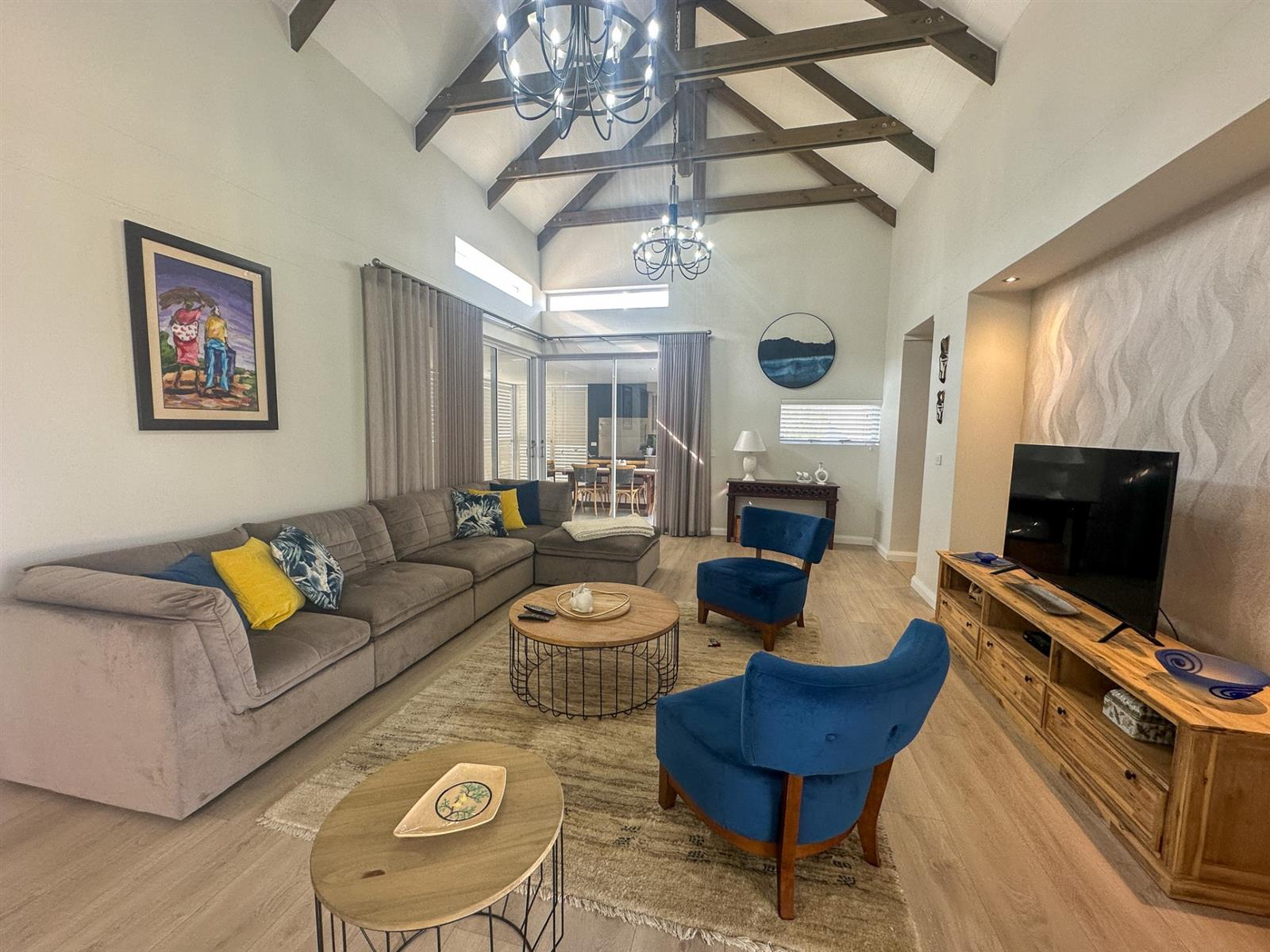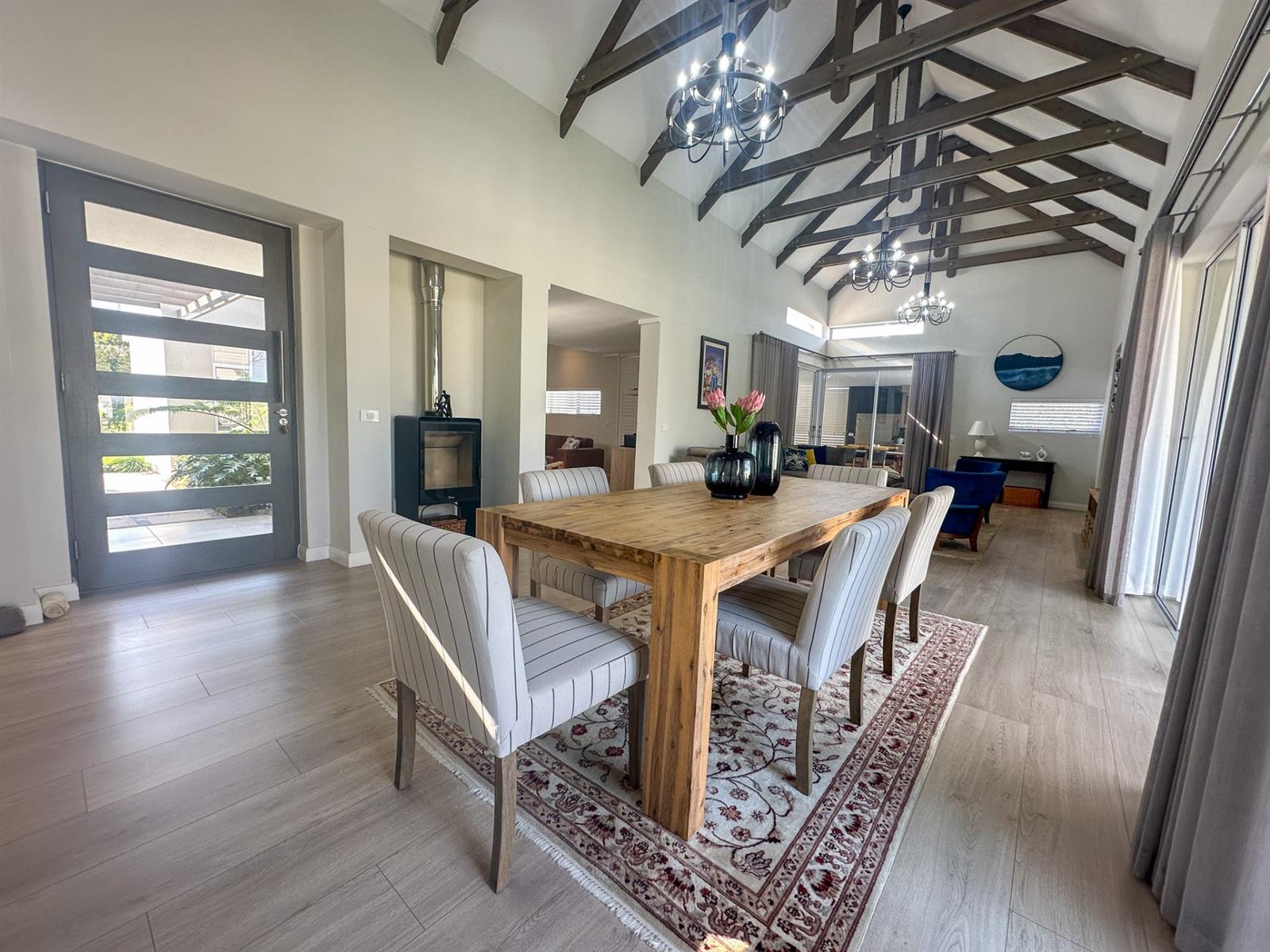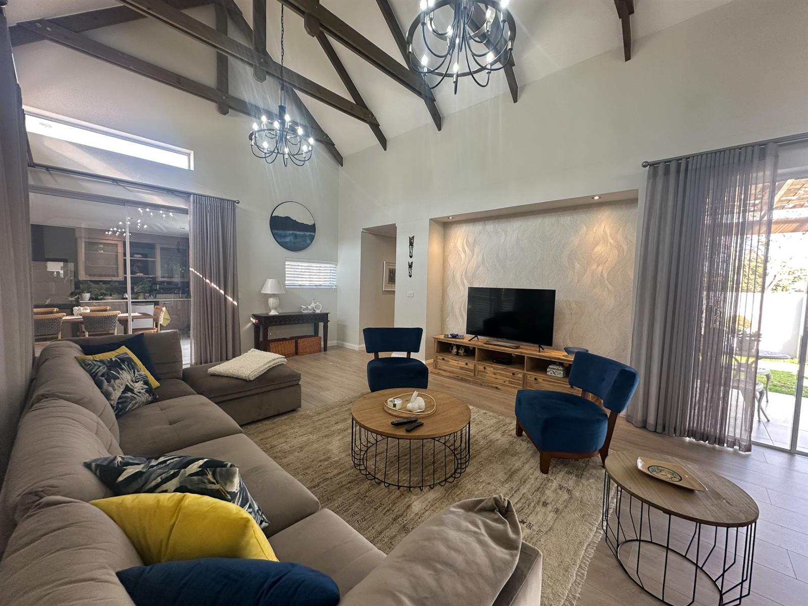 This exceptional single-storey 4 bedroom home at Earls Court Lifestyle Estate perfectly blends contemporary design with a practical, light-filled layout. Its northern orientation ensures bright living spaces throughout the day. The open-plan living, dining, and kitchen area is the heart of the home, featuring a cozy fireplace for winter evenings and a gourmet kitchen with Caesarstone countertops and a walk-in pantry. A separate TV lounge and study nook provide quiet retreats, all while flowing seamlessly onto a large enclosed patio. This expansive patio offers a built-in braai and stunning views of the surrounding mountains and garden, making it an ideal space for both relaxation and entertaining. This is a VAT registered property and the above pricing is including VAT.