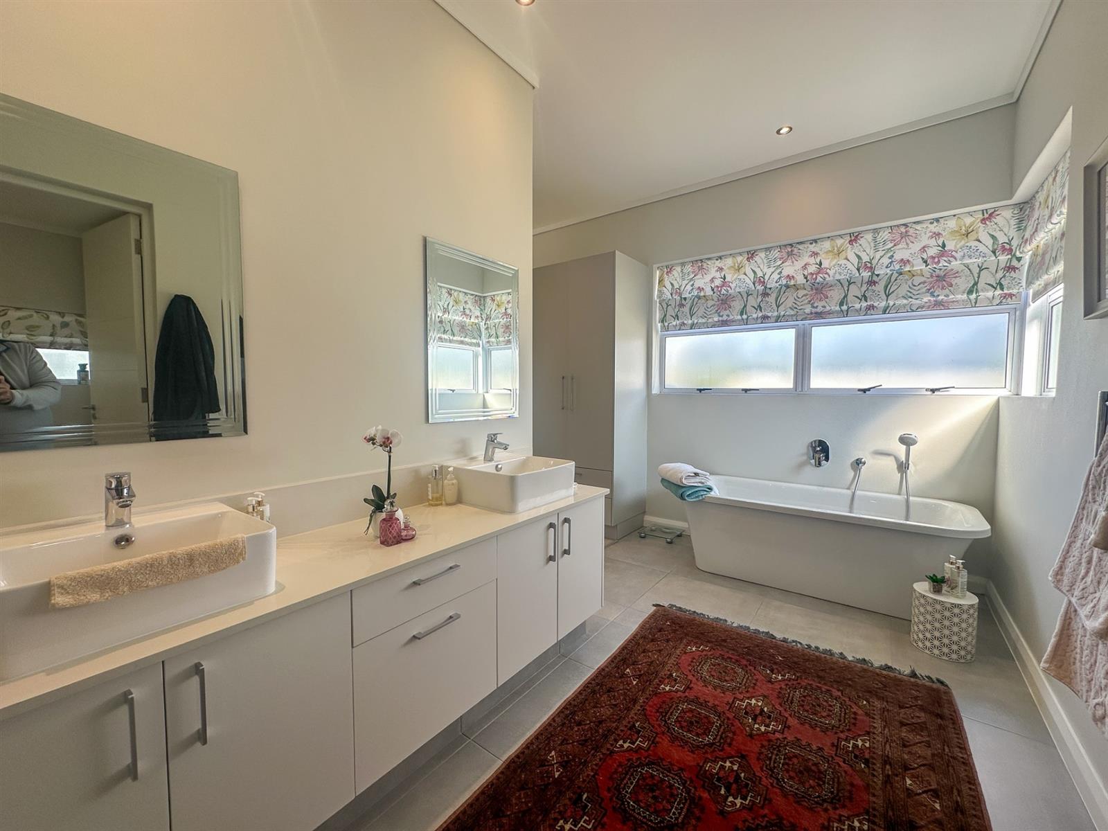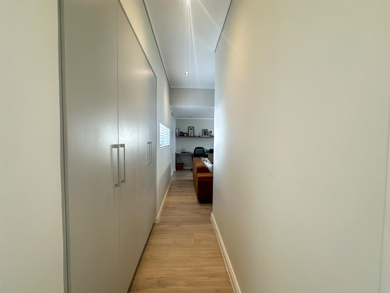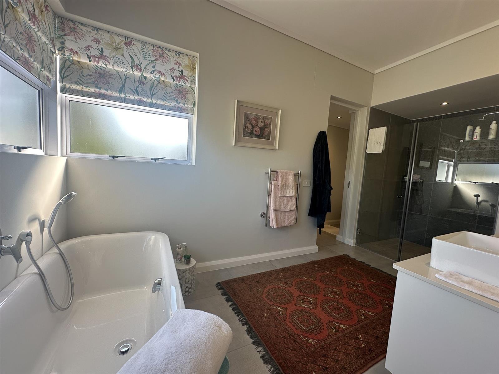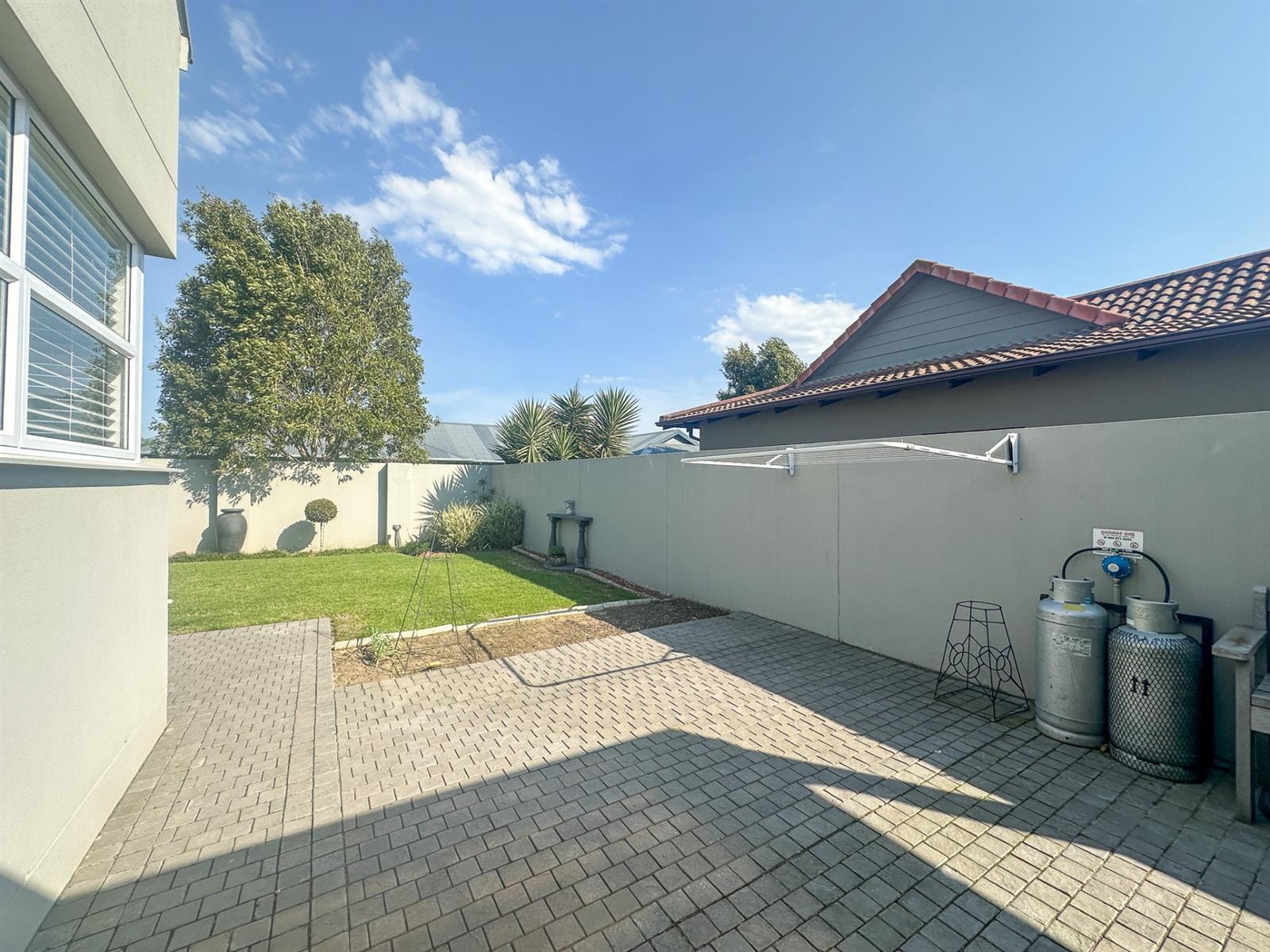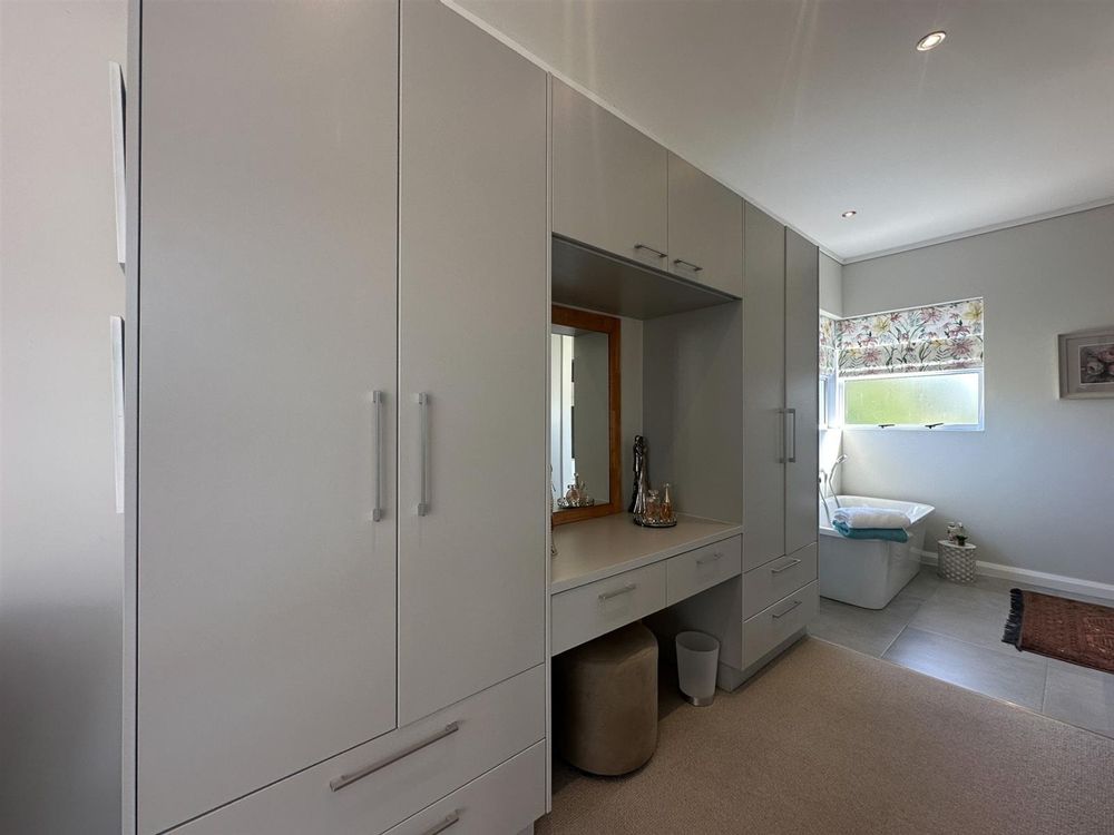 The house offers four spacious bedrooms and three bathrooms, designed for comfort and privacy. The main bedroom is a luxurious retreat with ample built-in cupboards, a full en-suite bathroom, and direct access to the garden and patio. The three additional bedrooms are well-appointed with built-in cupboards and vinyl flooring. Two of these bedrooms share a full bathroom, while the other has its own en-suite. The property also features a double automated garage, a full solar system with a backup inverter, and is fully enclosed and pet-friendly. Residents of Earls Court Estate enjoy exclusive access to top-tier amenities, including a clubhouse, gym, tennis court, and dog park.