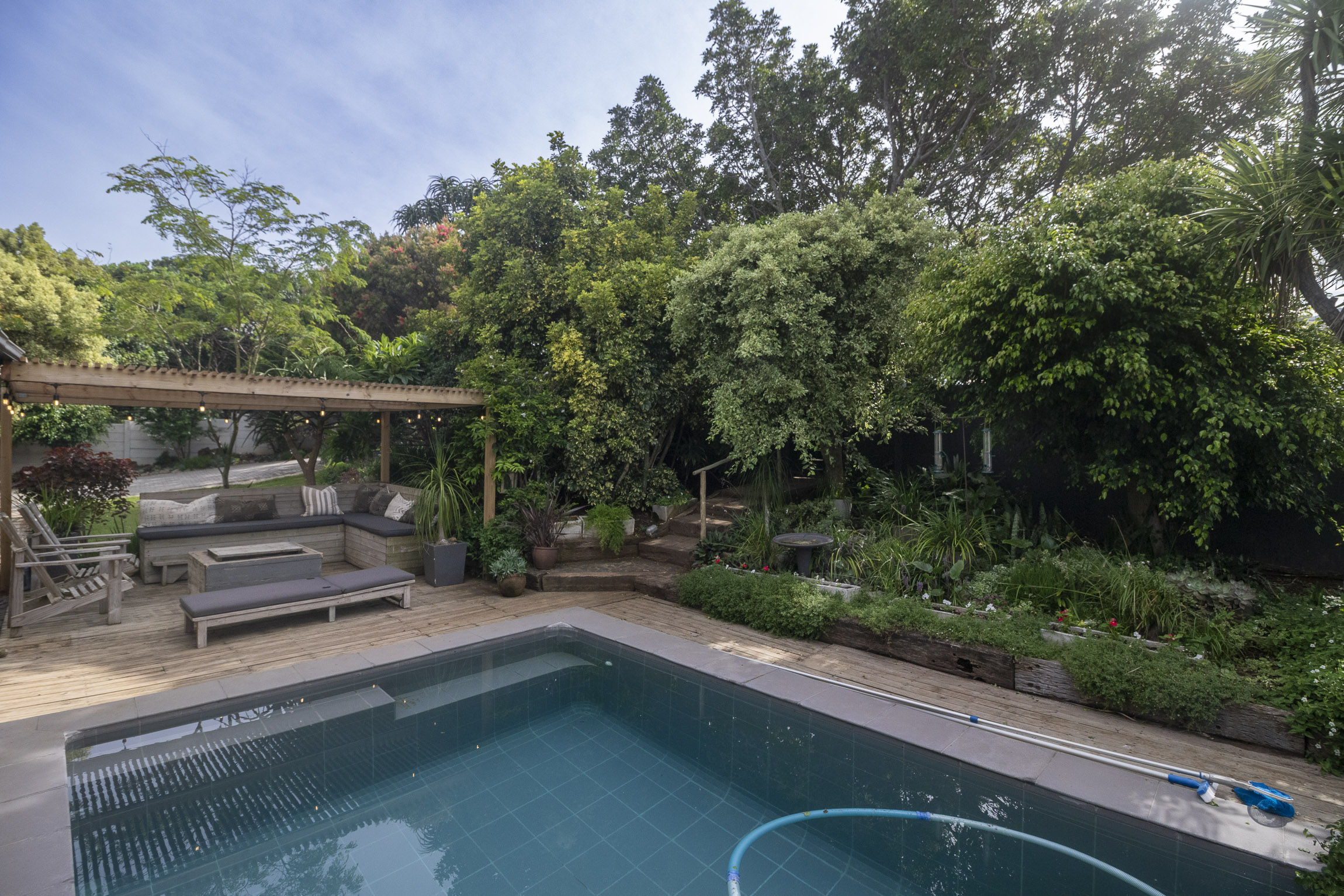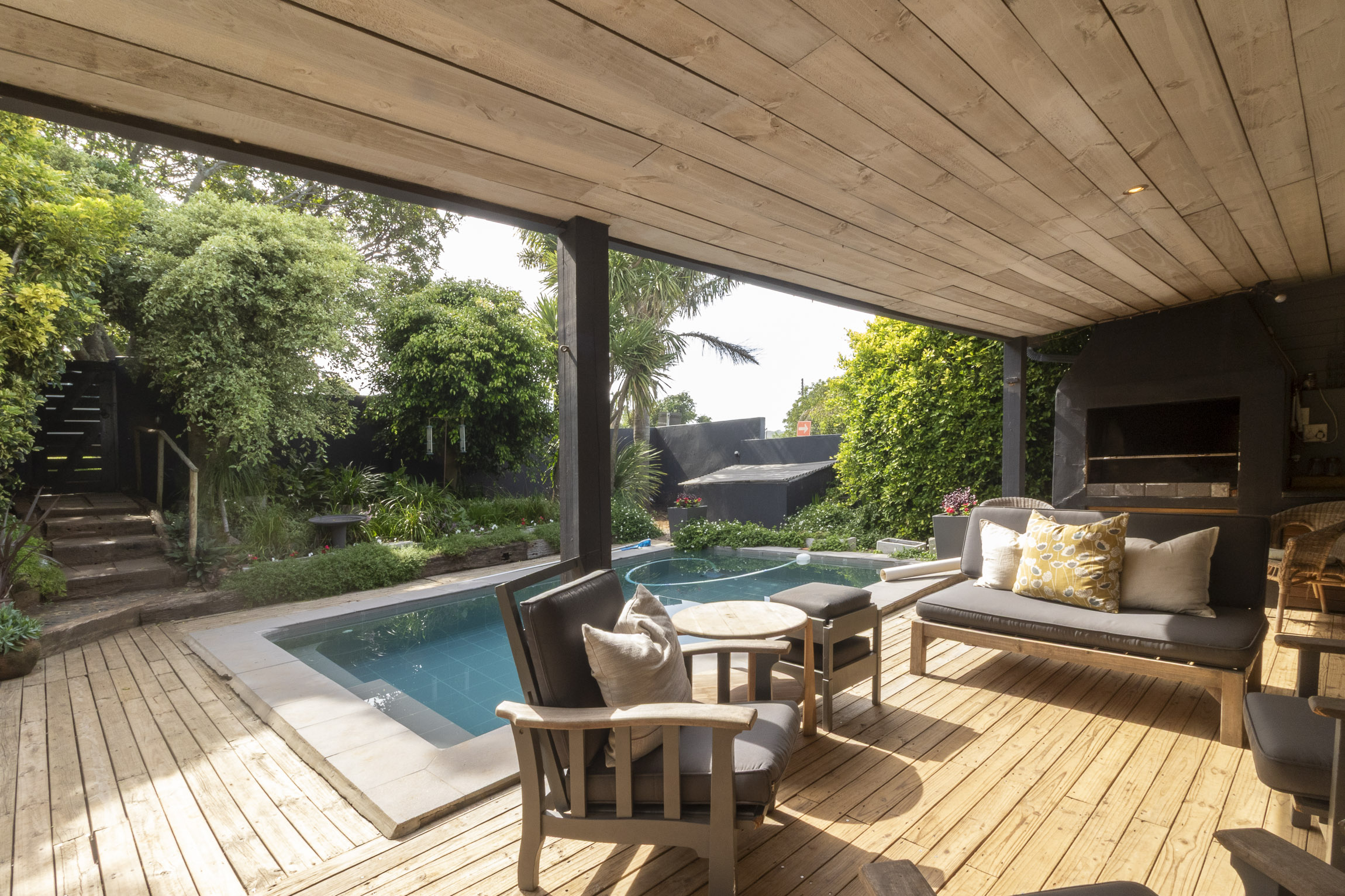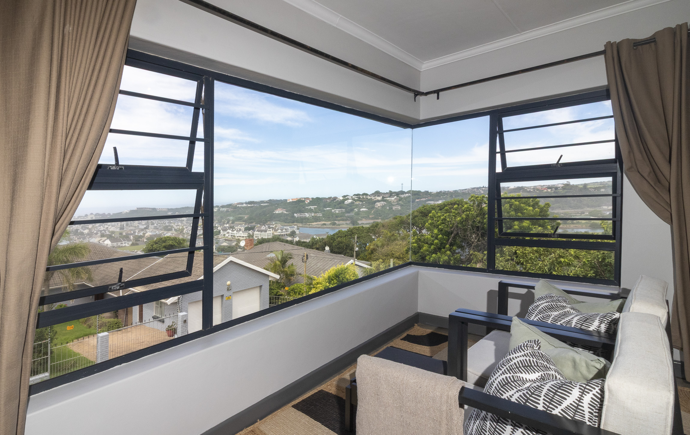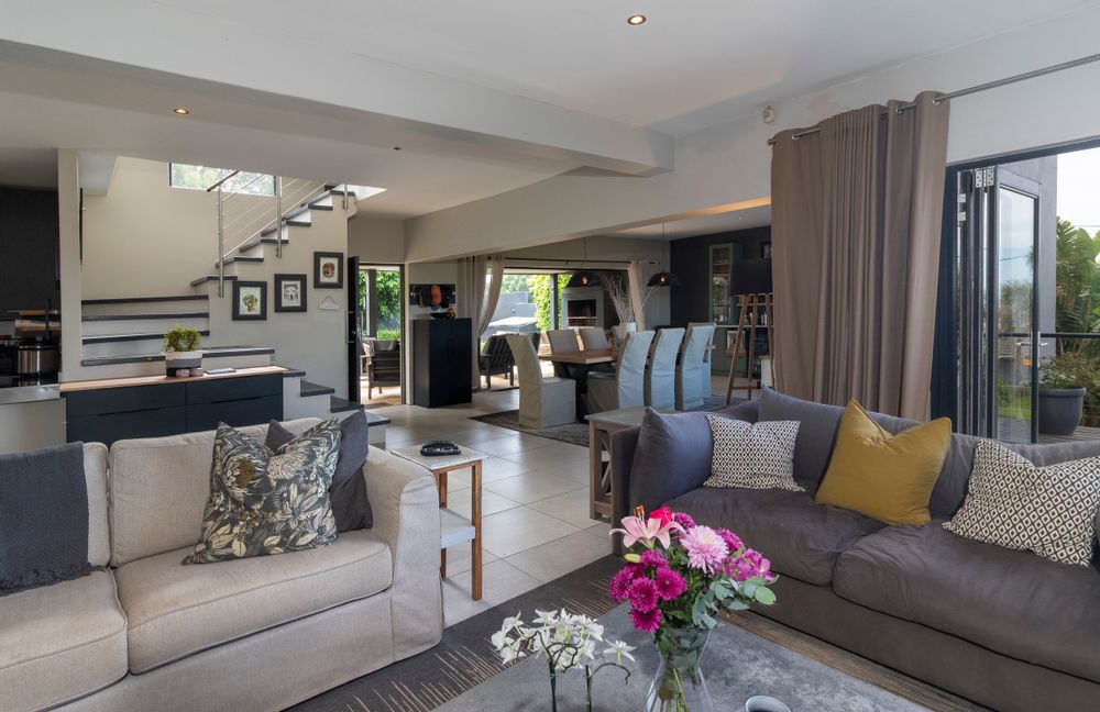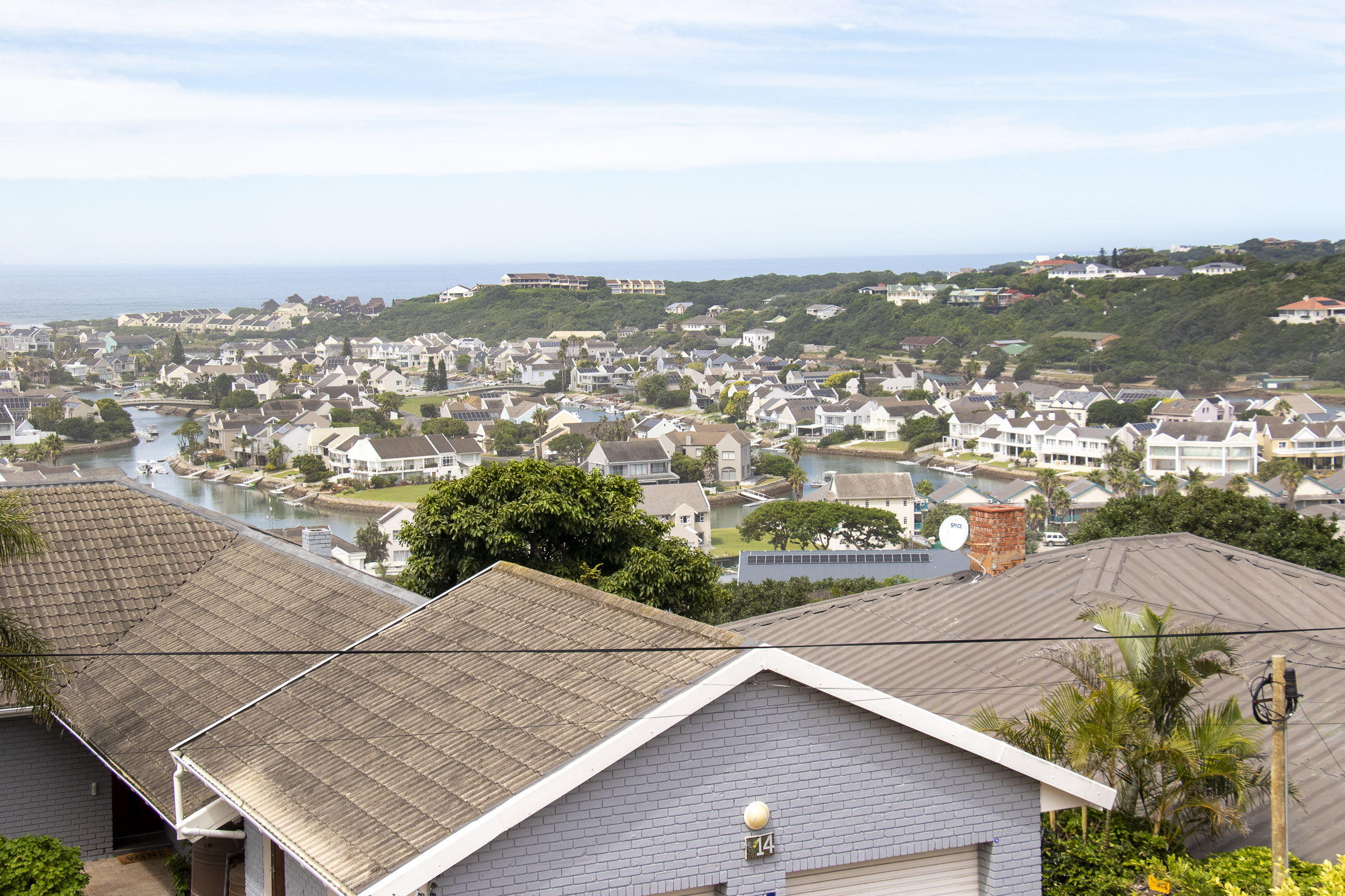Nestled on the serene and peaceful East bank of Port Alfred, this three-bedroom home offers a truly unique living experience, far from the noise of everyday life. Positioned on a prime corner plot, the property boasts sweeping views of the Port Alfred Marina, Harbour, and the ocean, making it an absolute haven. As you enter through the gates, you’re greeted by lush greenery that envelops you in tranquillity. The open-plan living and dining areas flow seamlessly onto a spacious outdoor patio and swimming pool area, complete with a cozy firepit, perfect for relaxing and entertaining. The lounge also features a separate deck that opens onto the roadside, ideal for enjoying your morning coffee while taking in the peaceful surroundings.