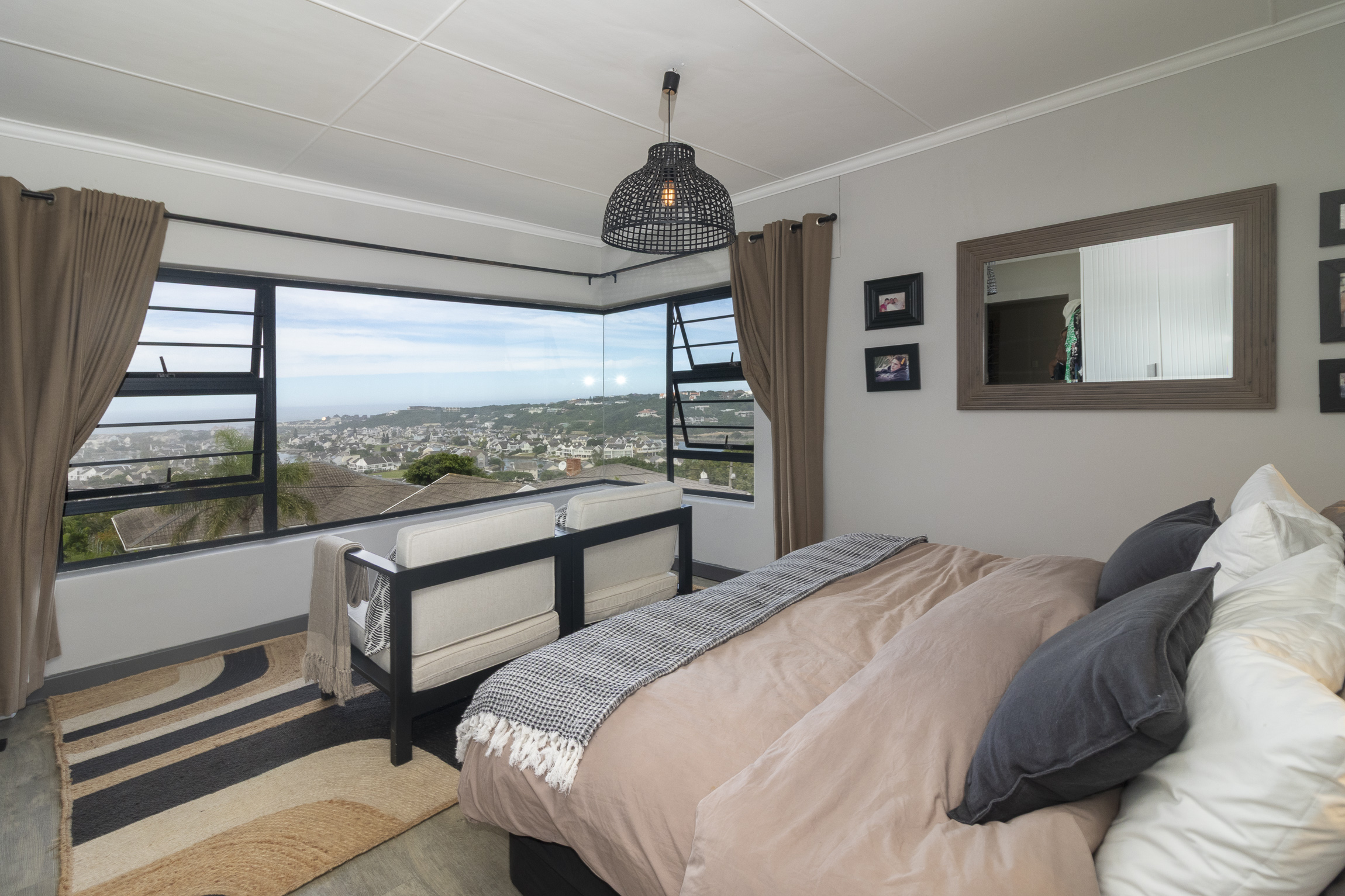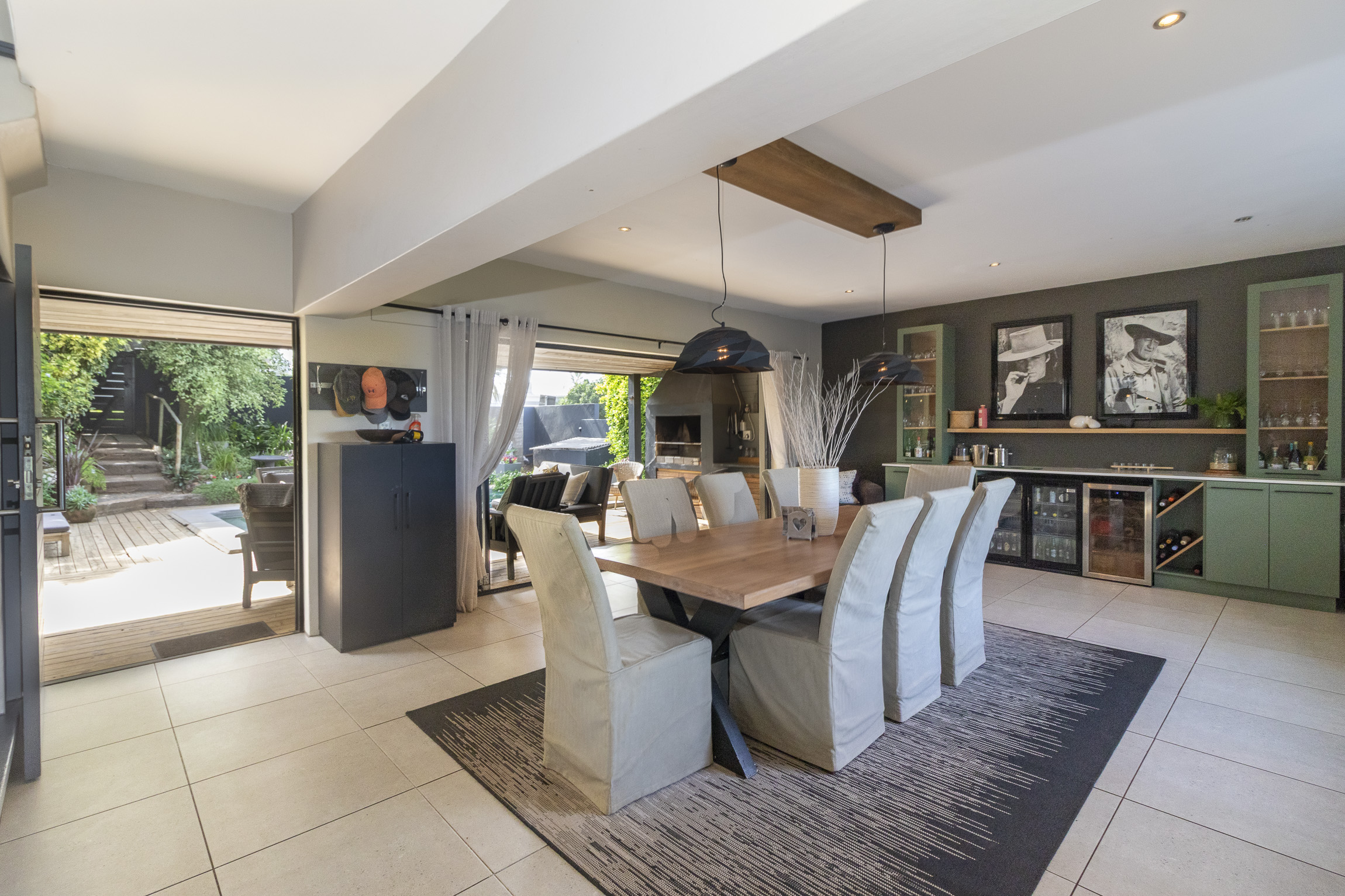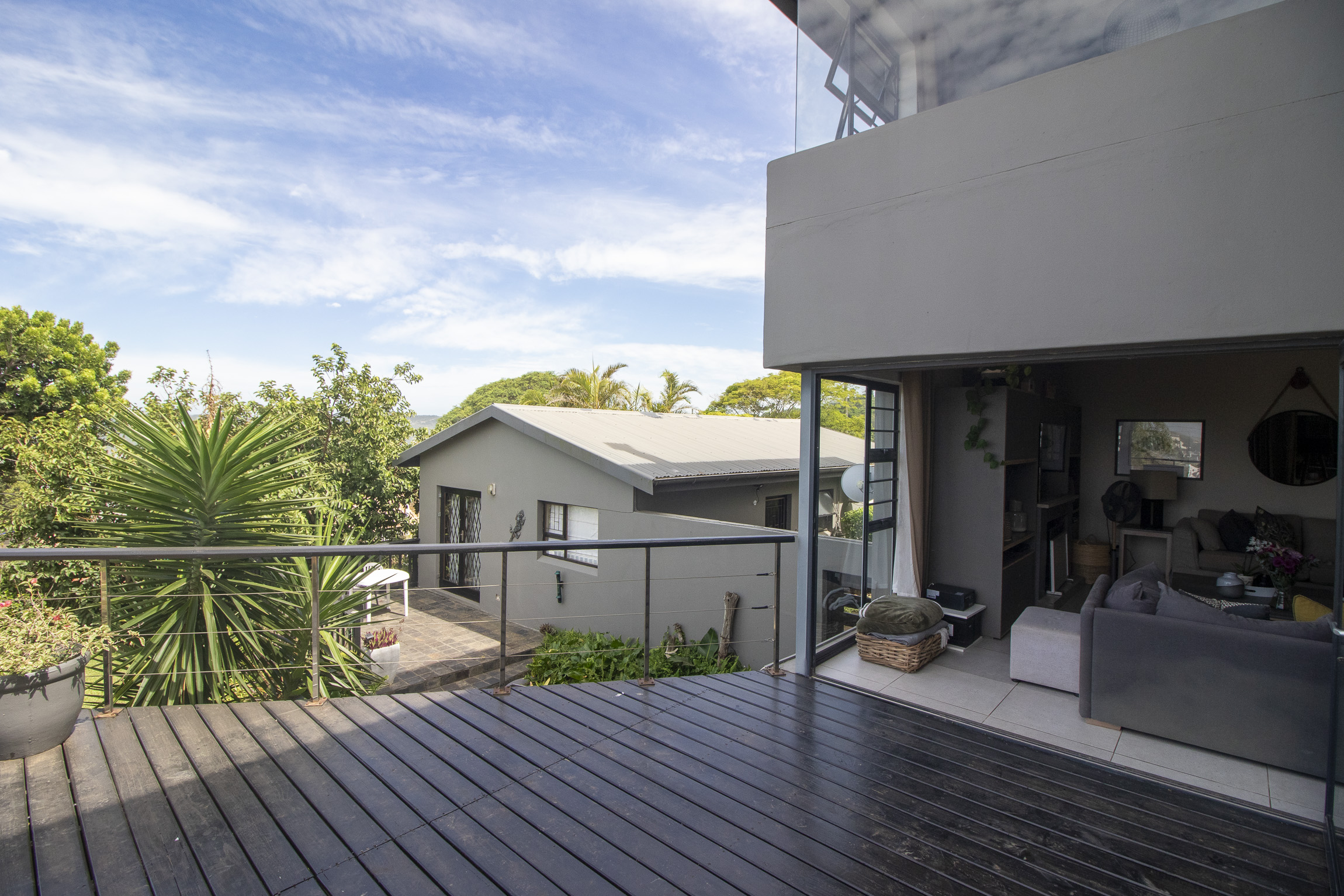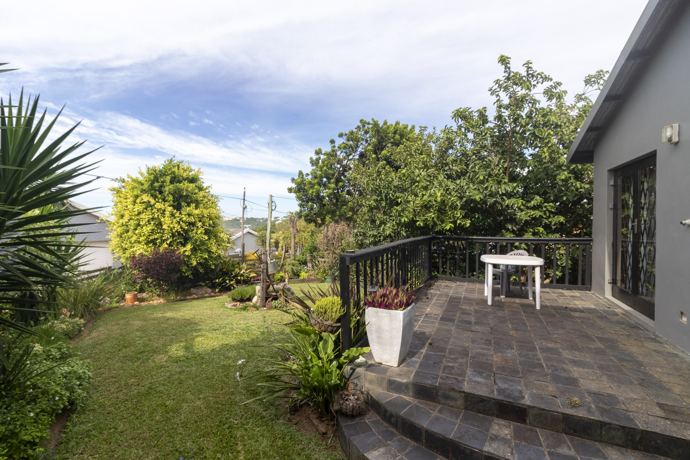 Nestled on the serene and peaceful East bank of Port Alfred, this three-bedroom home offers a truly unique living experience, far from the noise of everyday life. Positioned on a prime corner plot, the property boasts sweeping views of the Port Alfred Marina, Harbour, and the ocean, making it an absolute haven. As you enter through the gates, you’re greeted by lush greenery that envelops you in tranquillity. The open-plan living and dining areas flow seamlessly onto a spacious outdoor patio and swimming pool area, complete with a cozy firepit, perfect for relaxing and entertaining. The lounge also features a separate deck that opens onto the roadside, ideal for enjoying your morning coffee while taking in the peaceful surroundings.