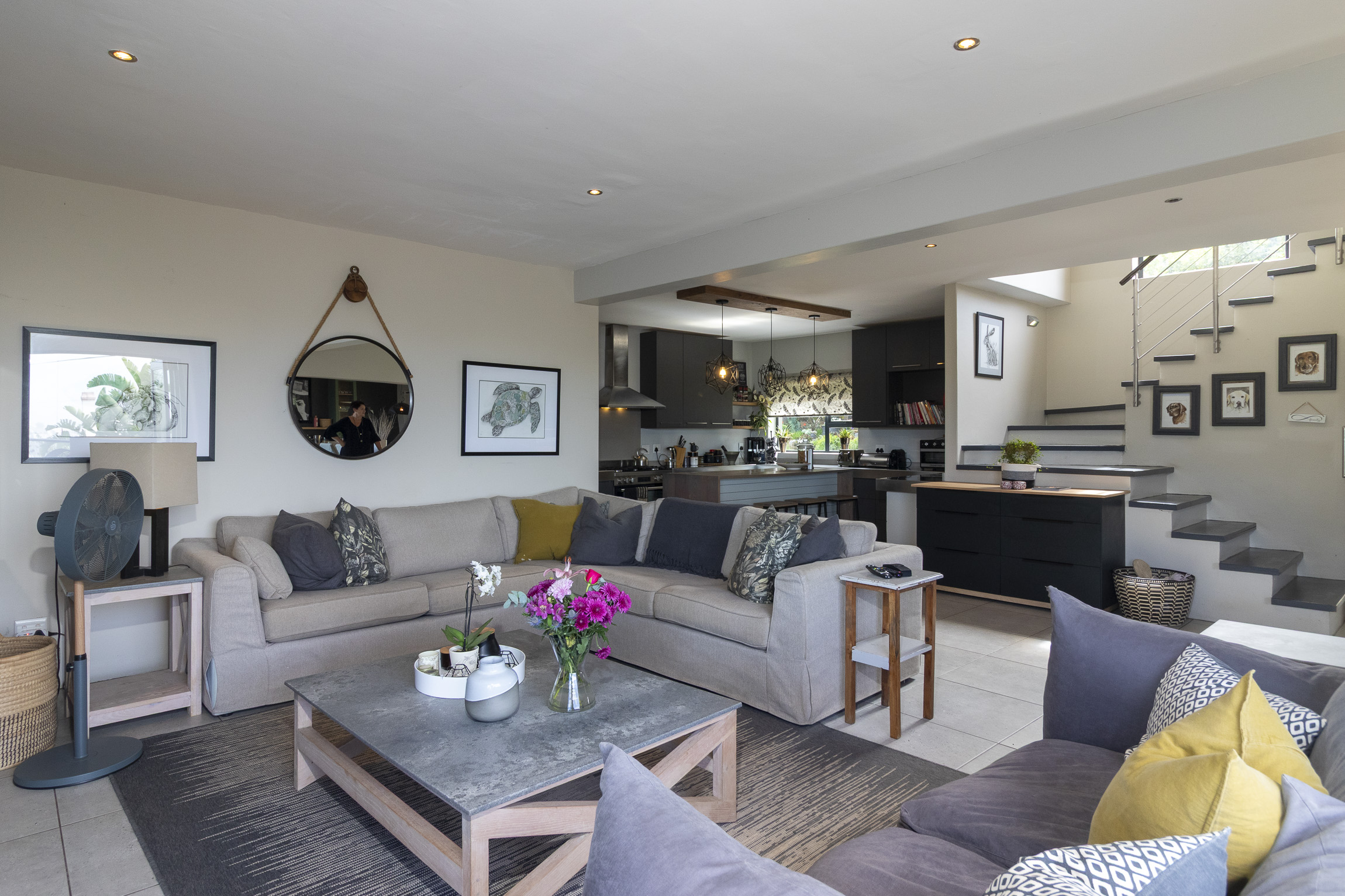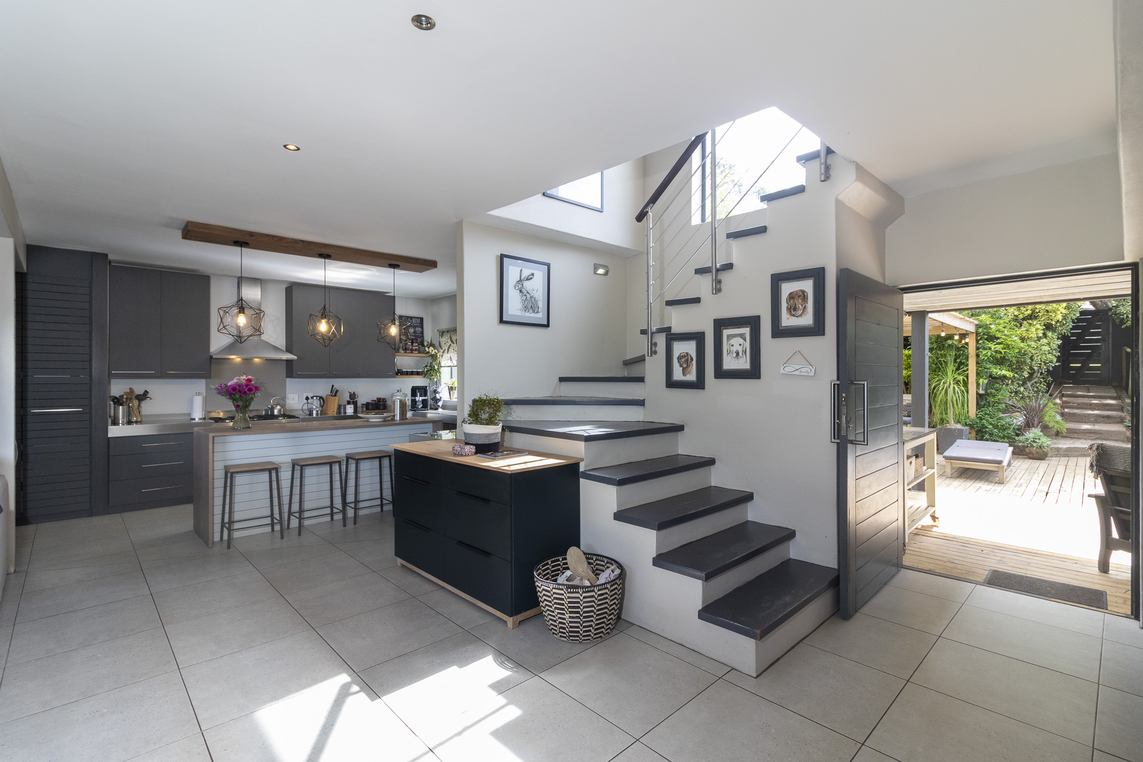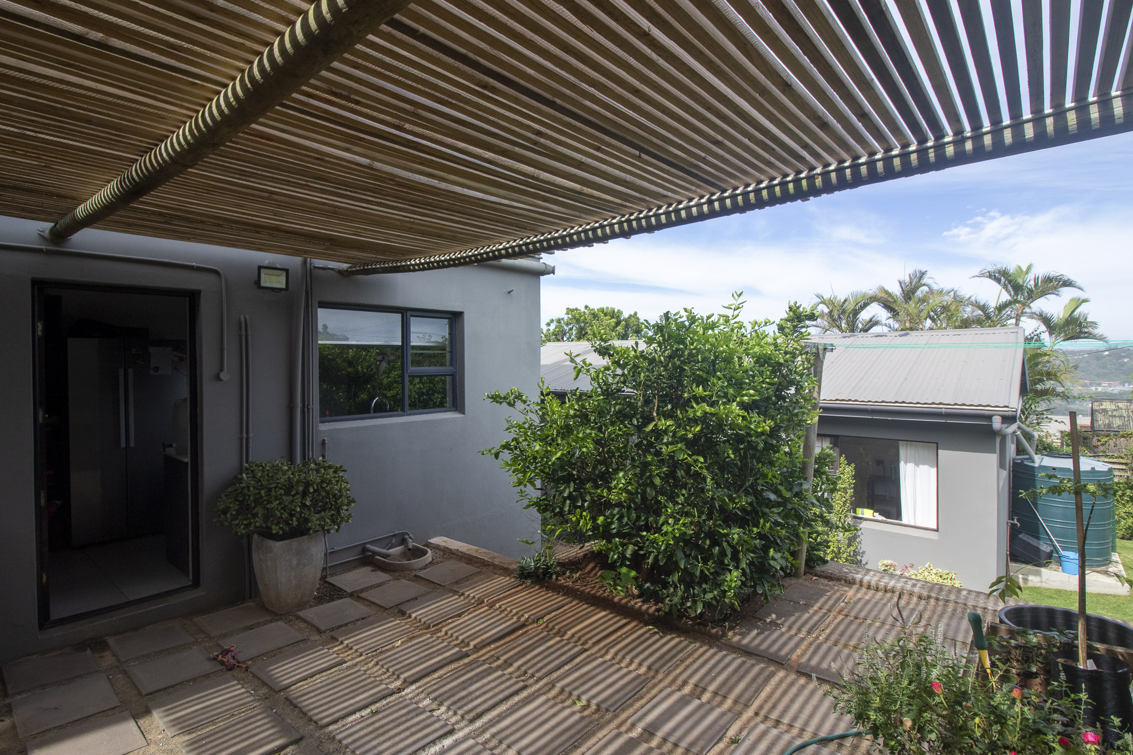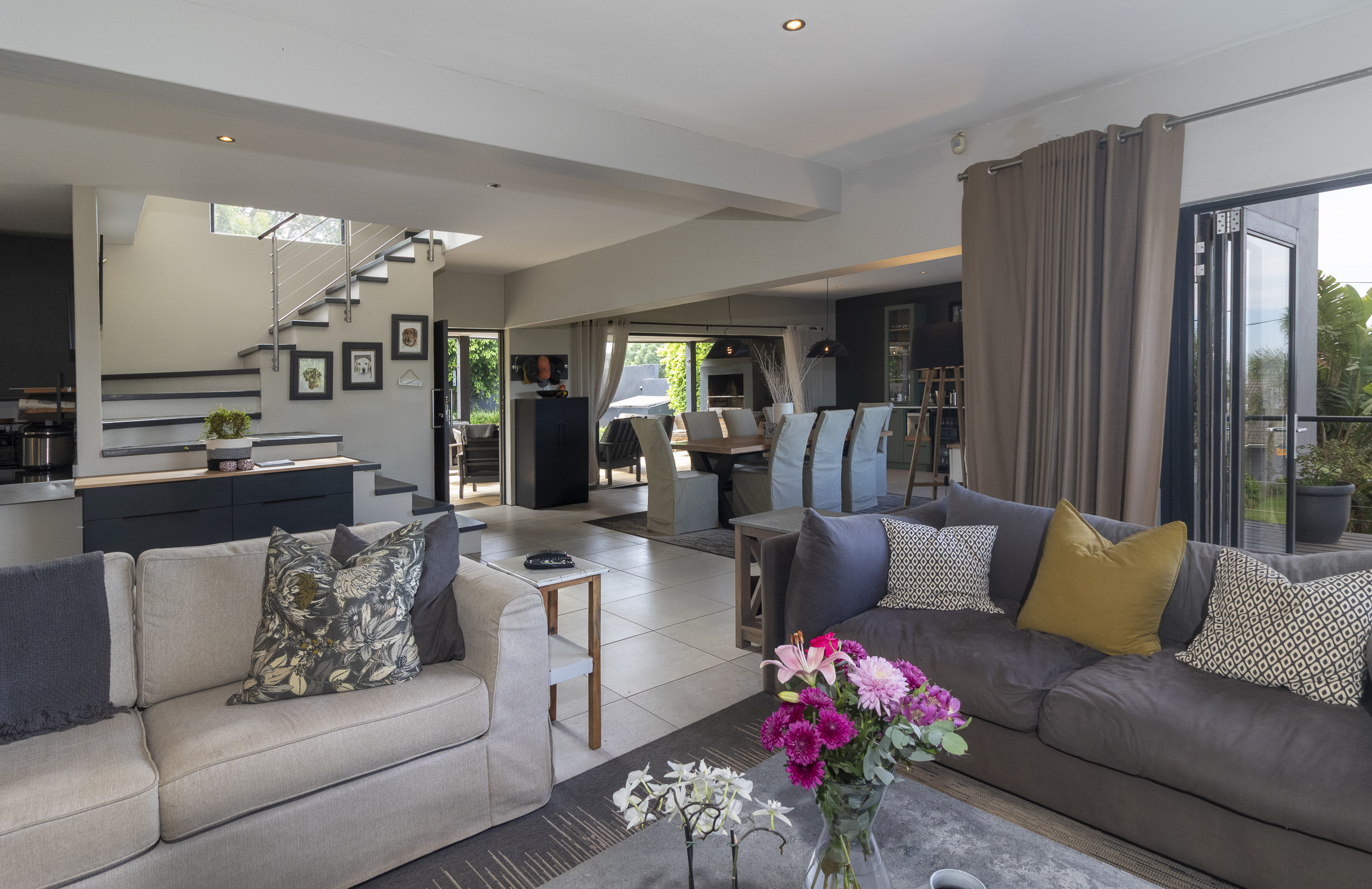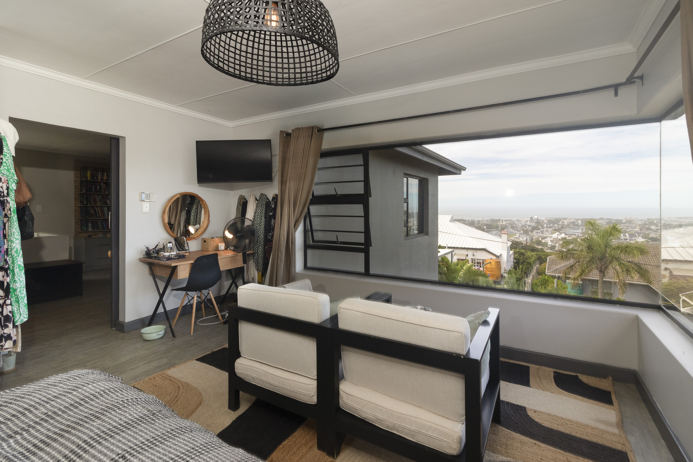 Nestled on the serene and peaceful East bank of Port Alfred, this three-bedroom home offers a truly unique living experience, far from the noise of everyday life. Positioned on a prime corner plot, the property boasts sweeping views of the Port Alfred Marina, Harbour, and the ocean, making it an absolute haven. As you enter through the gates, you’re greeted by lush greenery that envelops you in tranquillity. The open-plan living and dining areas flow seamlessly onto a spacious outdoor patio and swimming pool area, complete with a cozy firepit, perfect for relaxing and entertaining. The lounge also features a separate deck that opens onto the roadside, ideal for enjoying your morning coffee while taking in the peaceful surroundings.