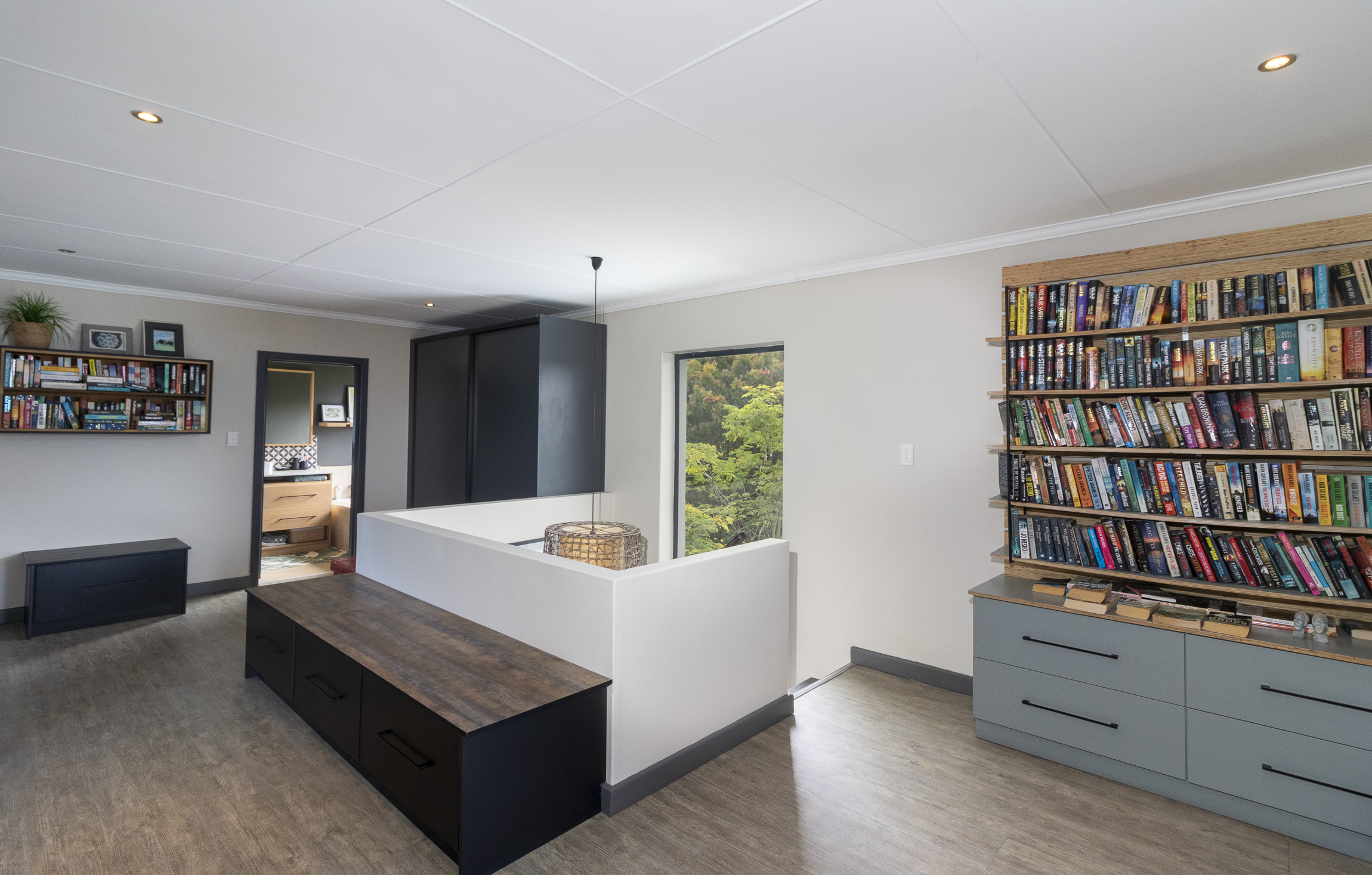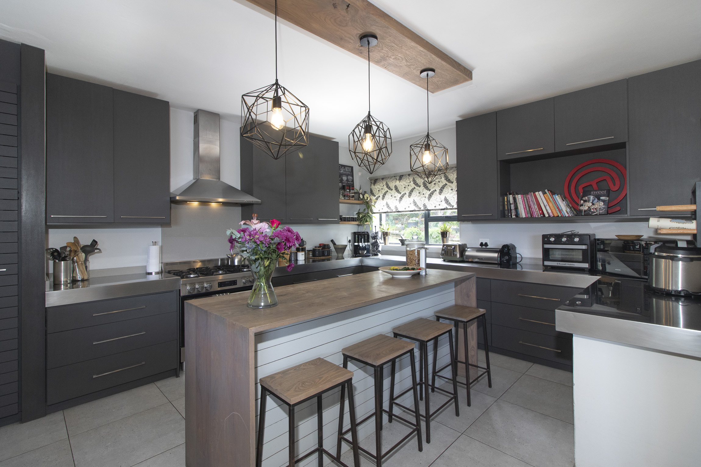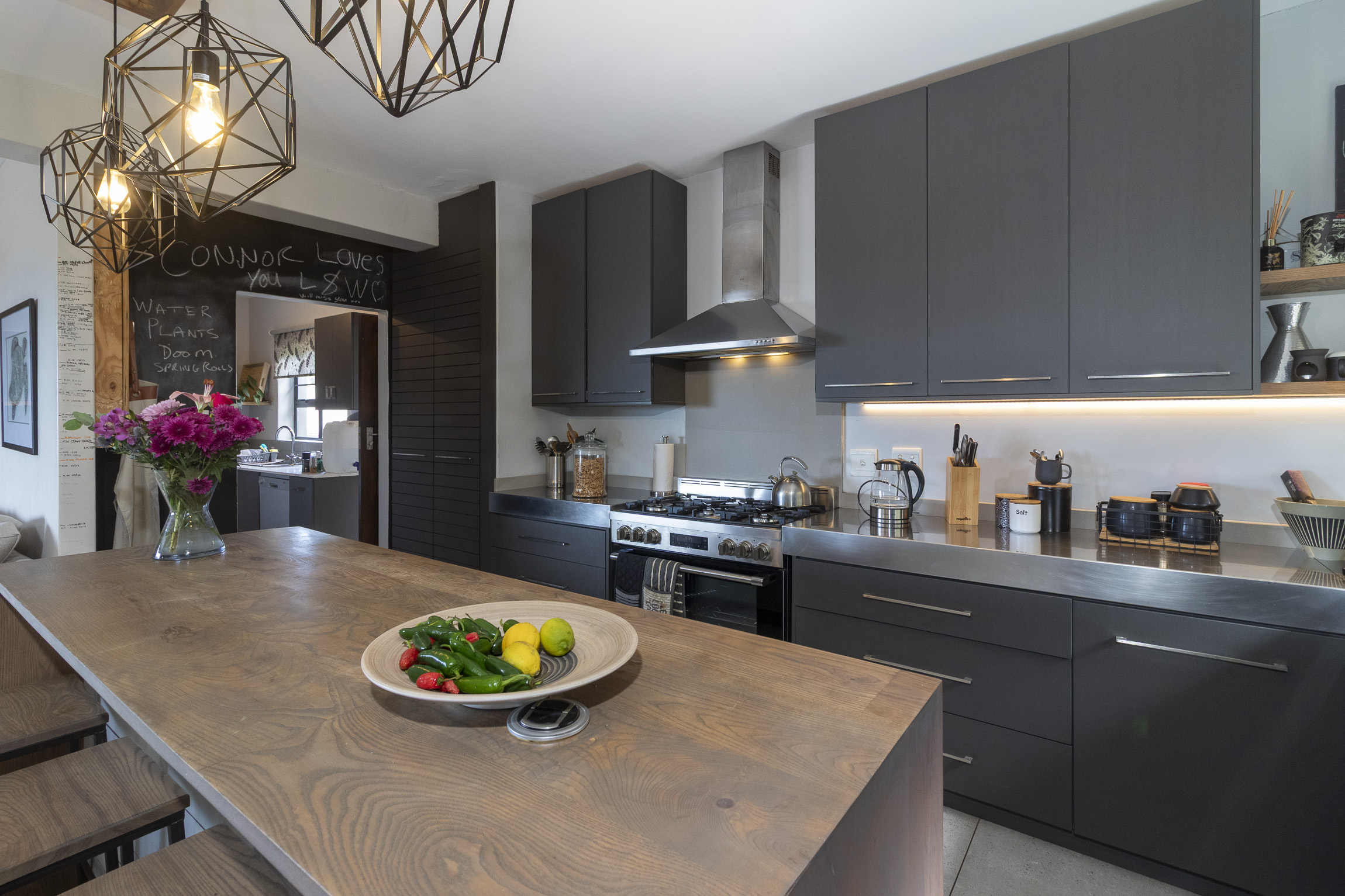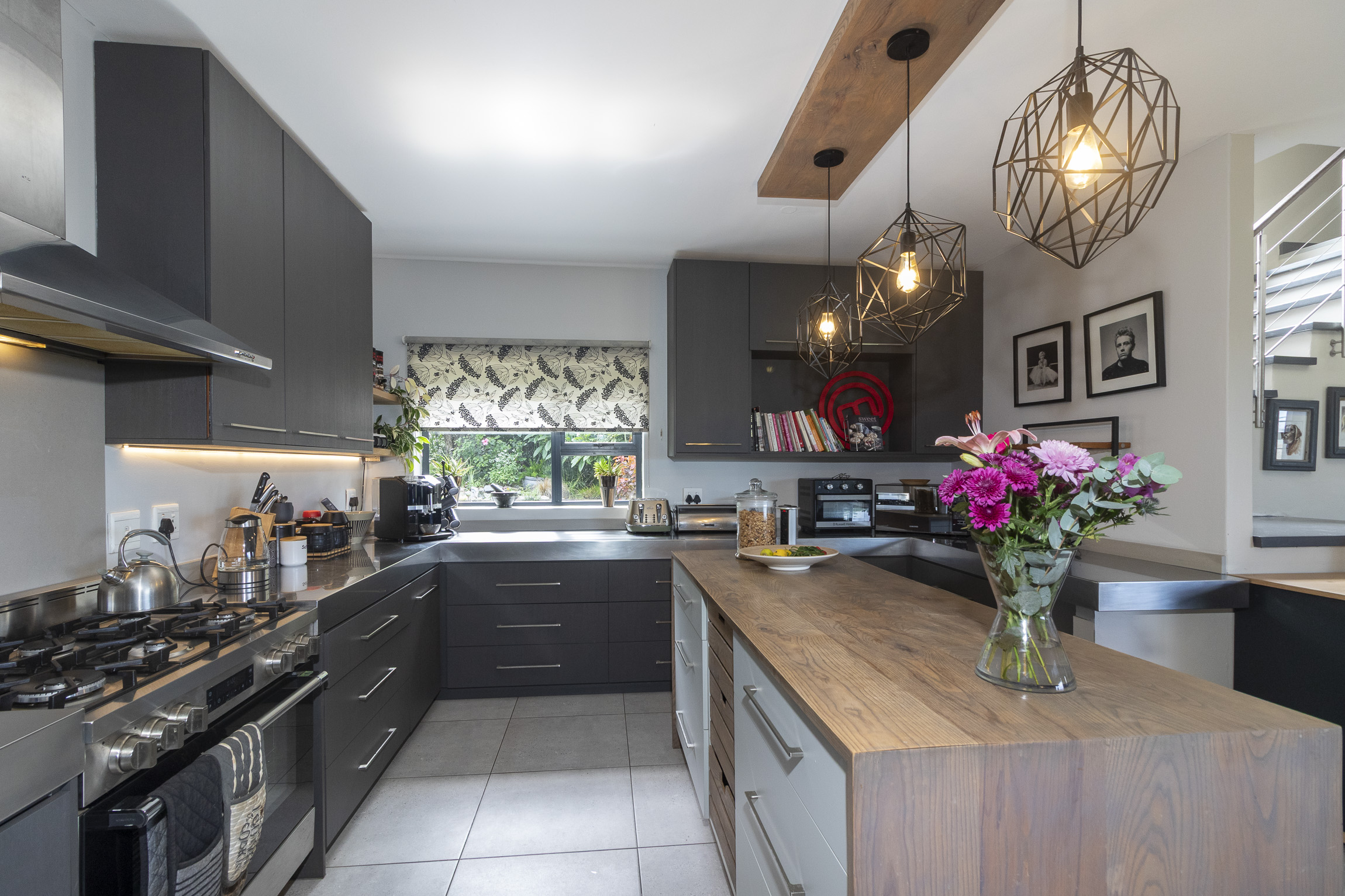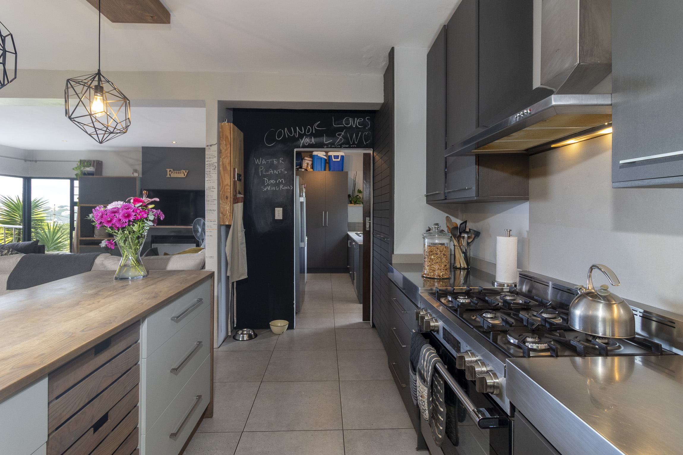 The modern, expansive kitchen is a chef’s dream, with luxurious countertops and top-tier cabinetry that create a stylish and functional space. A separate scullery provides added convenience and has a door leading to the backyard and washing line.