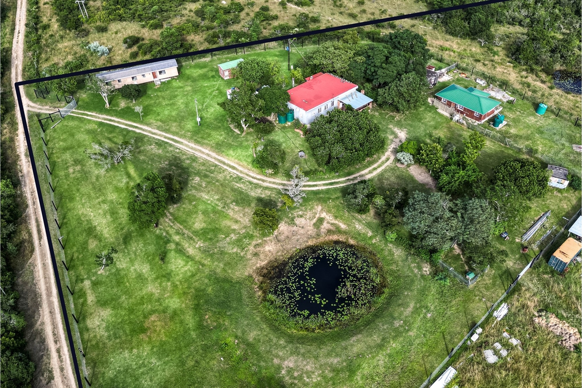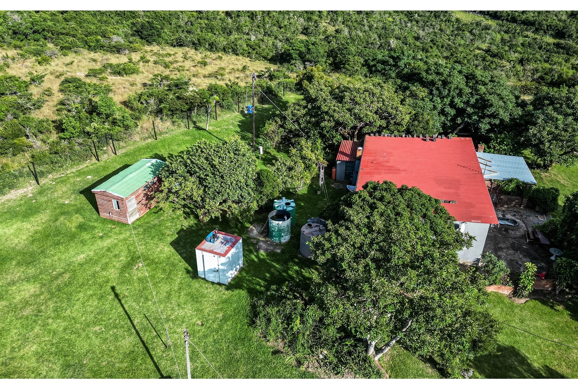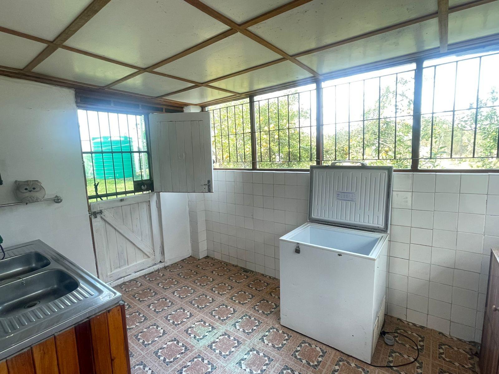 The farm is equipped with single-phase Eskom electricity, a borehole with solar pumps, a septic tank, multiple water tanks, and a cold room. There are also three small dams on the property, adding to its charm and natural beauty. The dwellings are securely enclosed with electric fencing (1 ha in size) and an electric gate at the entrance.