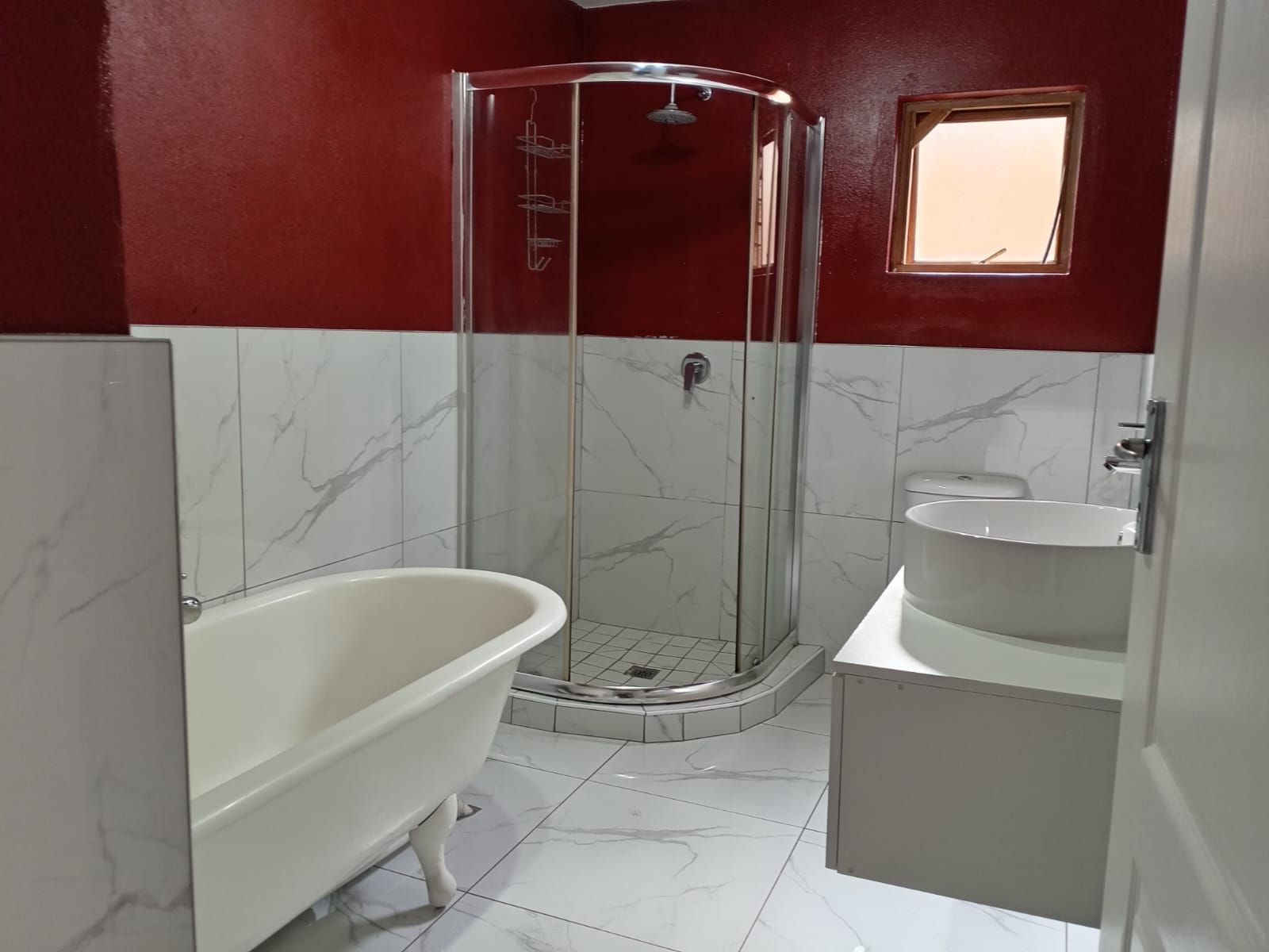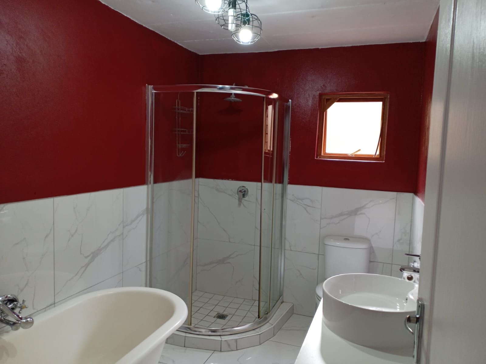 Bathroom 3 (Downstairs) – Newly built, with freestanding bath, shower, toilet, and basin, tastefully tiled and modern.
