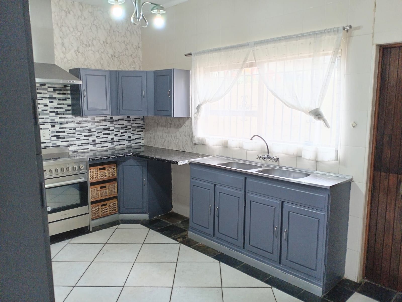 Fitted with ample cupboard space, glass-top 4-burner electric stove, washing machine connection, and space for a double-door fridge.