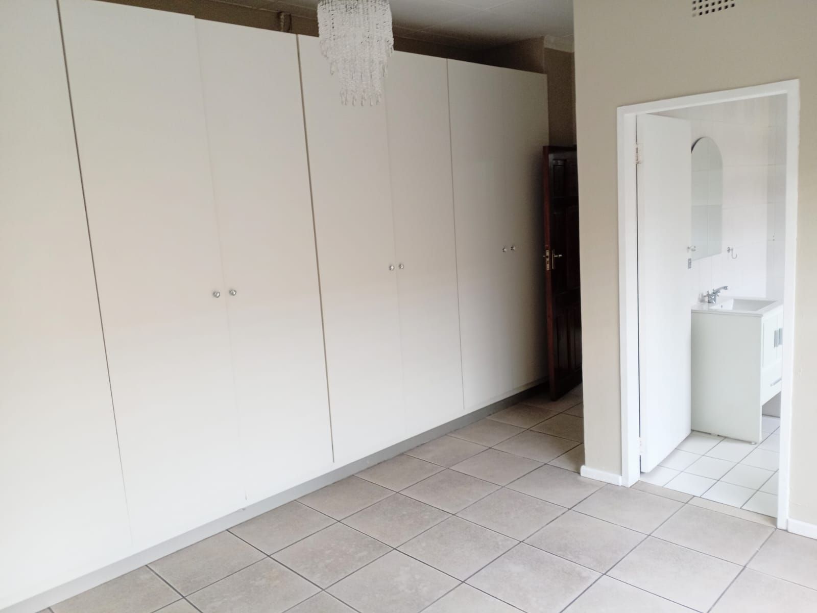 Spacious and serene, this bedroom offers an en-suite with shower, basin, and toilet, built-in cupboards, glossy flooring, aircon, a crystal chandelier, and fittings in place to accommodate an additional bathtub.