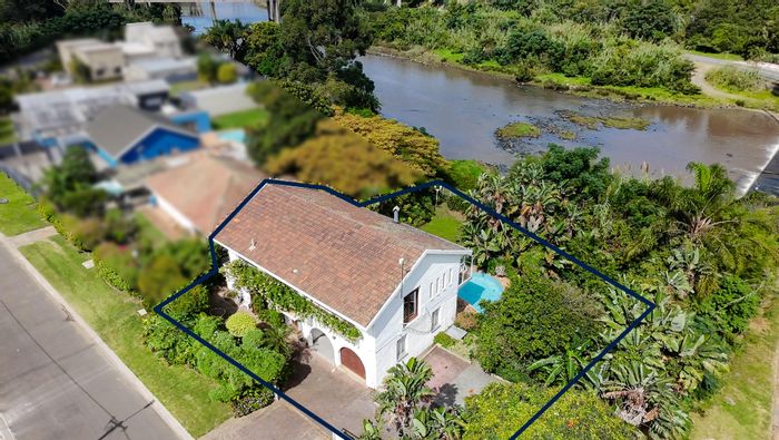 Riverside family retreat in Abbotsford offering relaxed riverfront living, modern kitchen and atrium-lit lounge, pool with direct Nahoon River access — six bedrooms, five bathrooms, two garages.