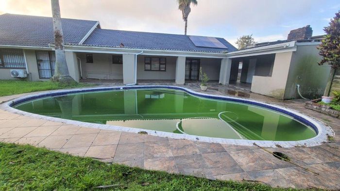 Peaceful family retreat in upmarket Beacon Bay, set in a leafy park-like garden; covered entertainment and braai area overlooks a swimming pool — four bedrooms, three baths, single garage.