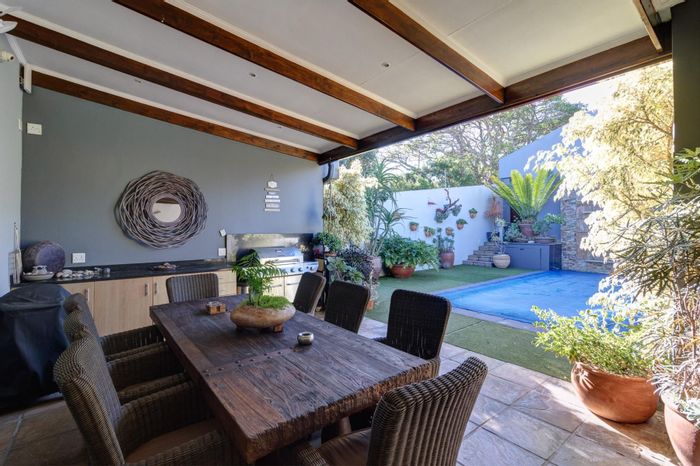 Coastal living with sweeping ocean and Kleinemonde river-mouth views, ideal for family entertaining around the pool and garden with bar/braai room; five bedrooms, three bathrooms.