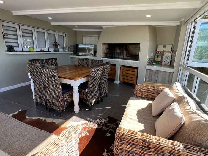 Entertainer's coastal retreat in Jeffreys Bay with sweeping ocean views, sunset splash pool and braai room, landscaped gardens — four bedrooms, 4.5 baths and two garages.
