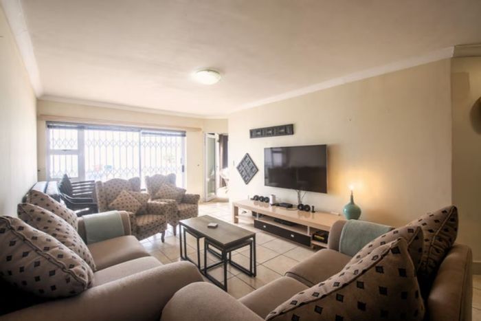 Coastal lifestyle on Jeffreys Bay's main beach, with uninterrupted sea views and a sheltered balcony — turnkey 3-bed, 3-bath apartment with modern kitchen and secure parking.