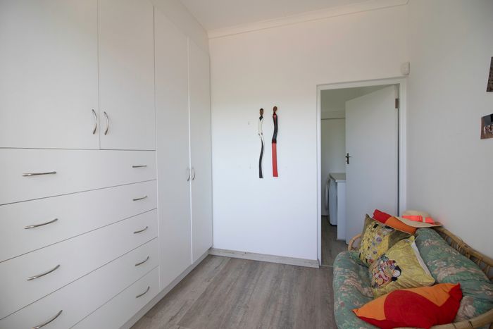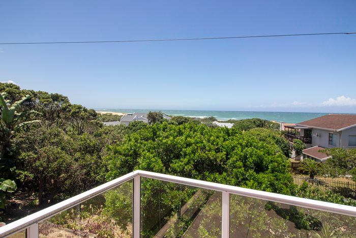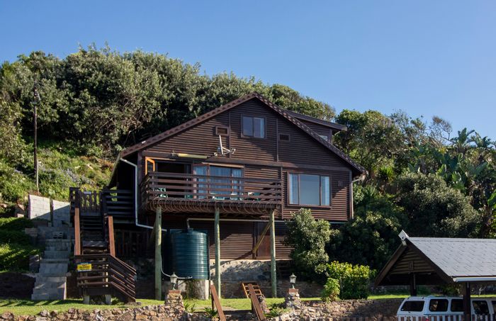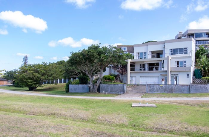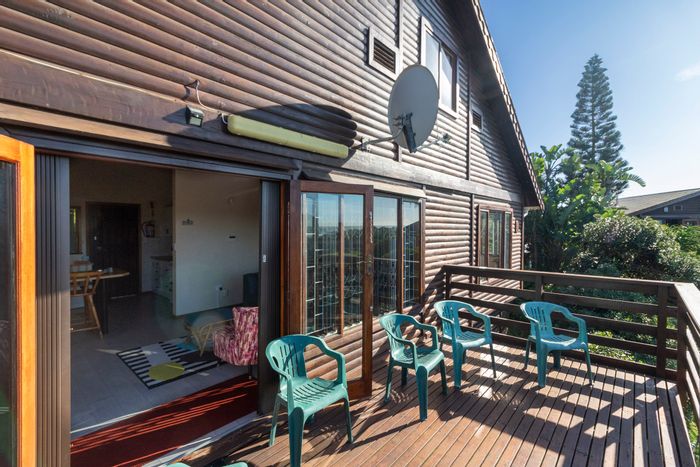 Wake up to sea breezes in Port Alfred Sands beachfront chalet, elevated for sweeping ocean and Kowie River views; private wooden deck, communal pool, three bedrooms and double carport.