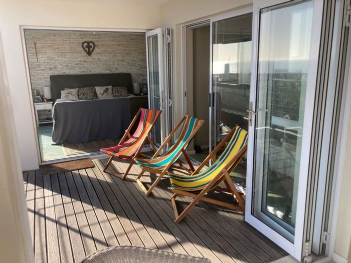 Coastal living steps from a private sandy beach, restaurants and water sports; north-facing apartment with enclosed balcony and braai, garden views — three bedrooms, two baths and lock-up garage.