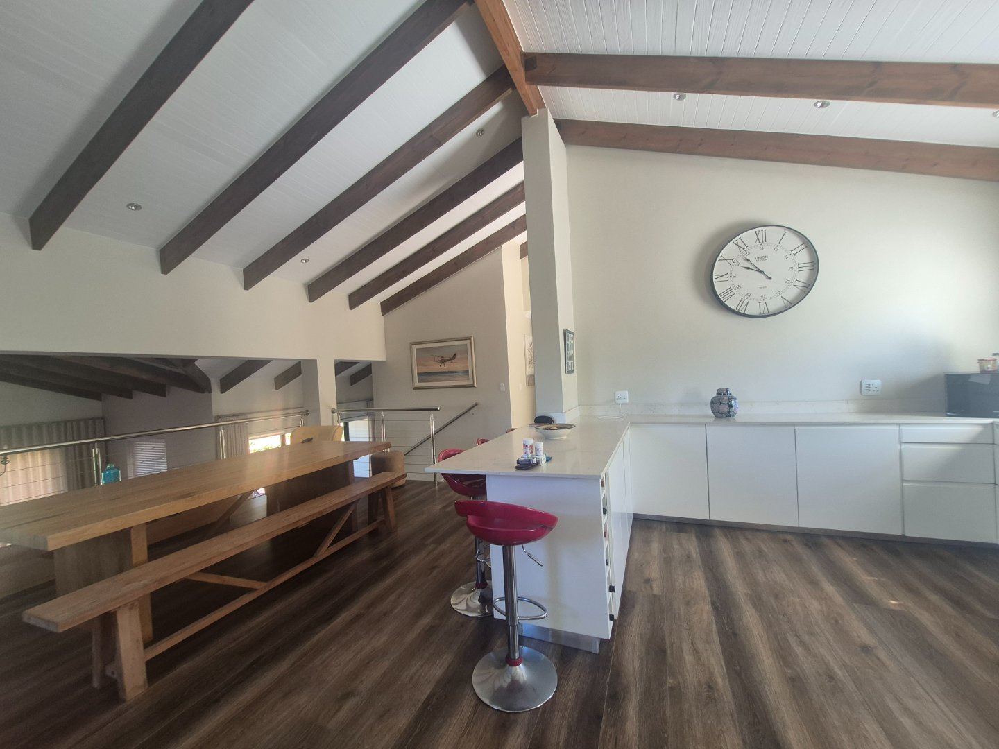 Wide entrance flowing into an open-plan kitchen and mezzanine dining area overlooking the lounge with fireplace. Large scullery with access to double garage and private courtyard.