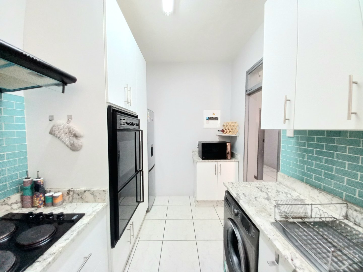 Stylish kitchen with granite tops, electric stove, extractor, eye-level oven, space for front loader