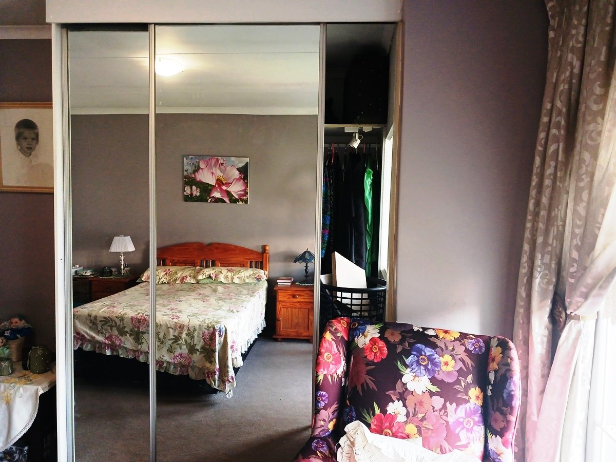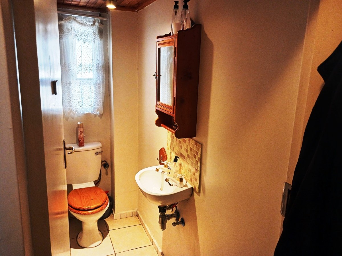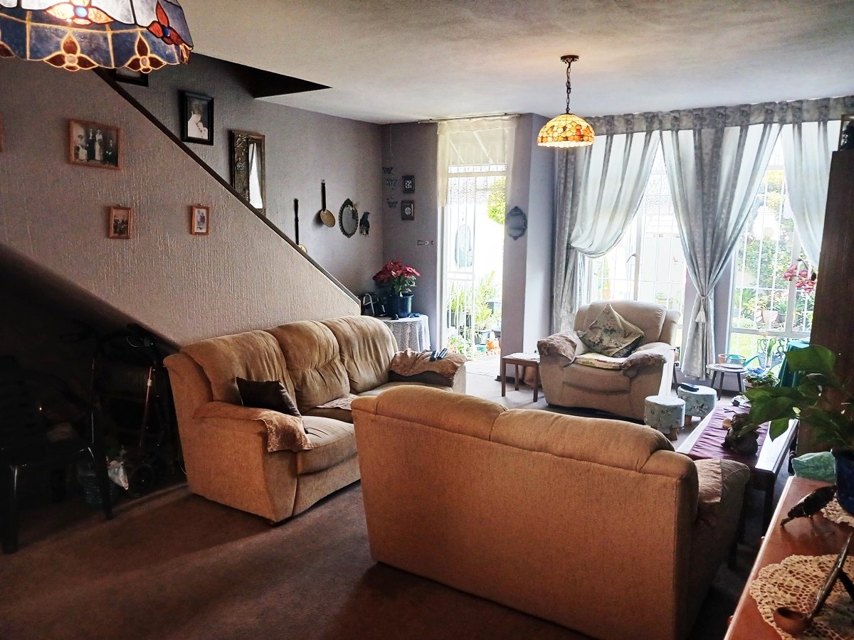 The downstairs area features a spacious lounge and a separate dining room, both with cozy carpeted flooring. The guest toilet adds extra convenience for visitors. The kitchen is large and functional, fitted with melamine countertops, an electric oven and hob, and a back door that opens out to a private enclosed courtyard—perfect for laundry or additional storage space.