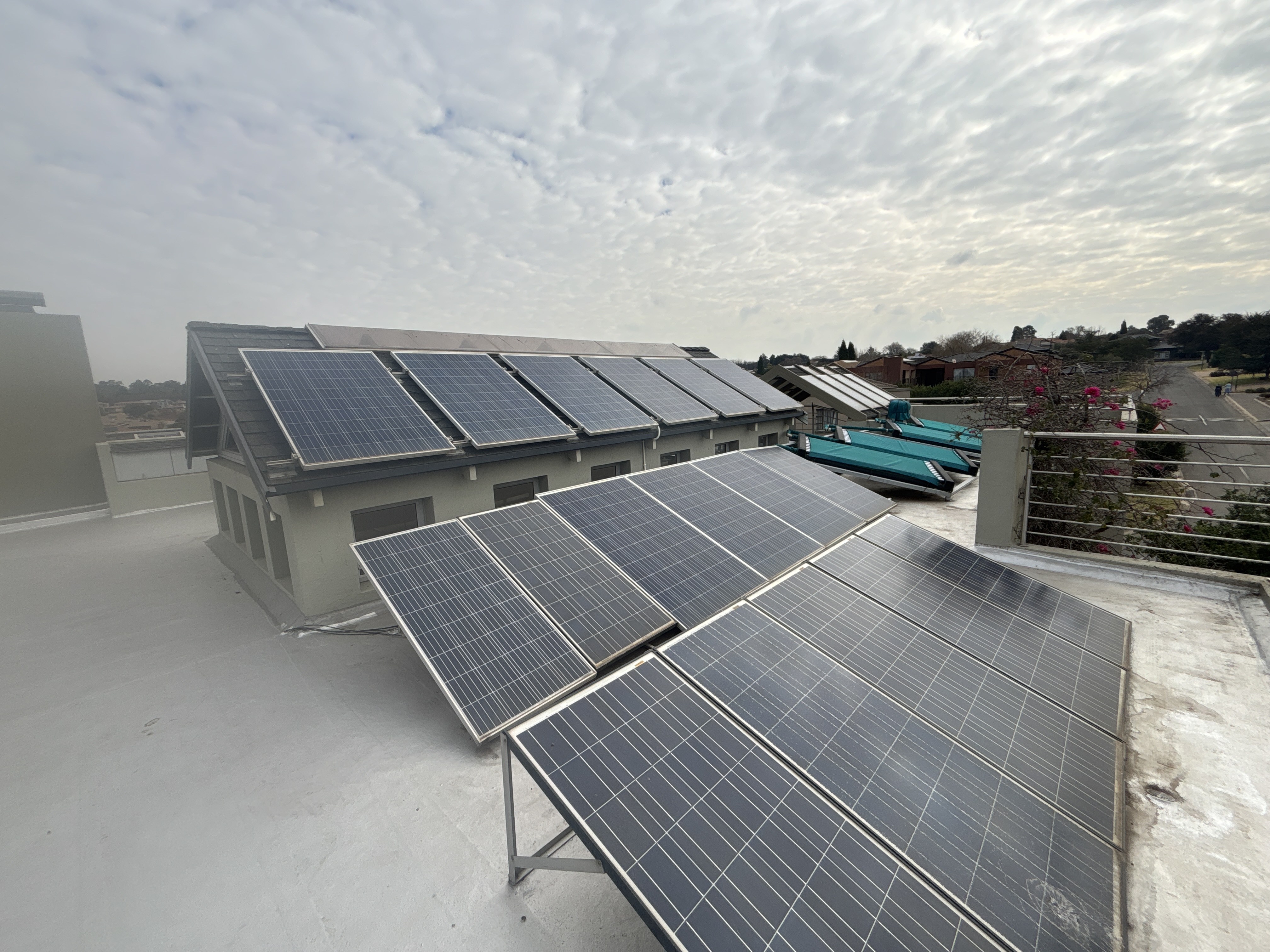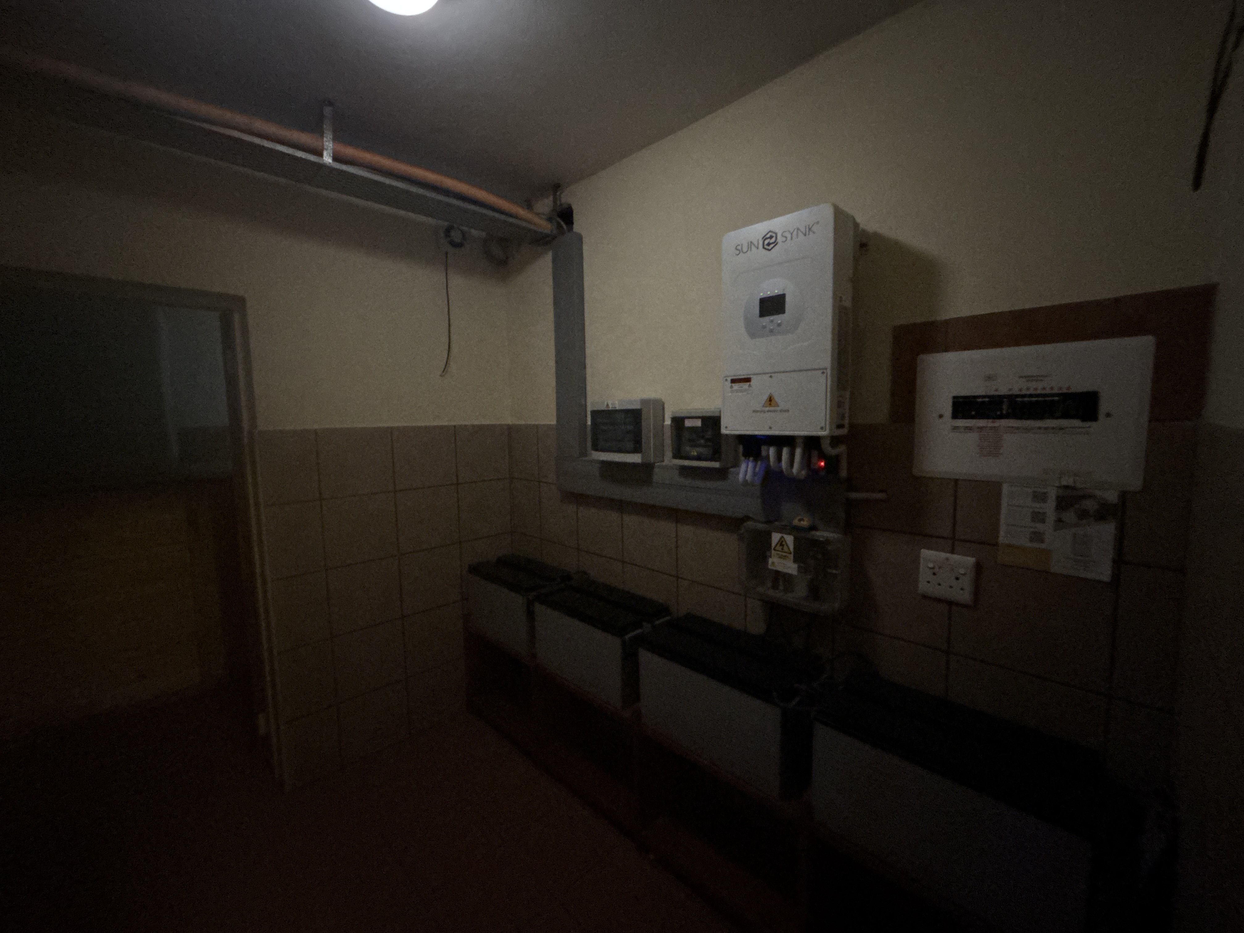 Off-grid solar power system with roof-mounted panels, inverter, and batteries—all safely located in the basement