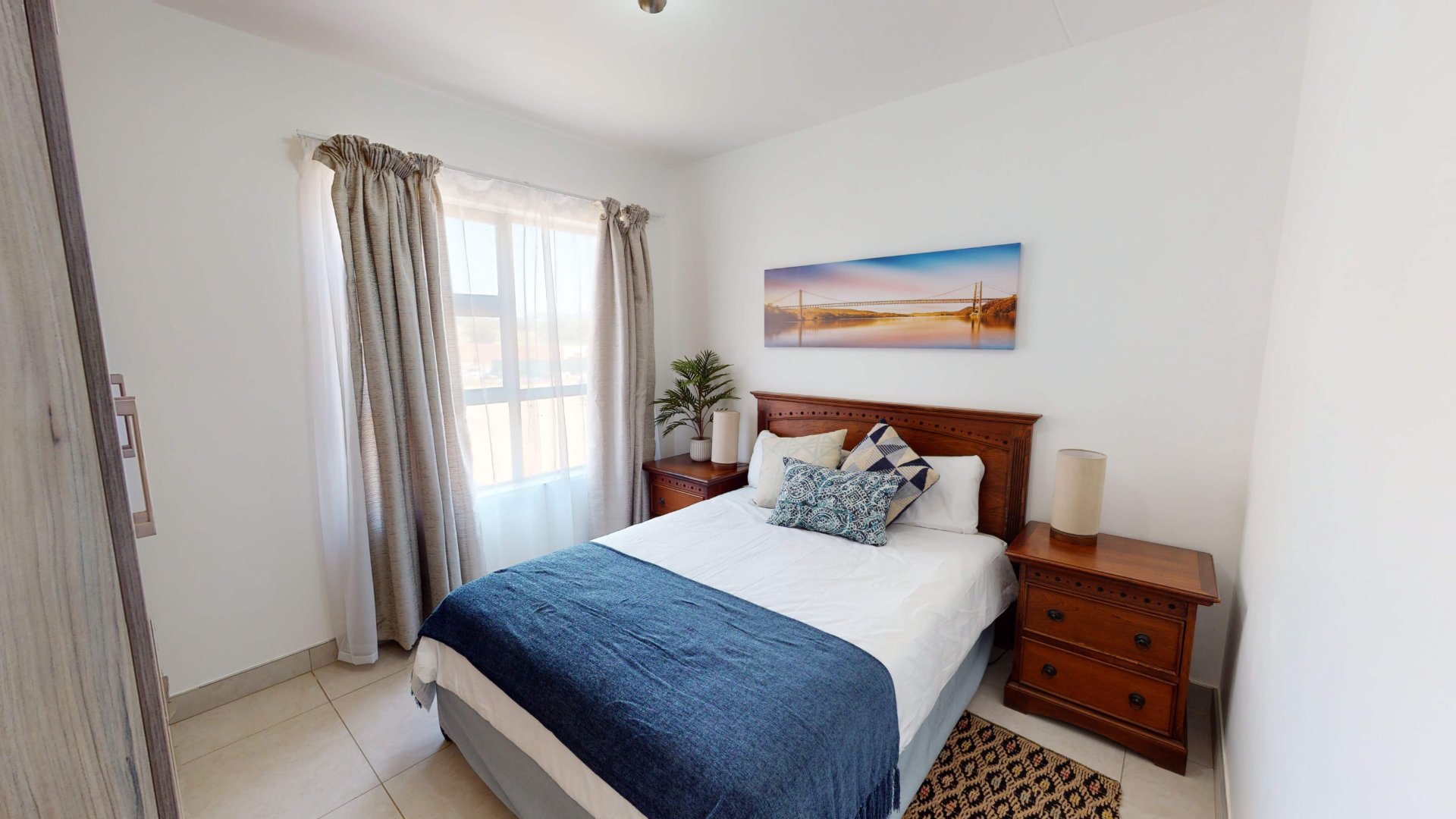 The Bedroom has space for a double bed, built-in cupboards, and a modern tiled floor