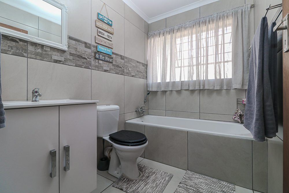 The home offers three sunny bedrooms, each with built-in cupboards, and two well-appointed bathrooms — one with a bath, toilet, and basin, and the main ensuite with a shower, toilet, and basin. The entire home is fully tiled for a clean, cohesive look.
