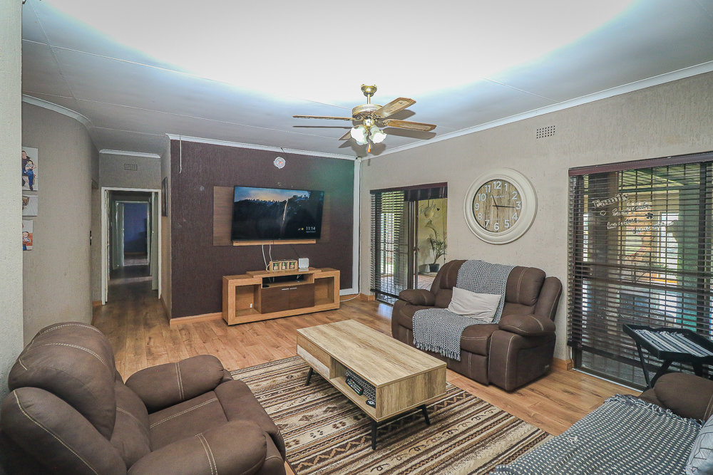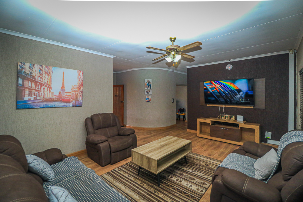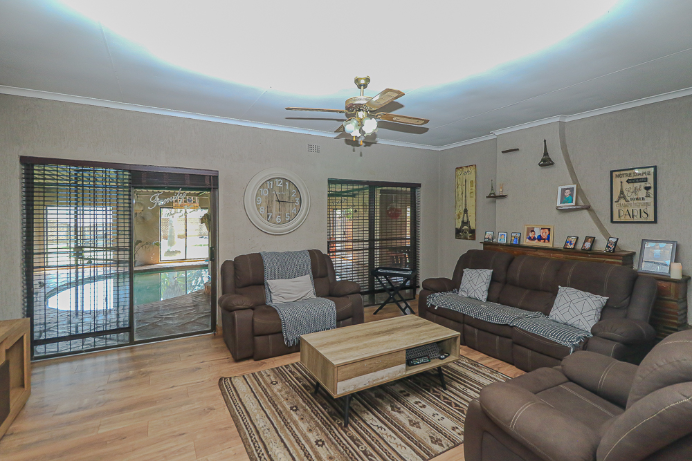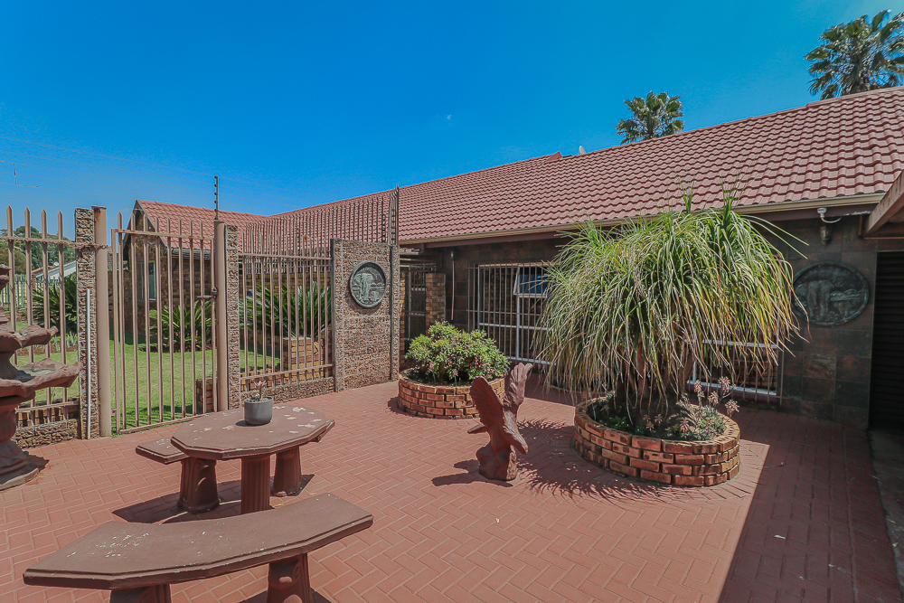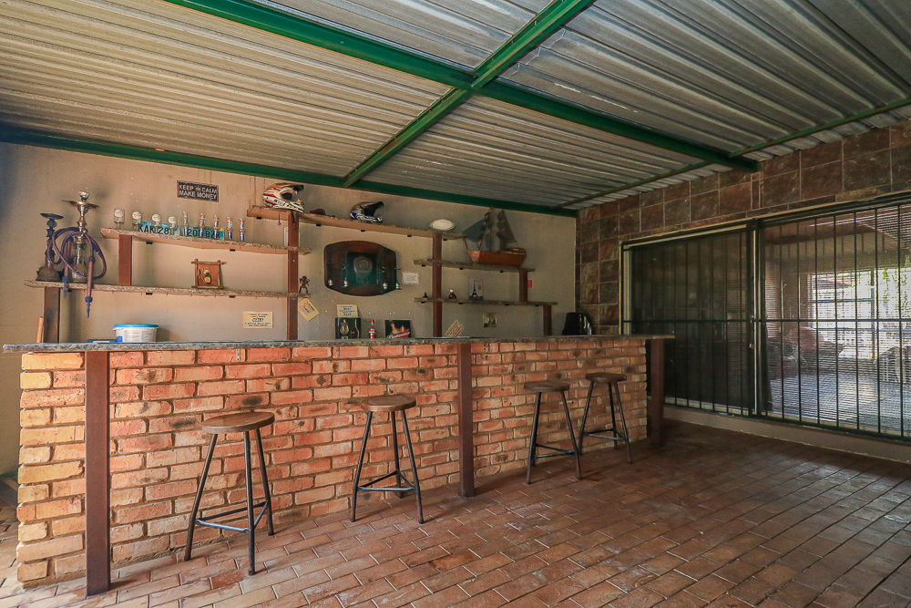 Practical touches enhance everyday living, including a double garage, double carport, and excellent security with an electric fence, alarm system, 12 cameras, and full burglar proofing. The home also features a borehole with JoJo tank, prepaid electricity, fibre internet, and a tiled roof. A wide front patio sets the tone for relaxed mornings or sunset gatherings.