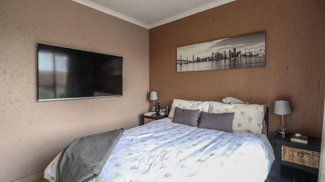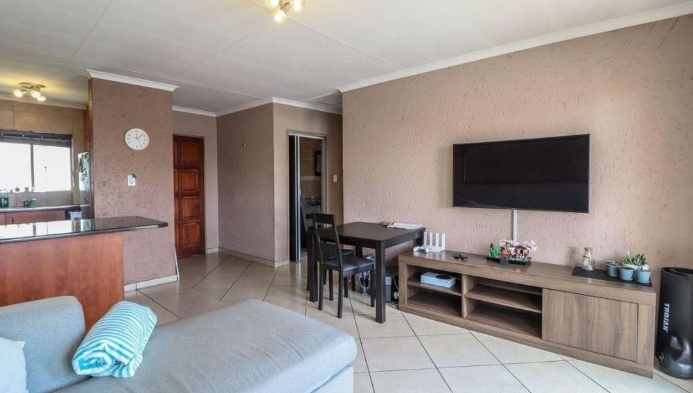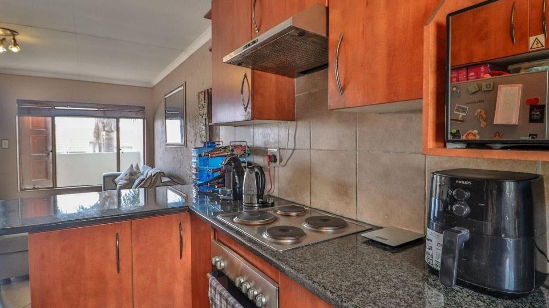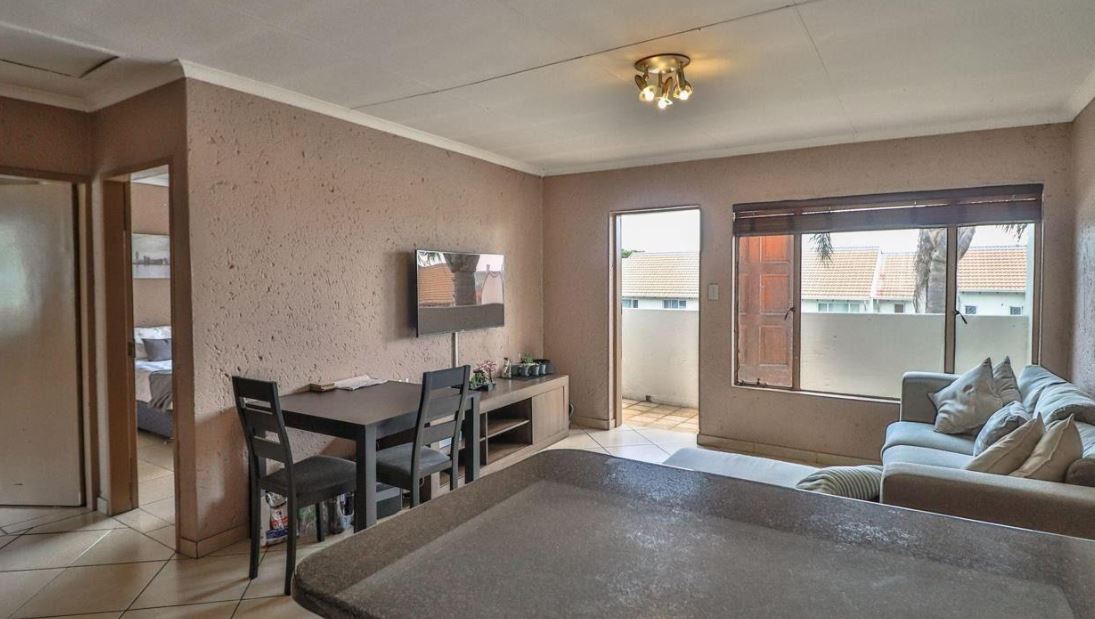 The apartment features two well-sized bedrooms, both with tiled floors and generous built-in cupboards. The family bathroom is fully tiled and includes a bath, toilet, and basin. The open-plan lounge area is tiled and leads to a cozy private balcony – perfect for enjoying your morning coffee or relaxing in the evening. The open-plan kitchen offers ample cupboard space, a breakfast nook, and is fitted with an electric stove, oven, and extractor fan.