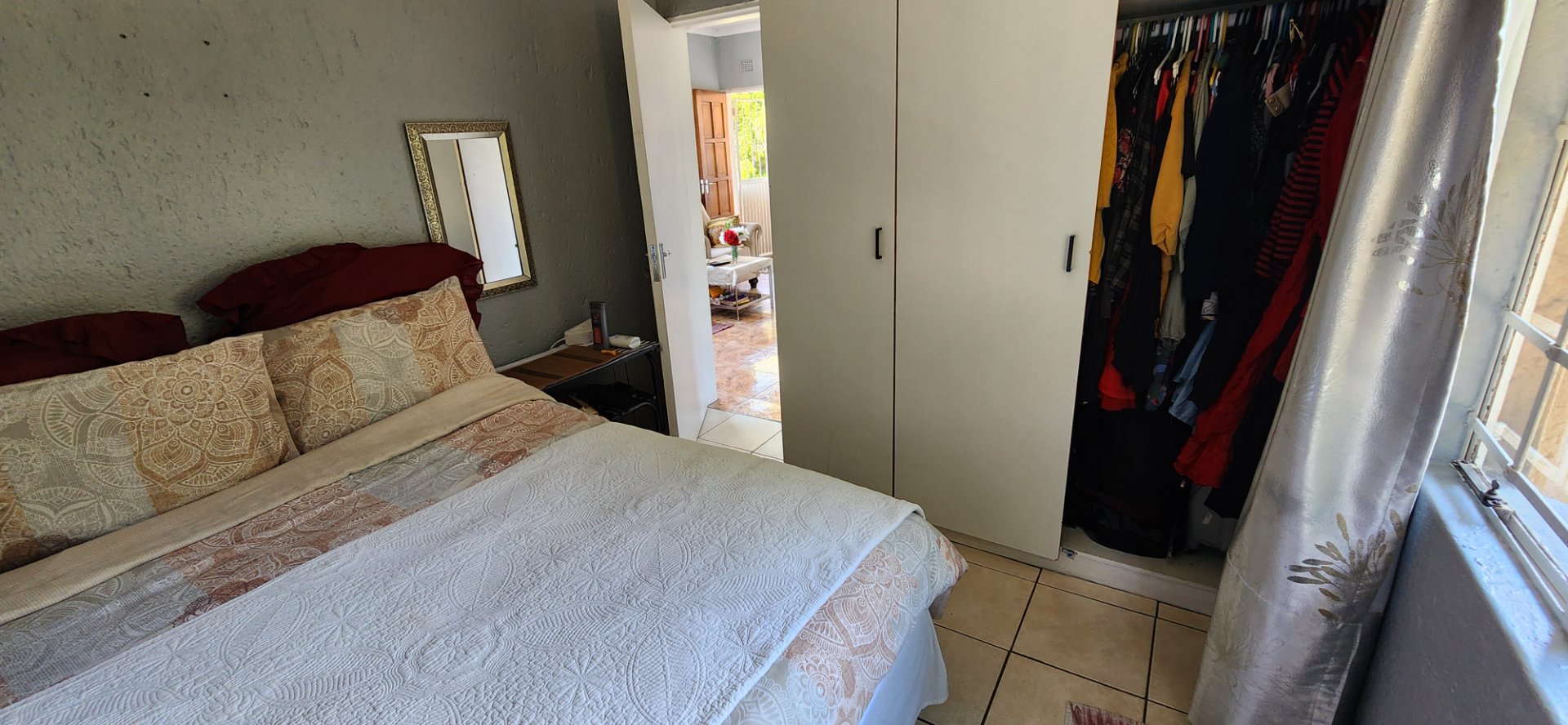 The apartment features two generous, sun-filled bedrooms with built-in cupboards, a neat bathroom, and a functional open-plan kitchen and lounge designed for easy, comfortable living. The kitchen offers ample cupboard space and room for appliances.