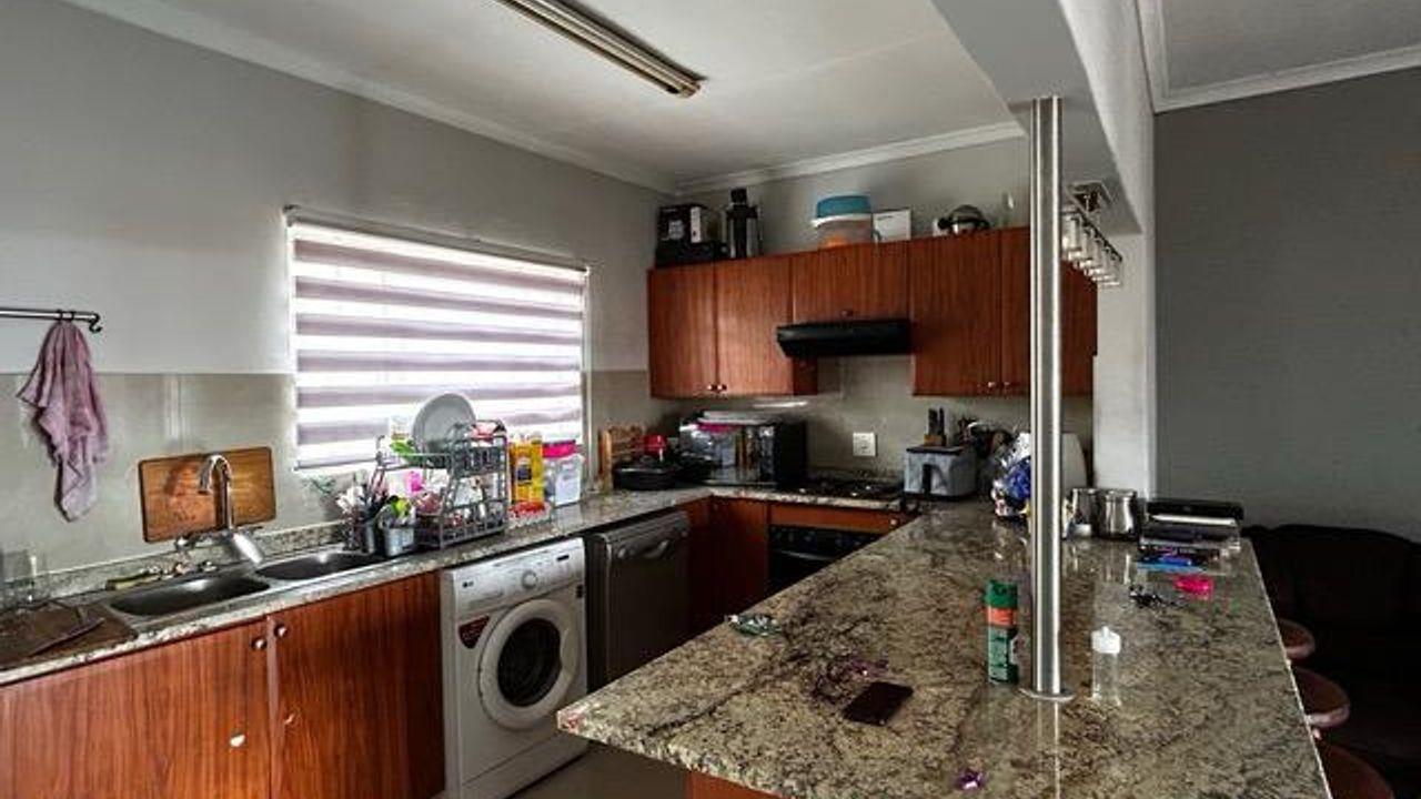 Modern open plan kitchen with marble counter tops, breakfast bar, space for a double door fridge and space for two under counter appliances. Ample Cupboard and counter space.
