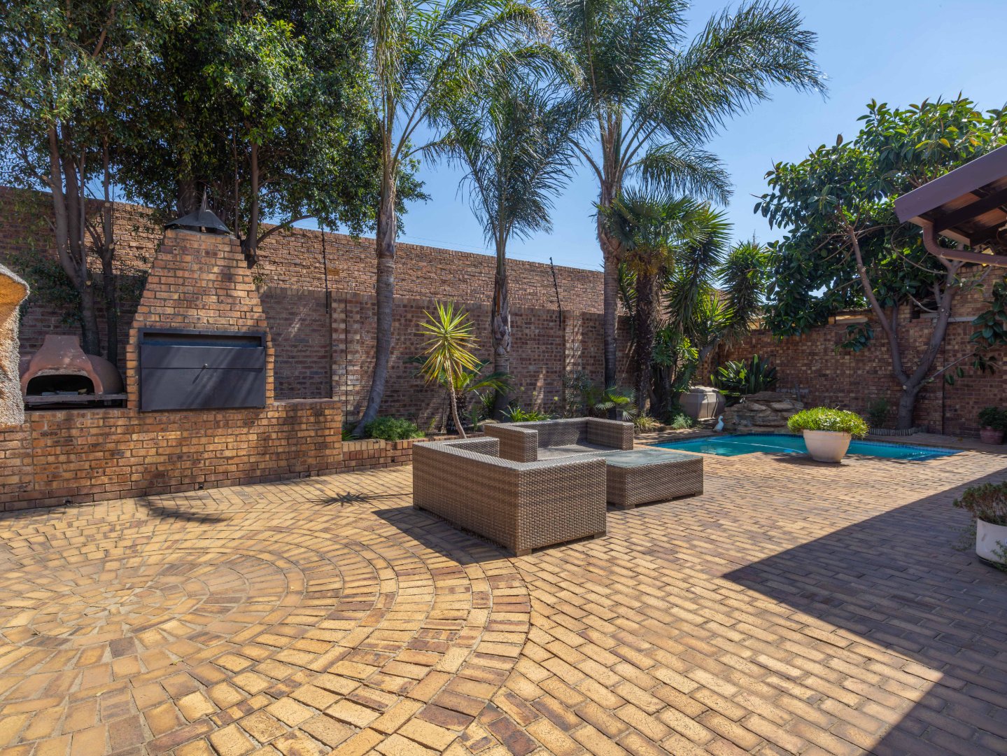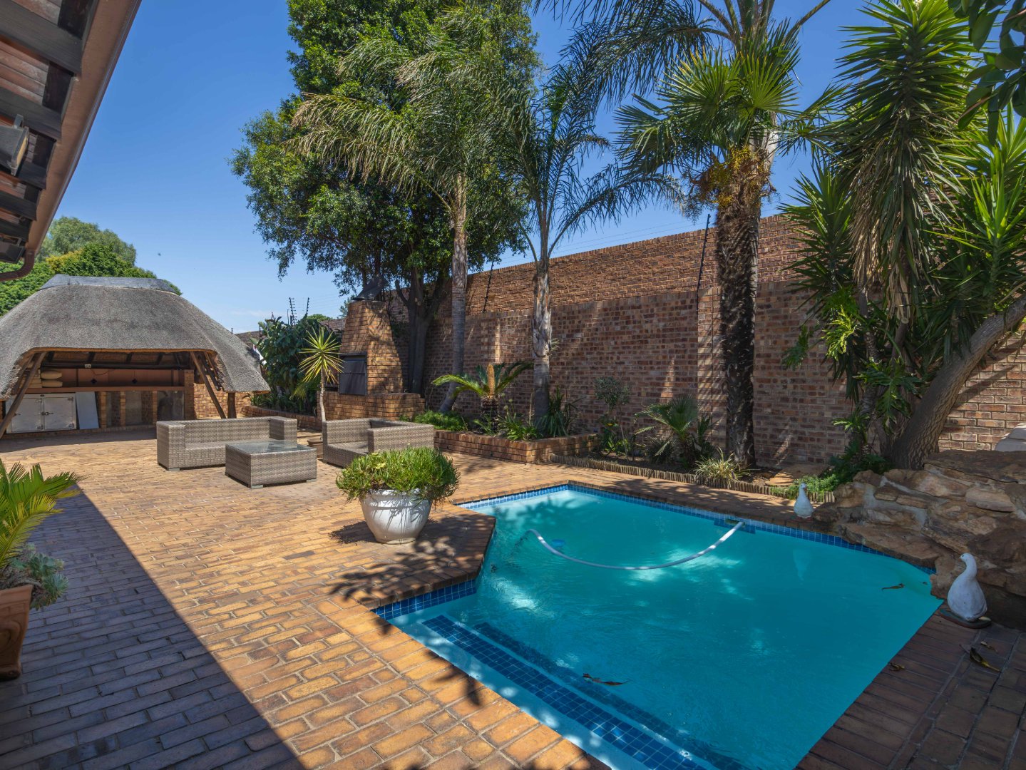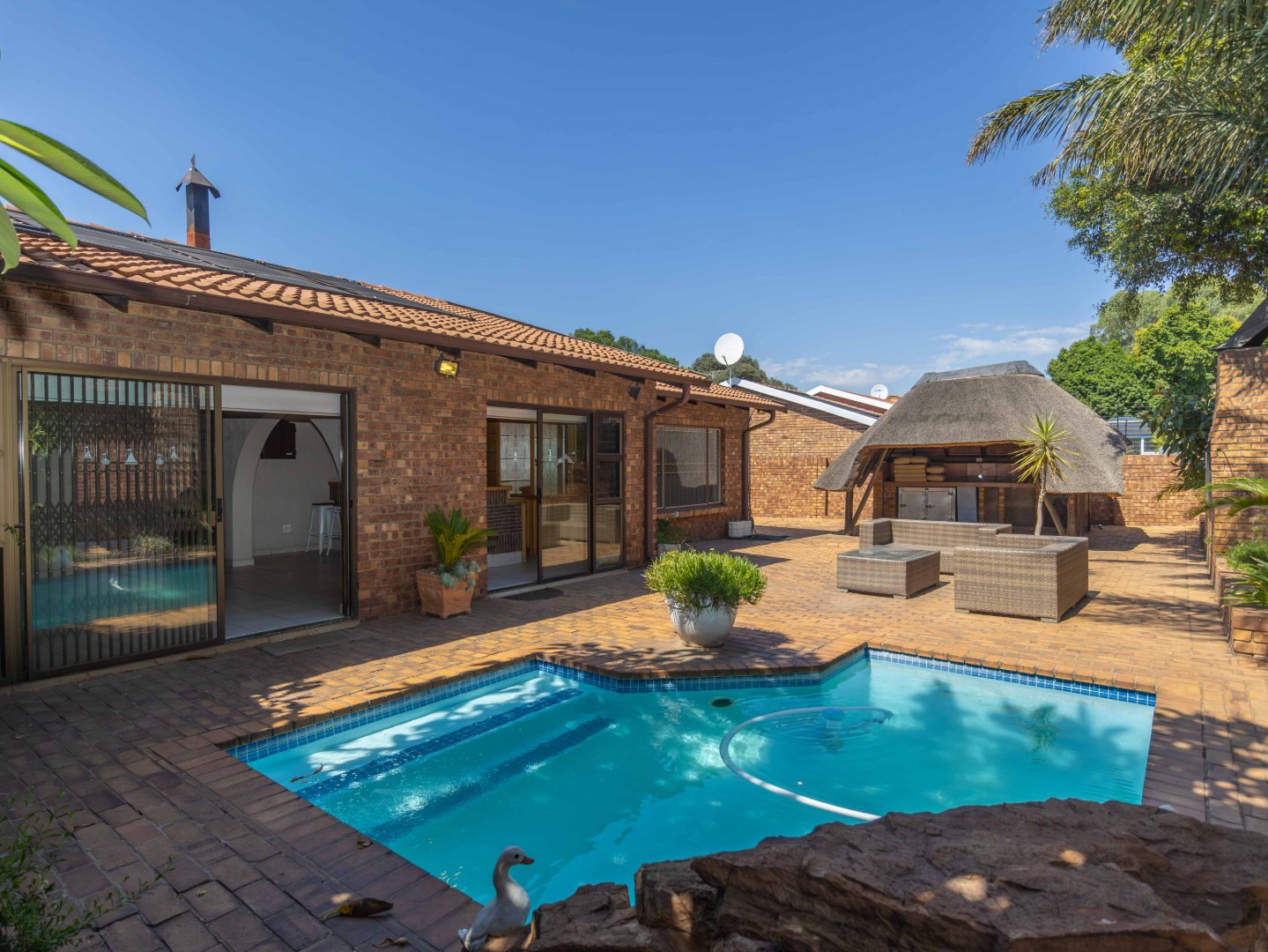 The inviting lounge area features a cozy fireplace and leads into a large, solid wood bar—ideal for entertaining guests. This space could easily be converted into another bedroom or office to suit your needs. Both living areas open onto a beautifully landscaped low maintenance garden, perfect for hosting guests. The home also offers a built-in braai, pizza oven and a thatched lapa with a sparkling solar heated swimming pool. A handy storage shed adds convenience.
