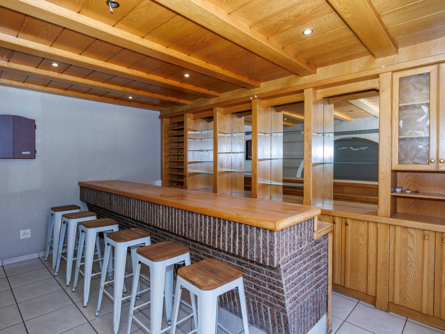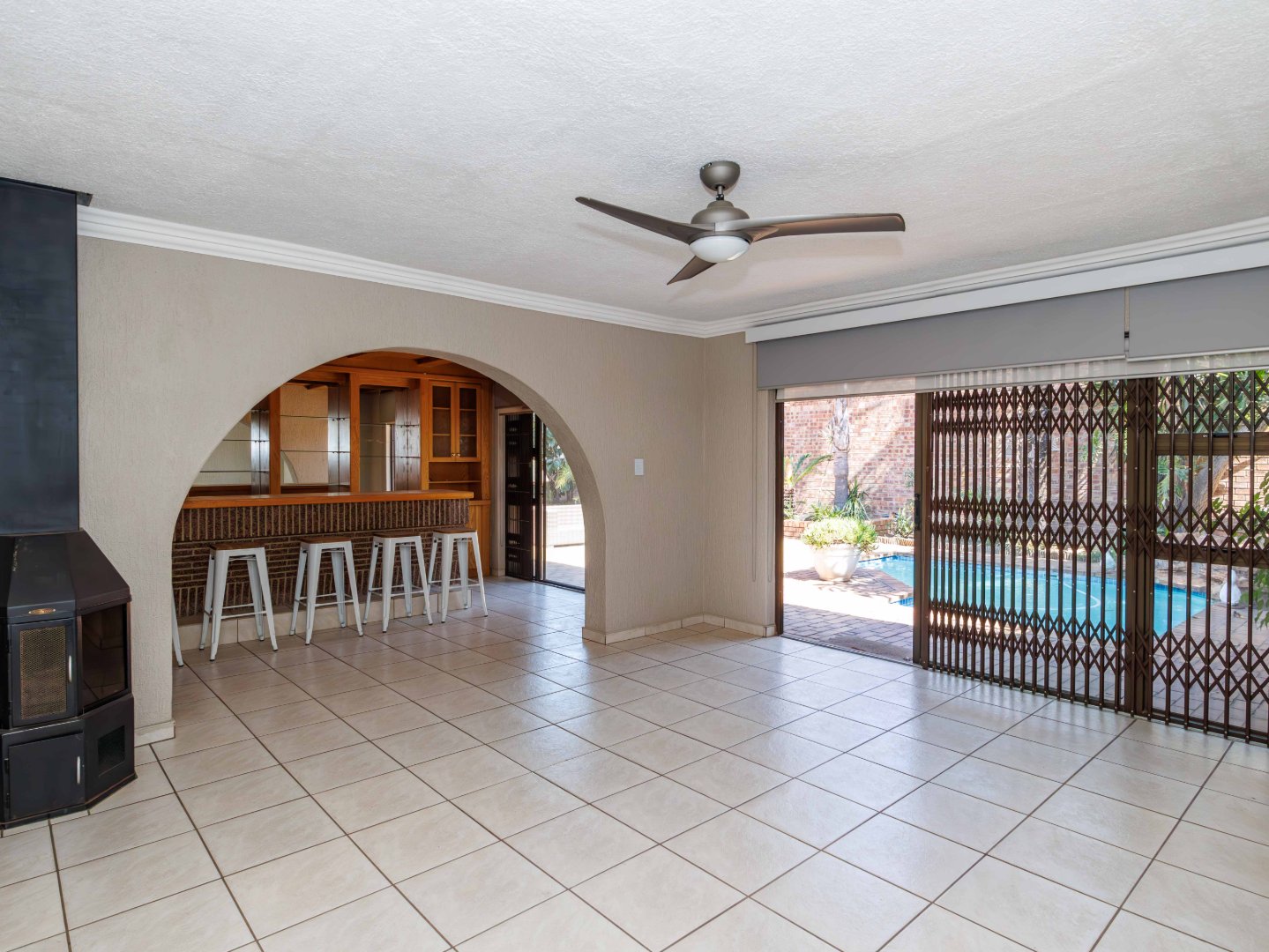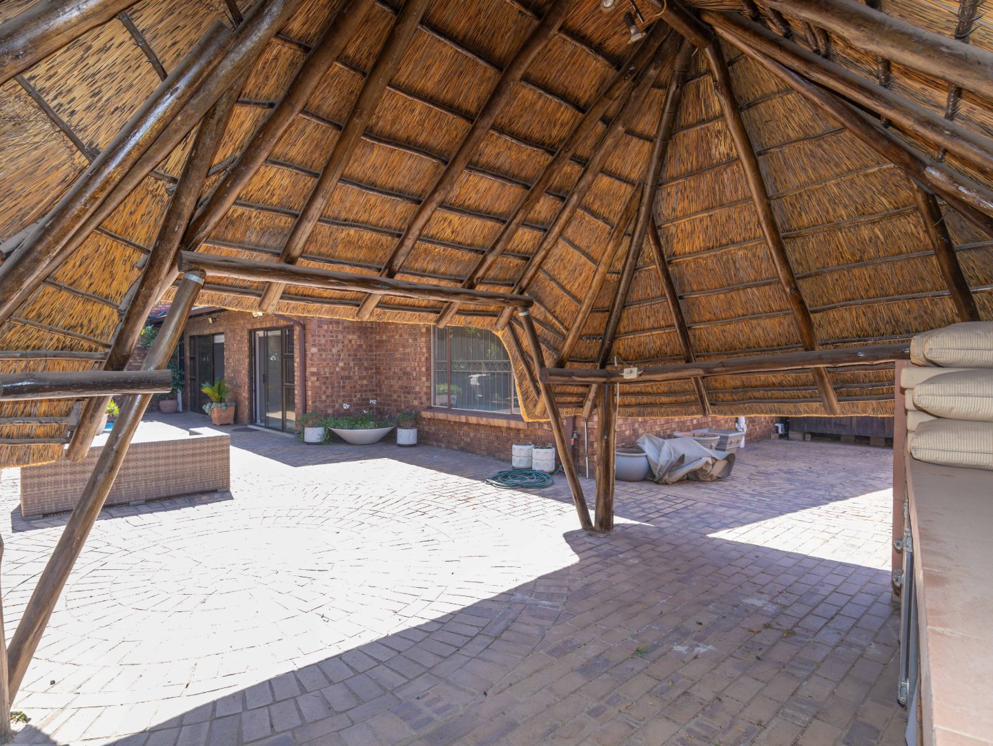The inviting lounge area features a cozy fireplace and leads into a large, solid wood bar—ideal for entertaining guests. This space could easily be converted into another bedroom or office to suit your needs. Both living areas open onto a beautifully landscaped low maintenance garden, perfect for hosting guests. The home also offers a built-in braai, pizza oven and a thatched lapa with a sparkling solar heated swimming pool. A handy storage shed adds convenience.