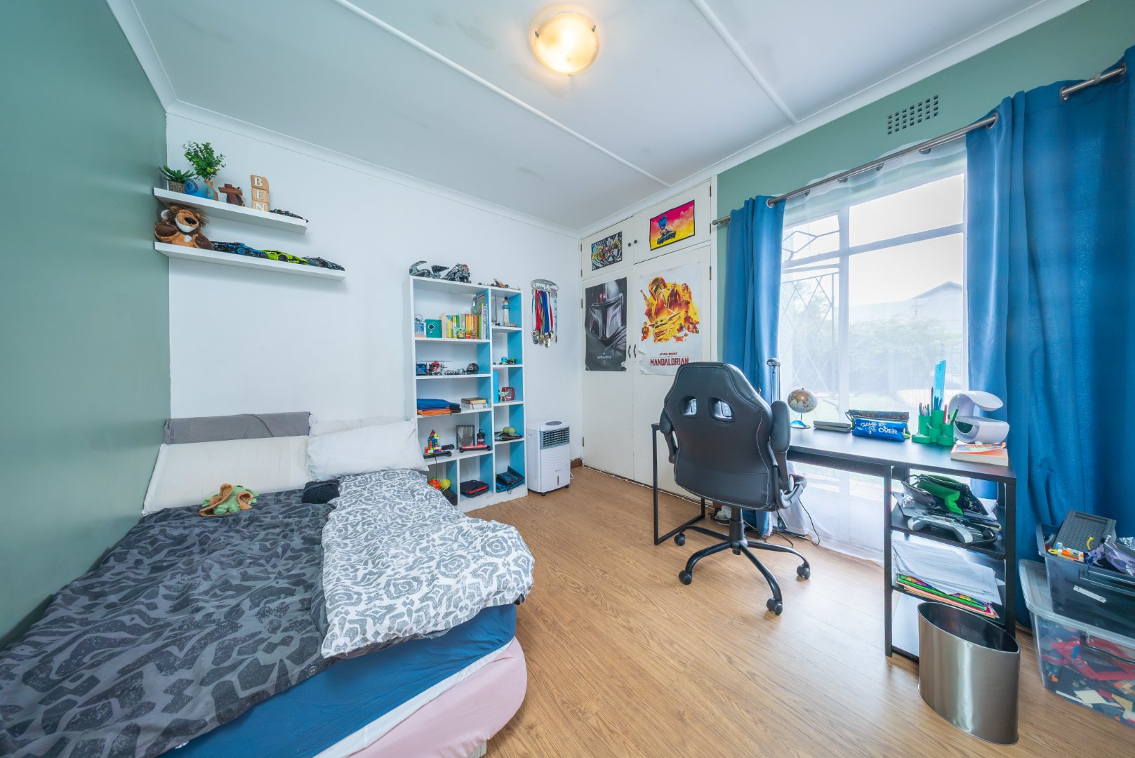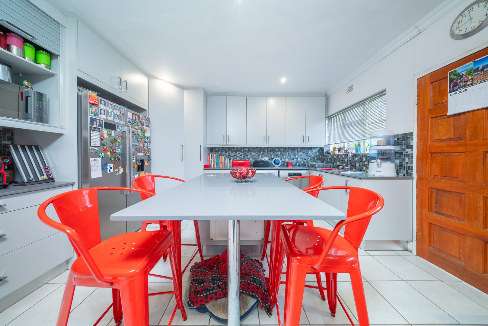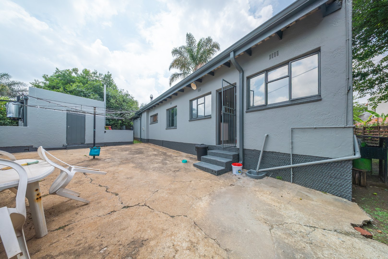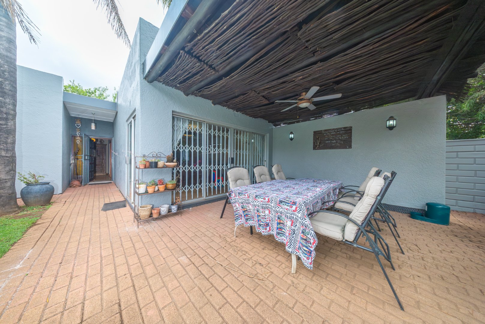 The expansive kitchen is a true highlight, featuring generous cupboard space, Caesarstone countertops, a gas stove, and a charming breakfast nook. It opens out to a private courtyard, an outdoor room with its own toilet shower and geyser.