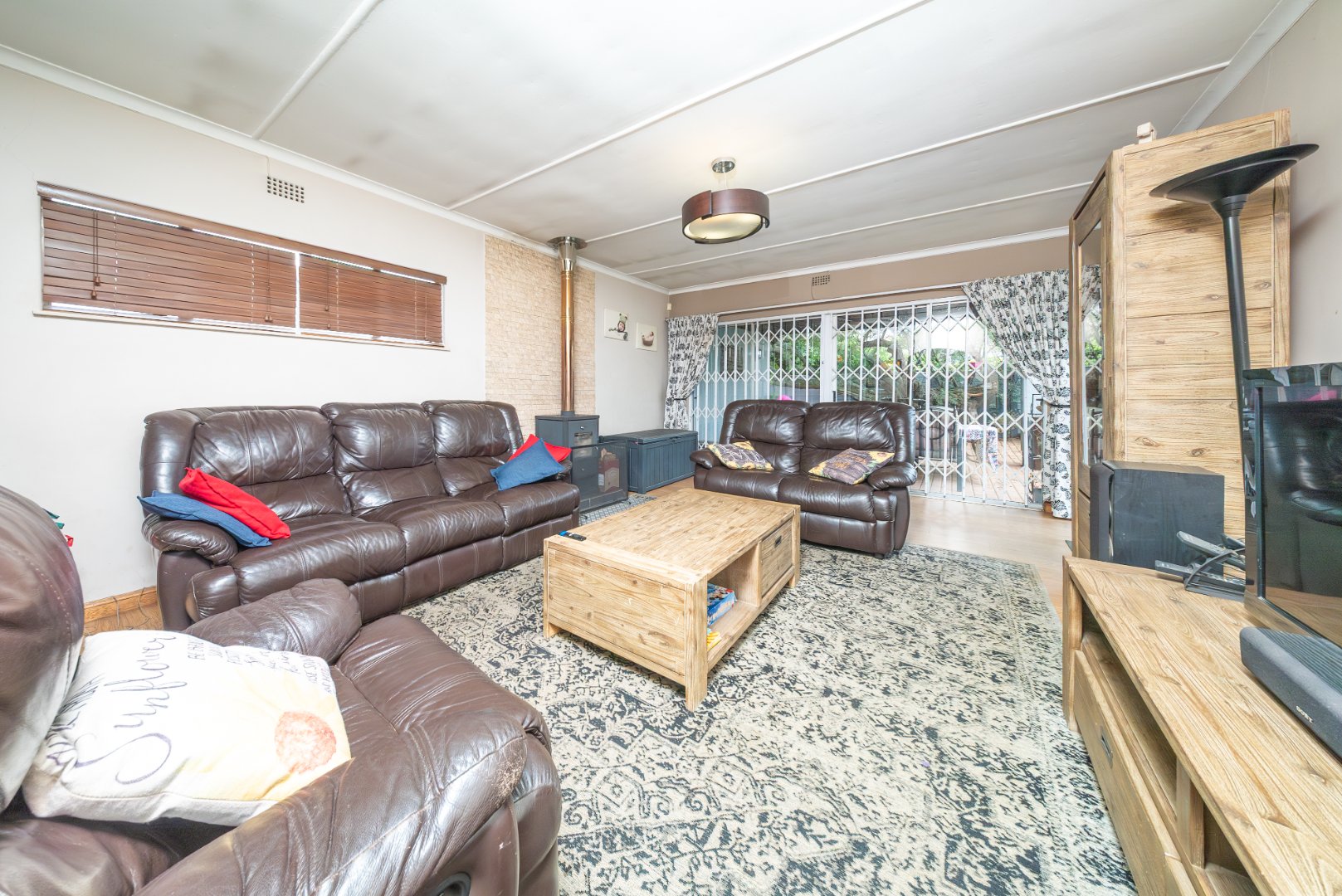 The inviting lounge offers a warm and welcoming ambiance with its wood-burning fireplace, extending onto a covered patio that overlooks a sparkling enclosed swimming pool and a beautifully established garden, ideal for both relaxation and gatherings.