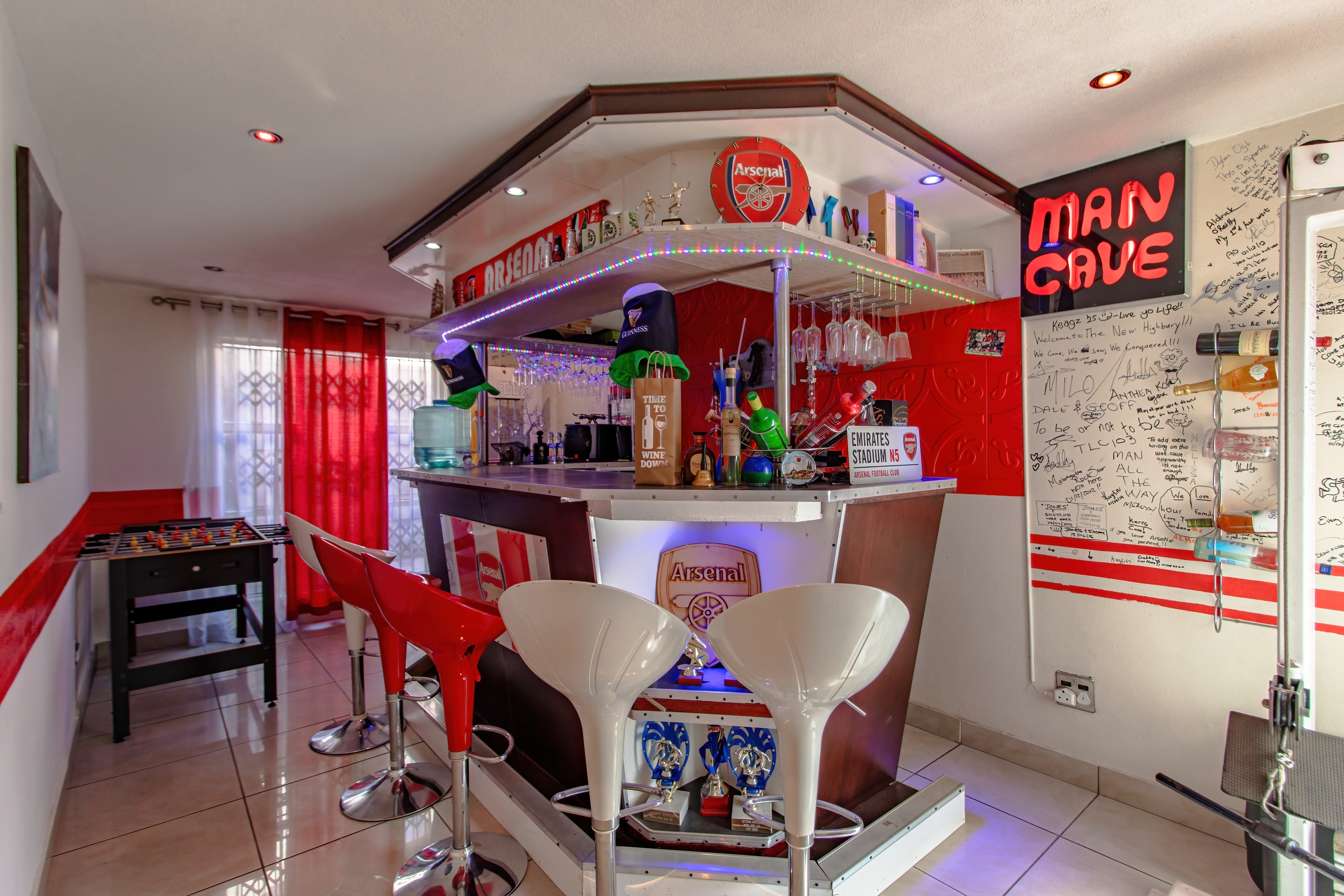 The home boasts an immaculate large open-plan kitchen with sleek white granite waterfall countertops, a built-in dining table, electric oven, and countertop stove—perfect for entertaining. Downstairs you’ll find a spacious guest bedroom with an ensuite bathroom, a guest toilet, and an additional room currently used as a bar, which can easily be converted into a fourth bedroom.