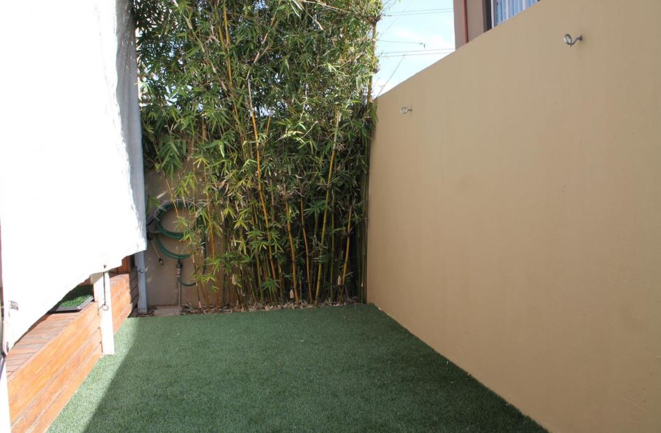 Pet-friendly corner unit featuring private garden with synthetic grass, pavers and wooden deck under retractable awnings
