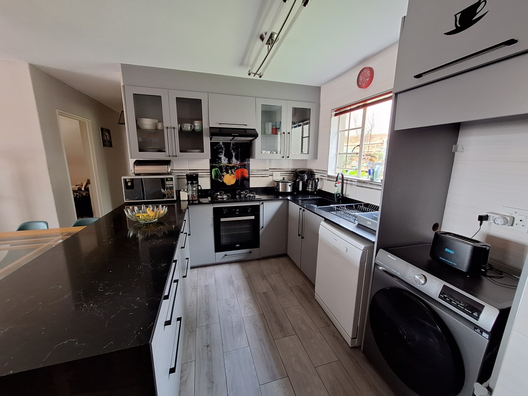 Inside, you’ll find three spacious bedrooms featuring warm laminate flooring throughout. The main bedroom includes a private ensuite bathroom, while the second bathroom is neatly appointed to serve the rest of the home.