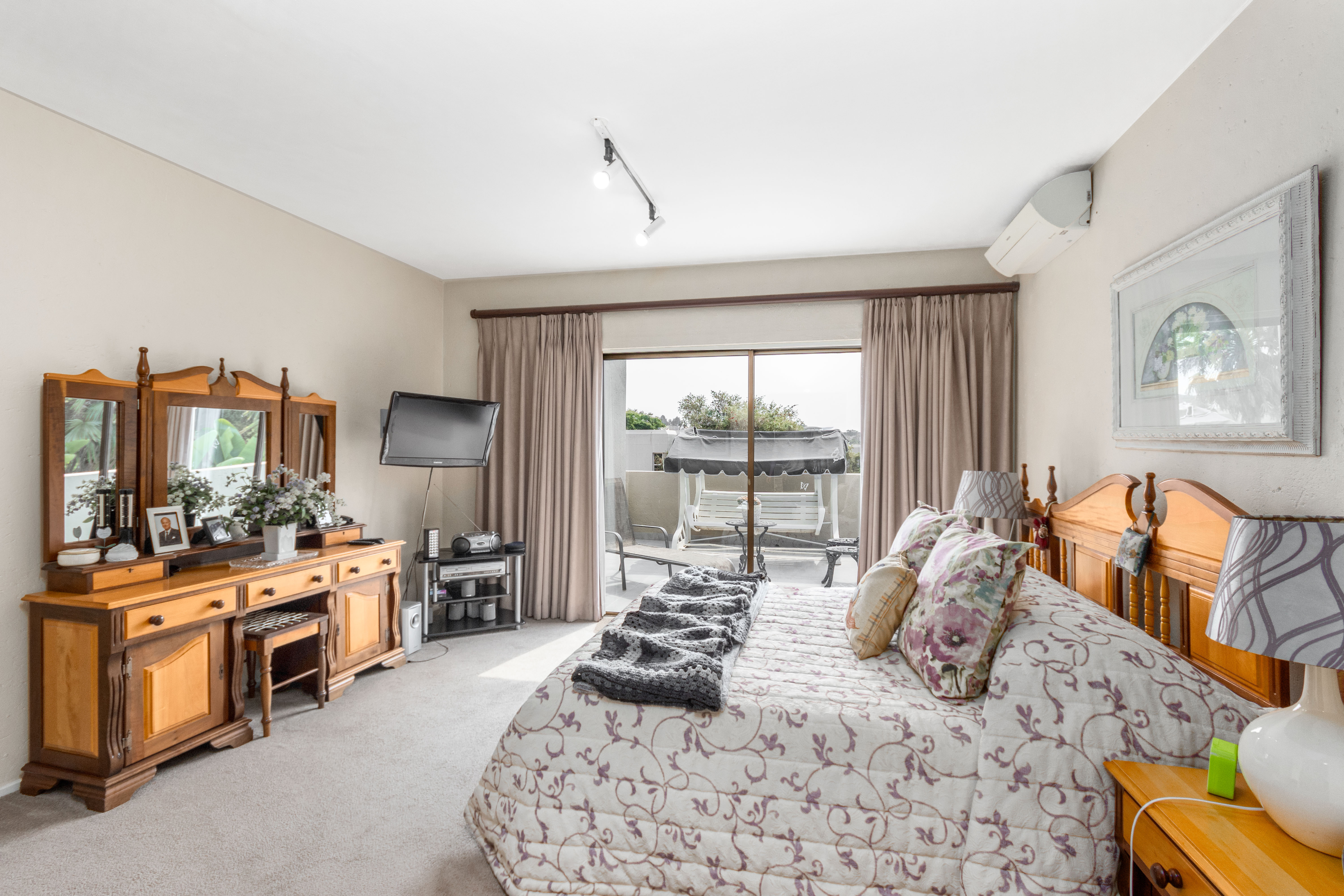 The main bedroom has a dressing room and access to the balcony, with an uninterrupted view of the sunset.