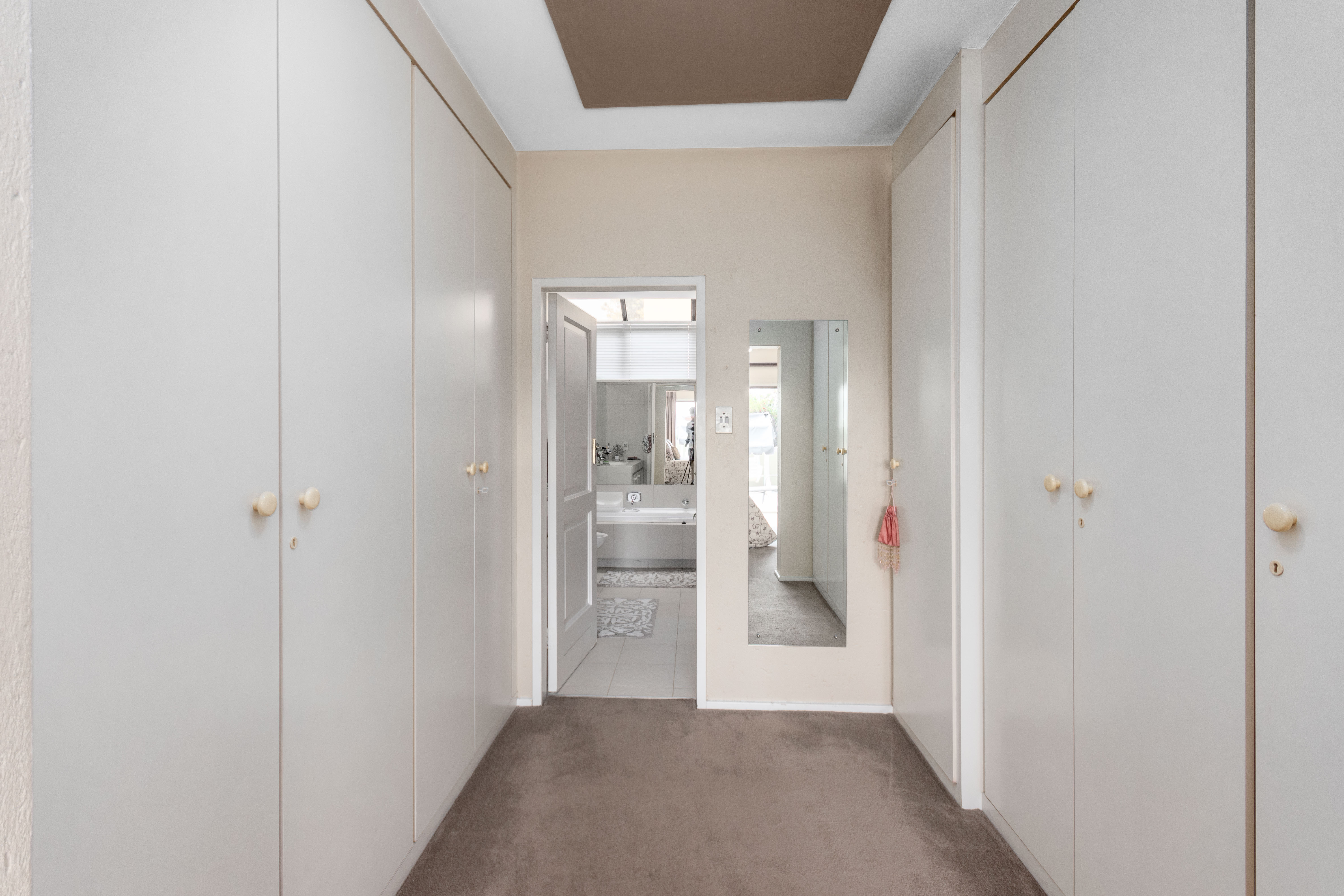Upstairs: 3 double bedrooms with carpets and tons of built-in cupboards, 2 bathrooms, (m.e.s.).