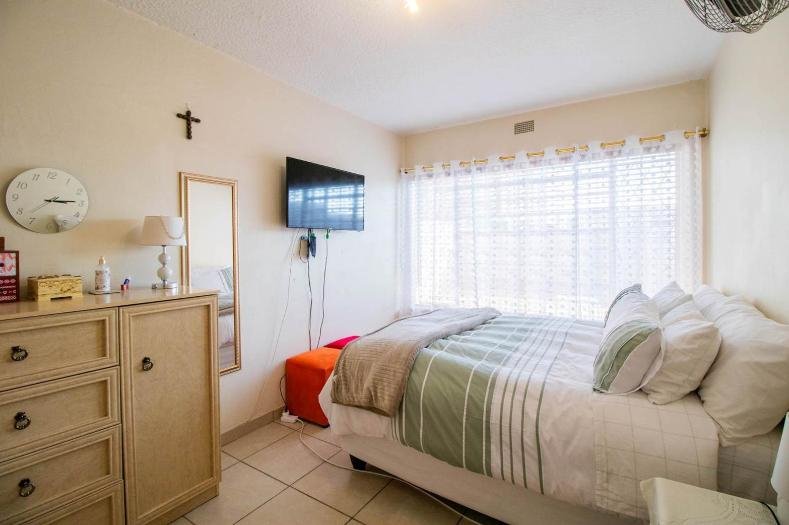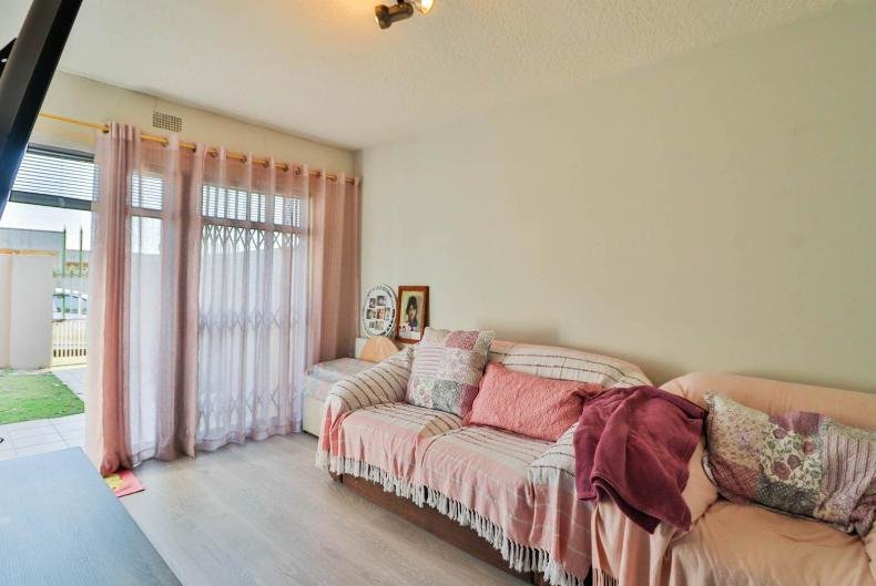 Spacious and sunny lounge leading to a neat garden with a built-in braai