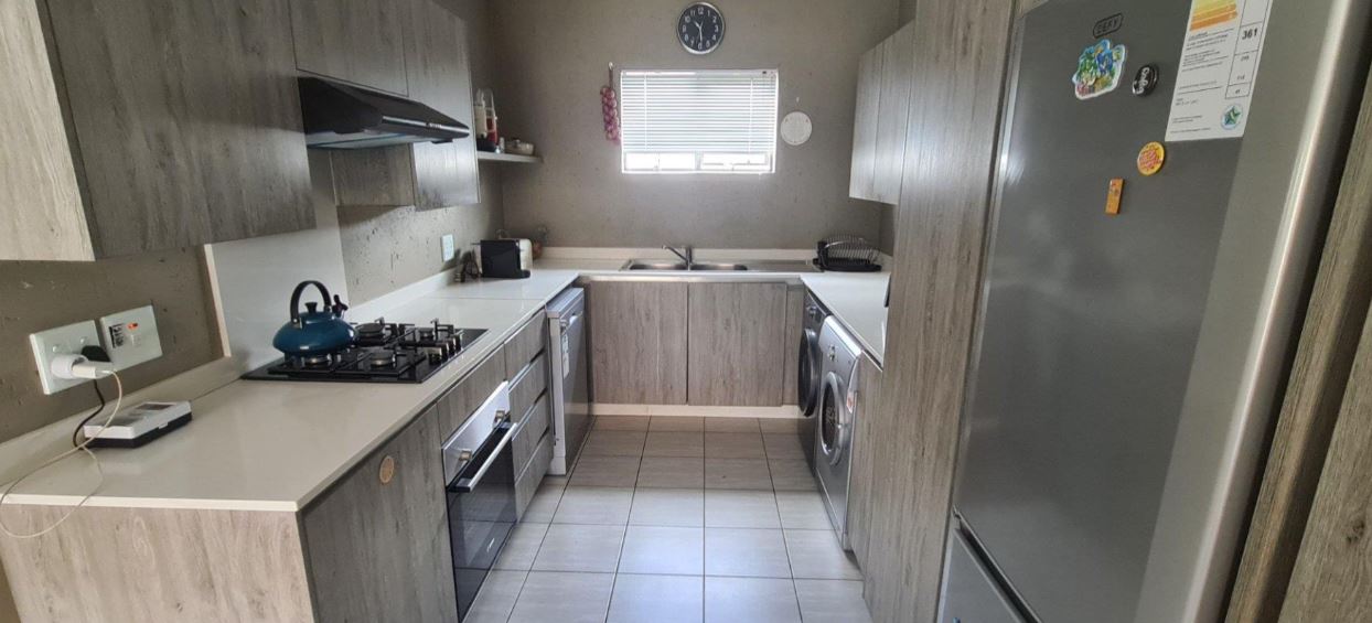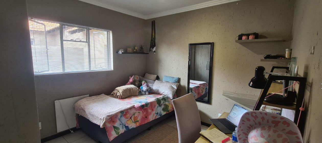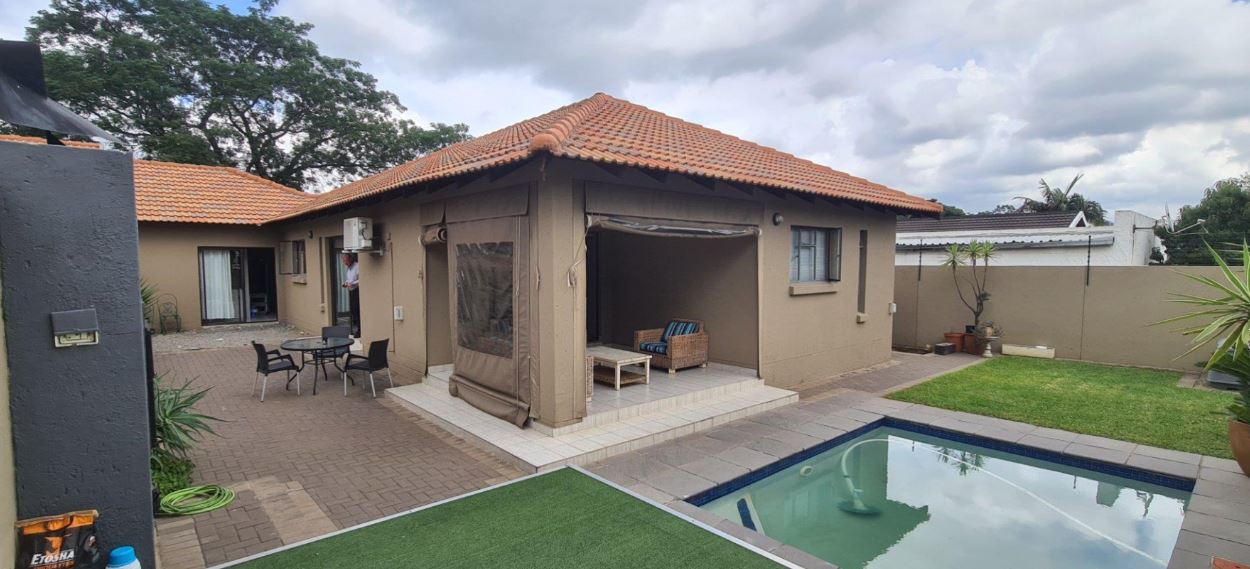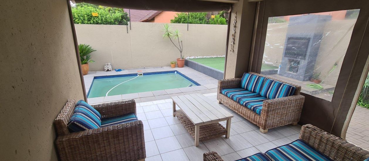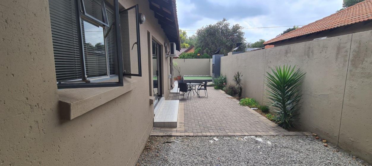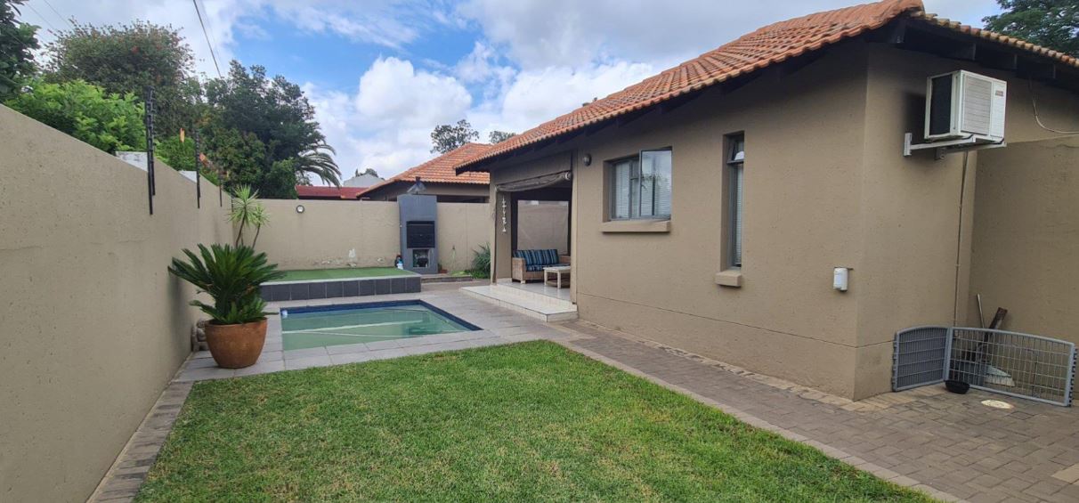 The kitchen is a chef's dream, featuring beautiful quartz countertops, ample cupboards, space for three appliances, a gas hob, stove, and extractor fan! The main bedroom offers tiled floors, built-in cupboards, and air conditioning, plus a tiled ensuite bathroom! Two additional bedrooms, also tiled and with built-in cupboards, share a modern family bathroom! A covered, enclosed patio with blinds extends from the lounge, creating an ideal space for entertaining, while the garden features a built-in braai and a splash pool for those hot summer days! A double garage has been cleverly converted to include a laundry room and spare room, while still offering ample driveway parking, plus a storage room! Security is paramount with electric fencing, beams, an alarm, cameras, and a motorized gate!