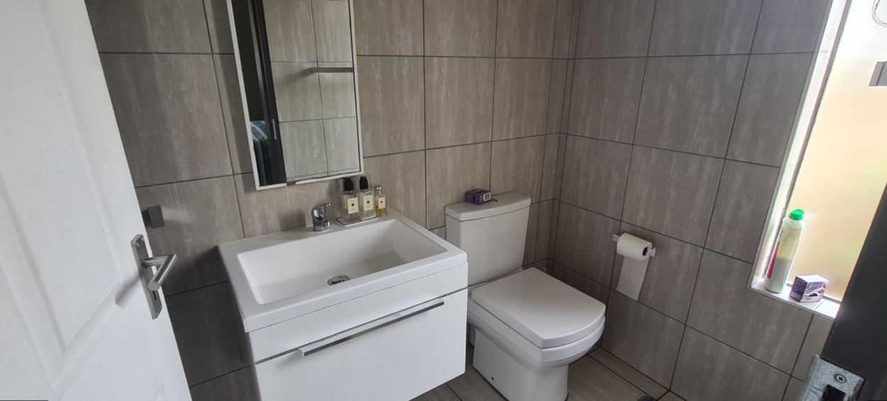 Modern Family Bathroom: Tiled with a basin, toilet, shower, and bath!