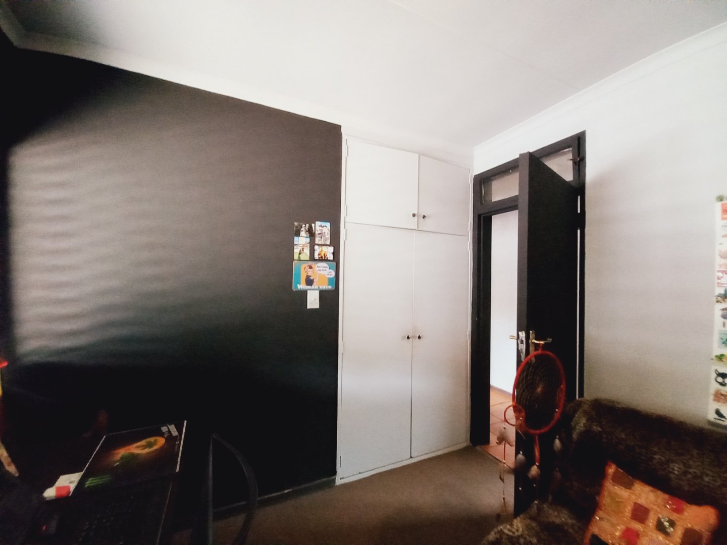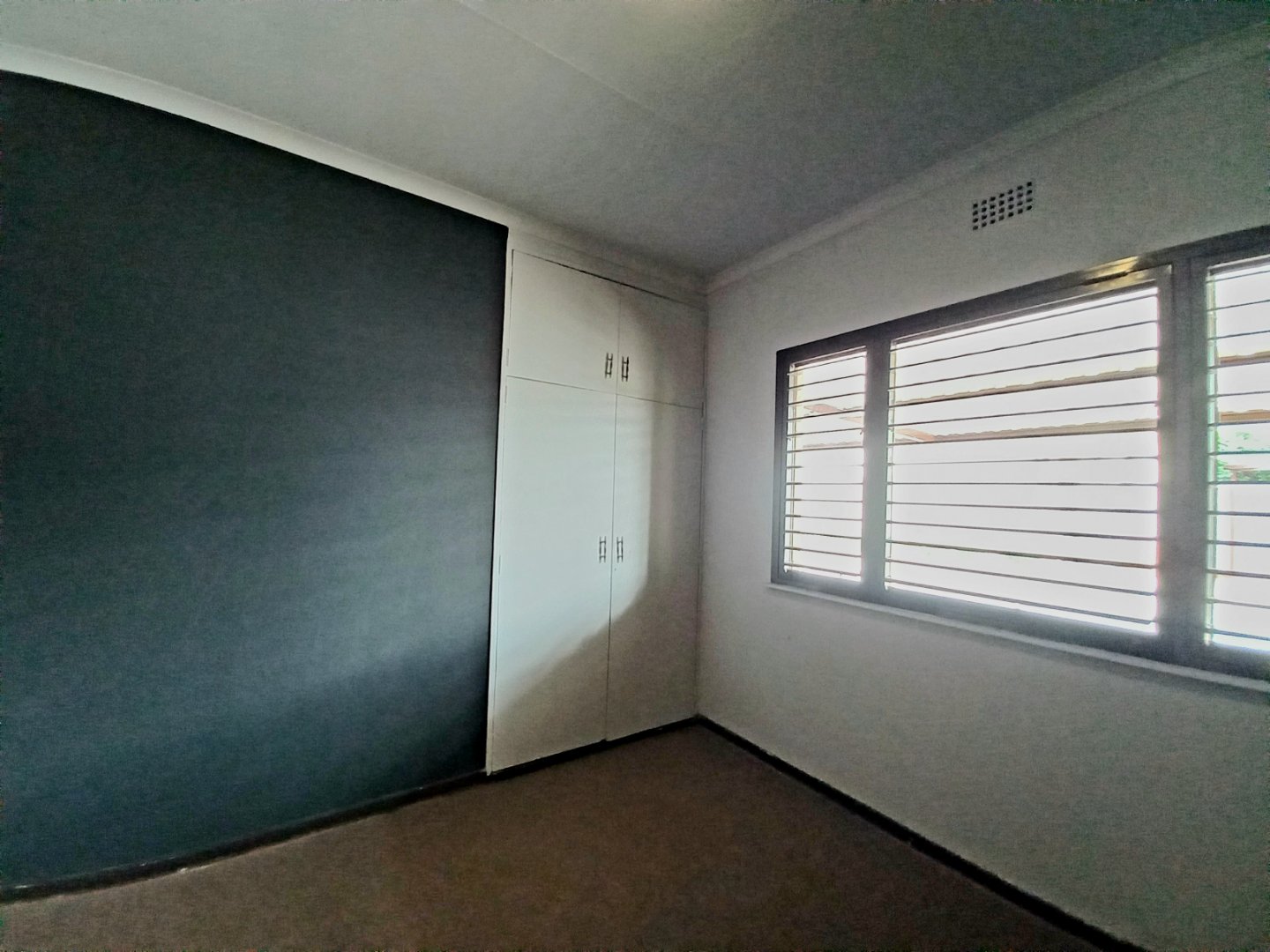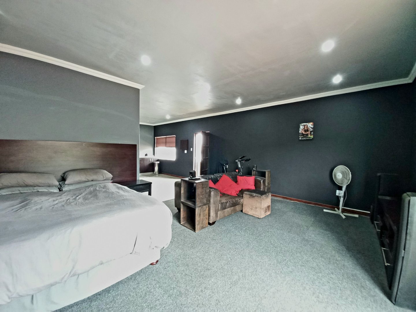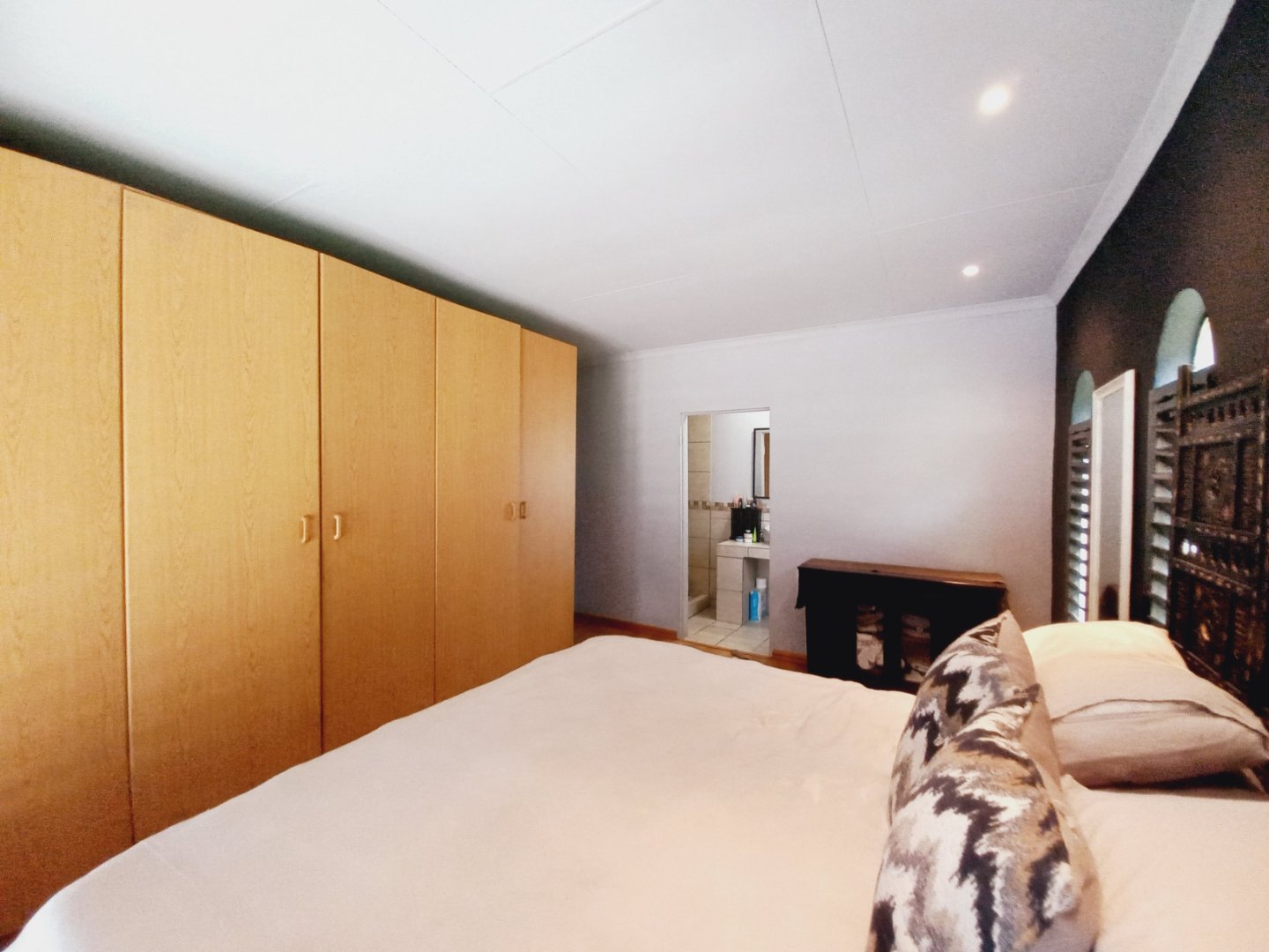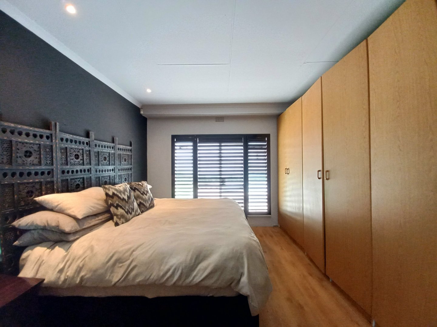 Main bedroom with laminated floors, ample cupboards, blinds, and ensuite bathroom