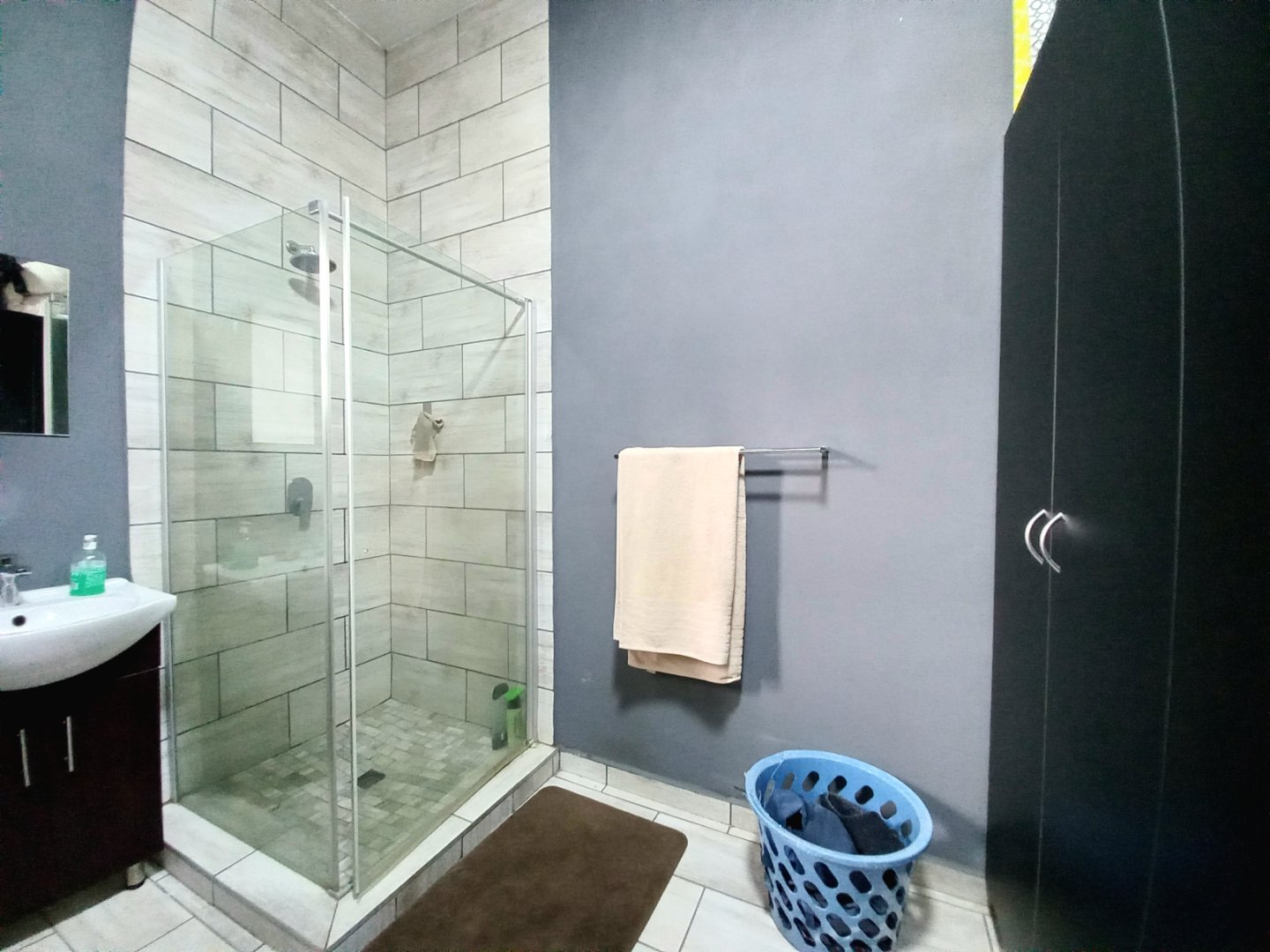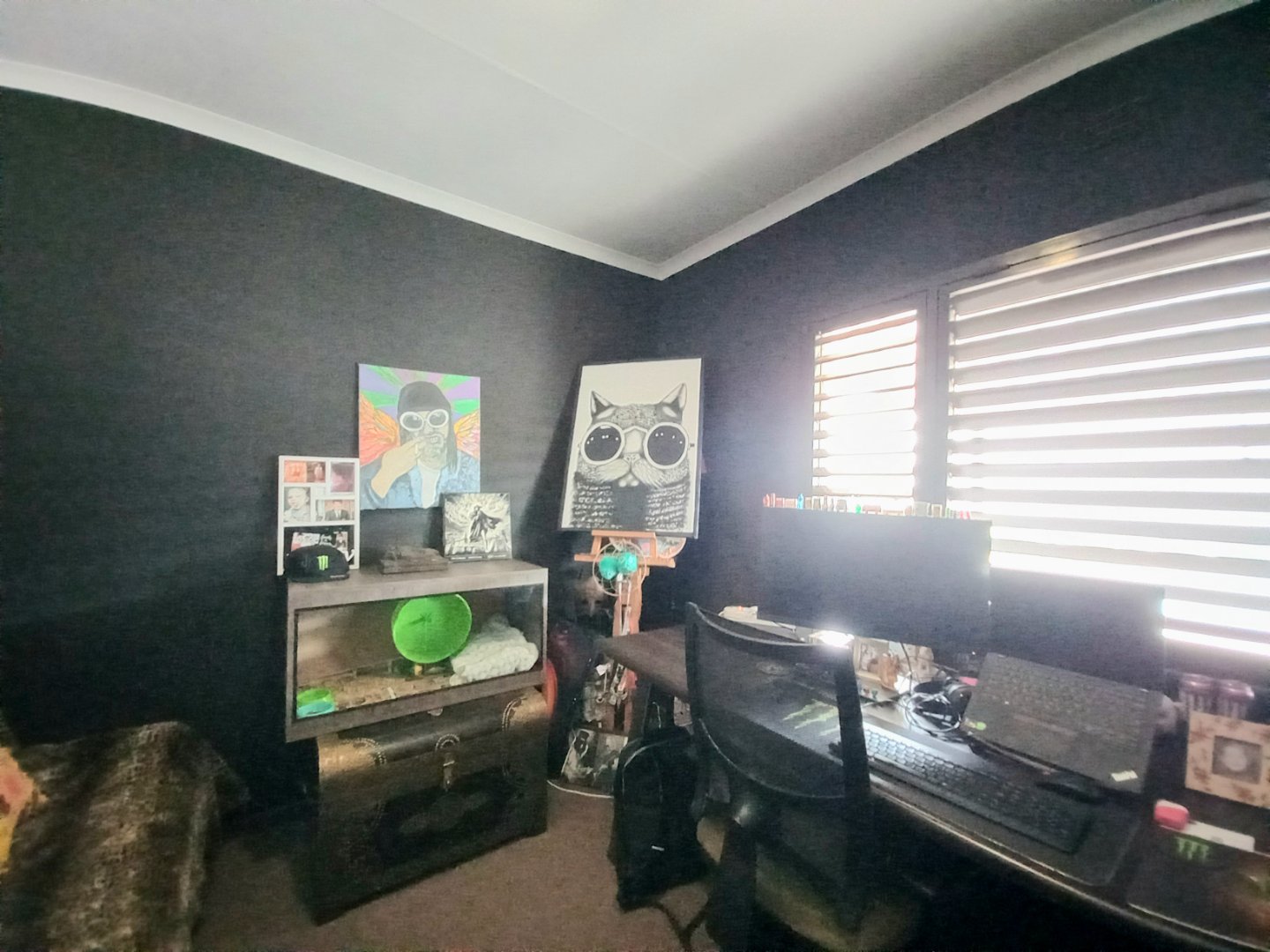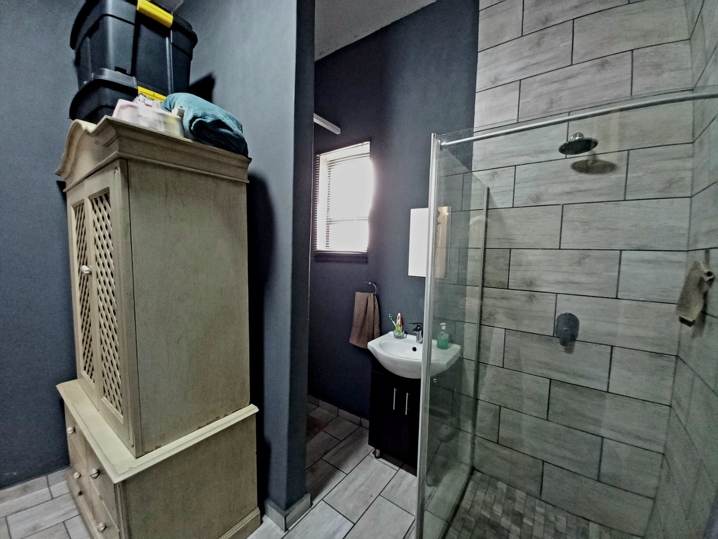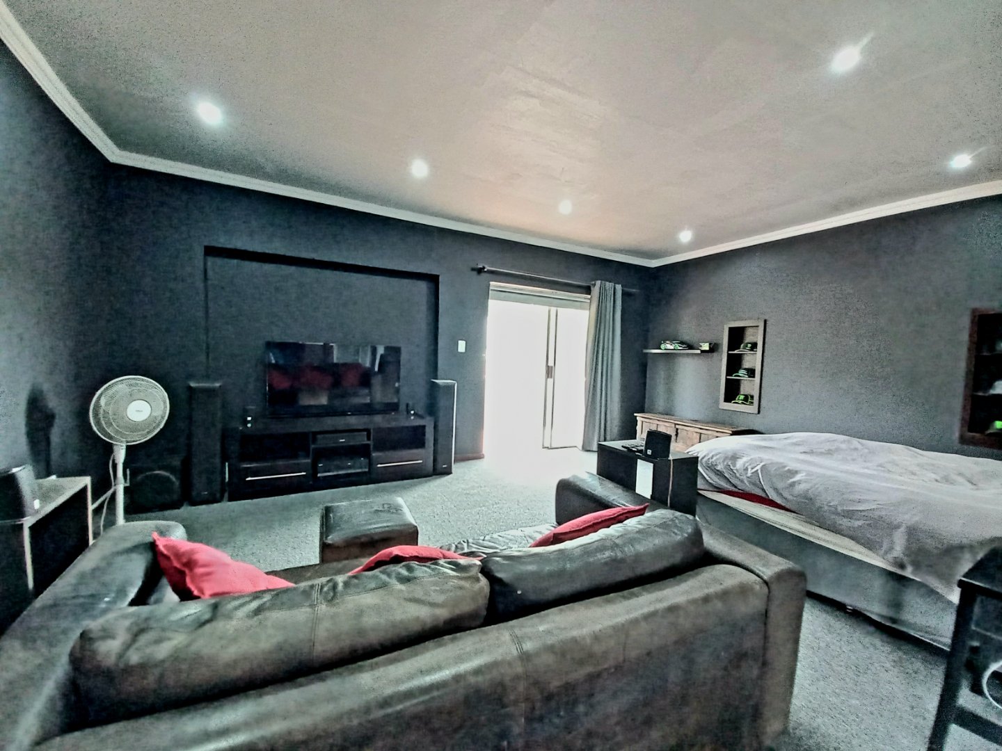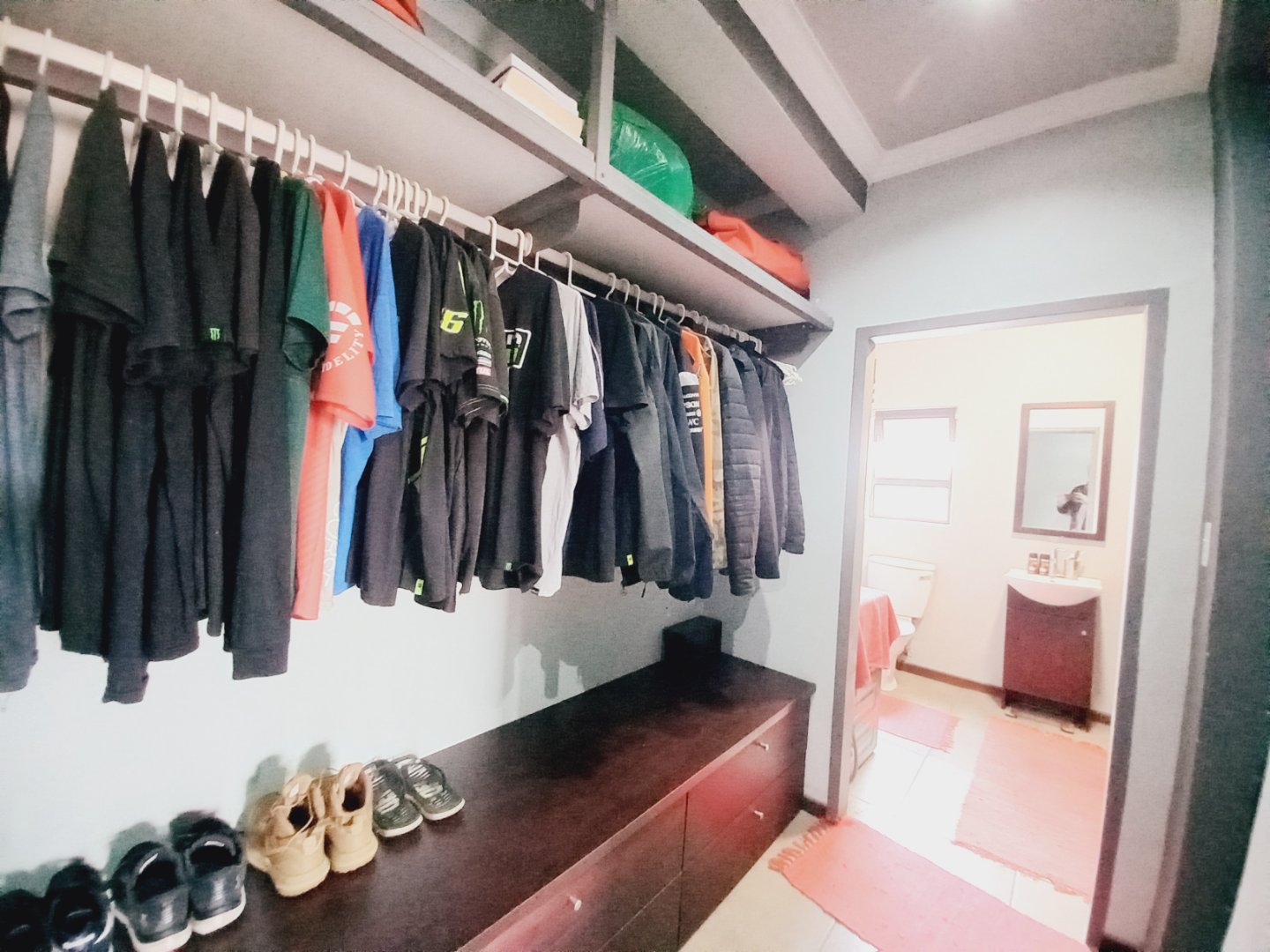 Main bedroom with laminated floors, ample cupboards, blinds, and ensuite bathroom